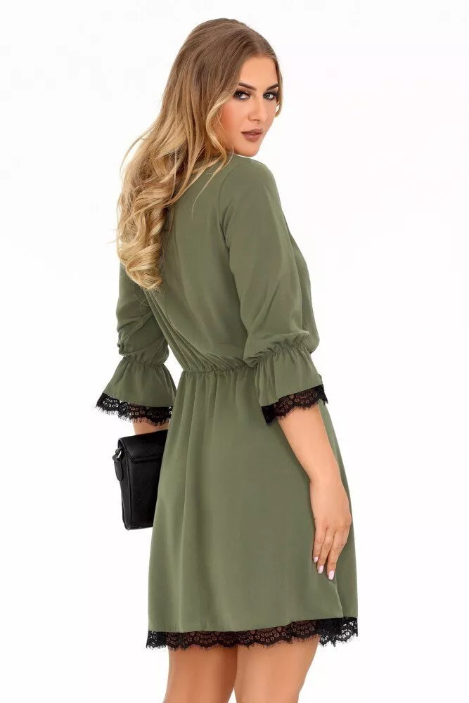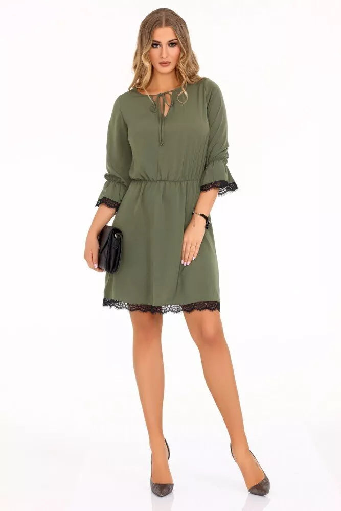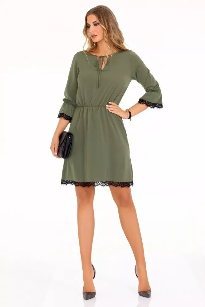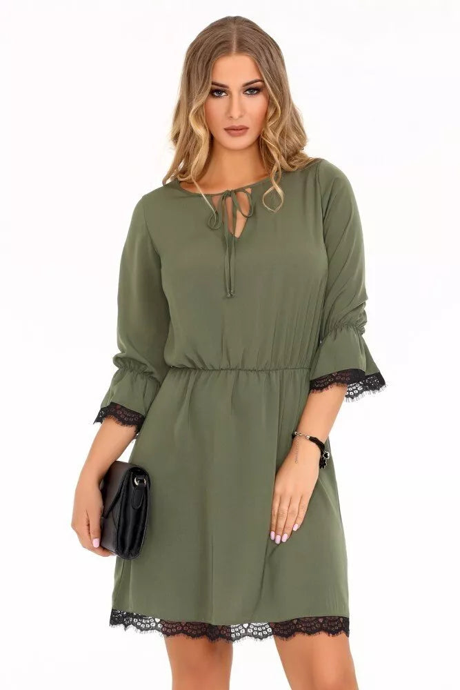 Marribel chaki spalvos suknelė Shanice dekoruota juodais neriniais, suraukimas ties juosmeniu, 3/4-čių rankovės, surišama iškirpte. Suknelės ilgis iki kelių, su raukiniais, aukštu kaklu. Suknelės audinys elastingas ir patogus. Suknelės matmenys pateikti paskutinėje prekės nuotraukoje.