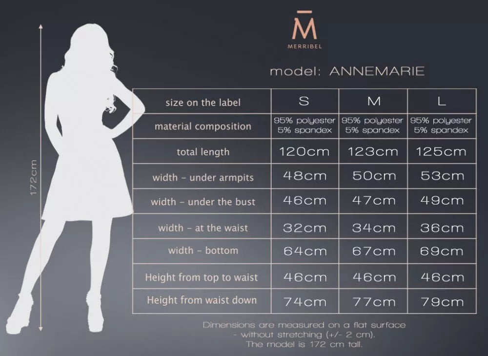 Marribel gelėta ilga suknelė Annemarie su gėlių žiedų raštais. Suknelės ilgis žemiau kelių, ties liemeniu suraukimas. Suknelės audinys elastingas ir patogus. Suknelės matmenys pateikti paskutinėje prekės nuotraukoje.
