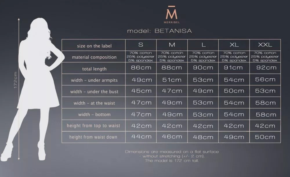 Marribel melsva medvilninė, džinso spalvos, suknelė Betanisa dekoruota juodo tiulo perregimom 3/4'čių rankovėm. Suknelės ilgis virš kelių. Suknelės audinys elastingas ir patogus. Suknelės matmenys pateikti paskutinėje prekės nuotraukoje.