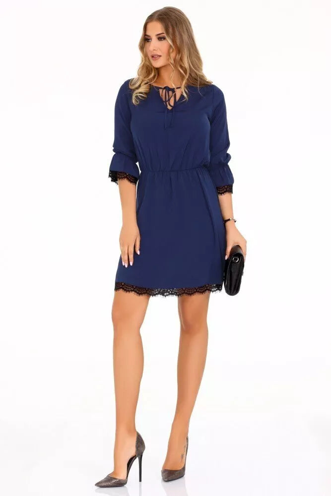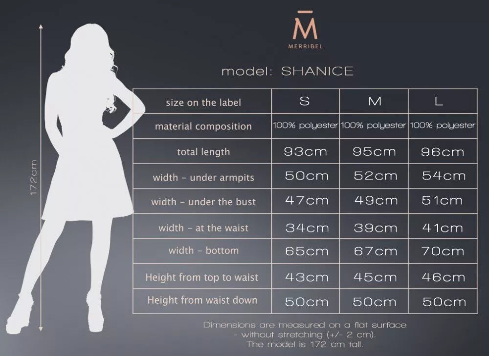 Marribel tamsiai mėlyna suknelė Shanice dekoruota juodais neriniais, suraukimas ties juosmeniu, 3/4-čių rankovės, surišama iškirpte. Suknelės ilgis iki kelių, su raukiniais, aukštu kaklu. Suknelės audinys elastingas ir patogus. Suknelės matmenys pateikti paskutinėje prekės nuotraukoje.
