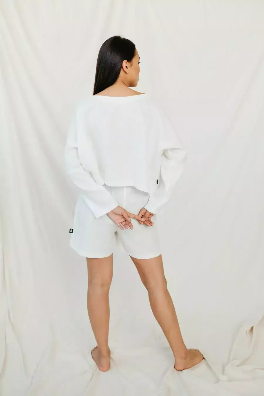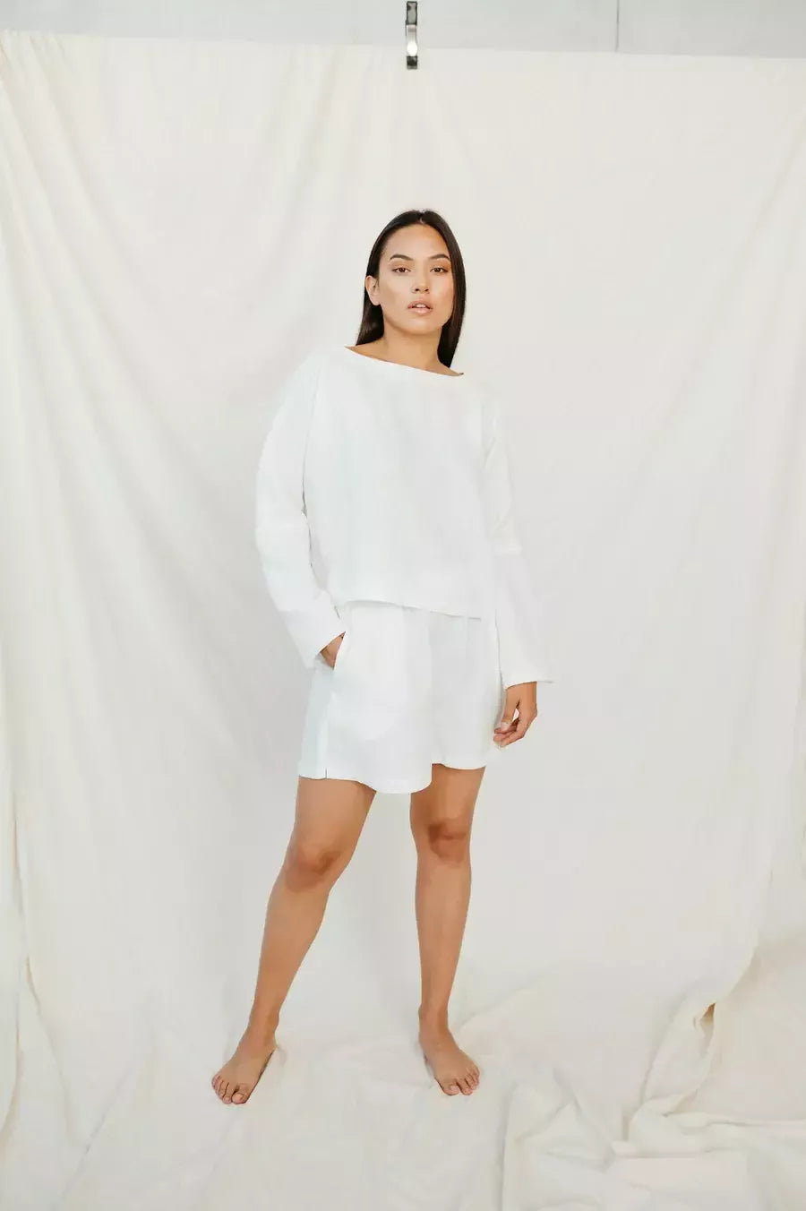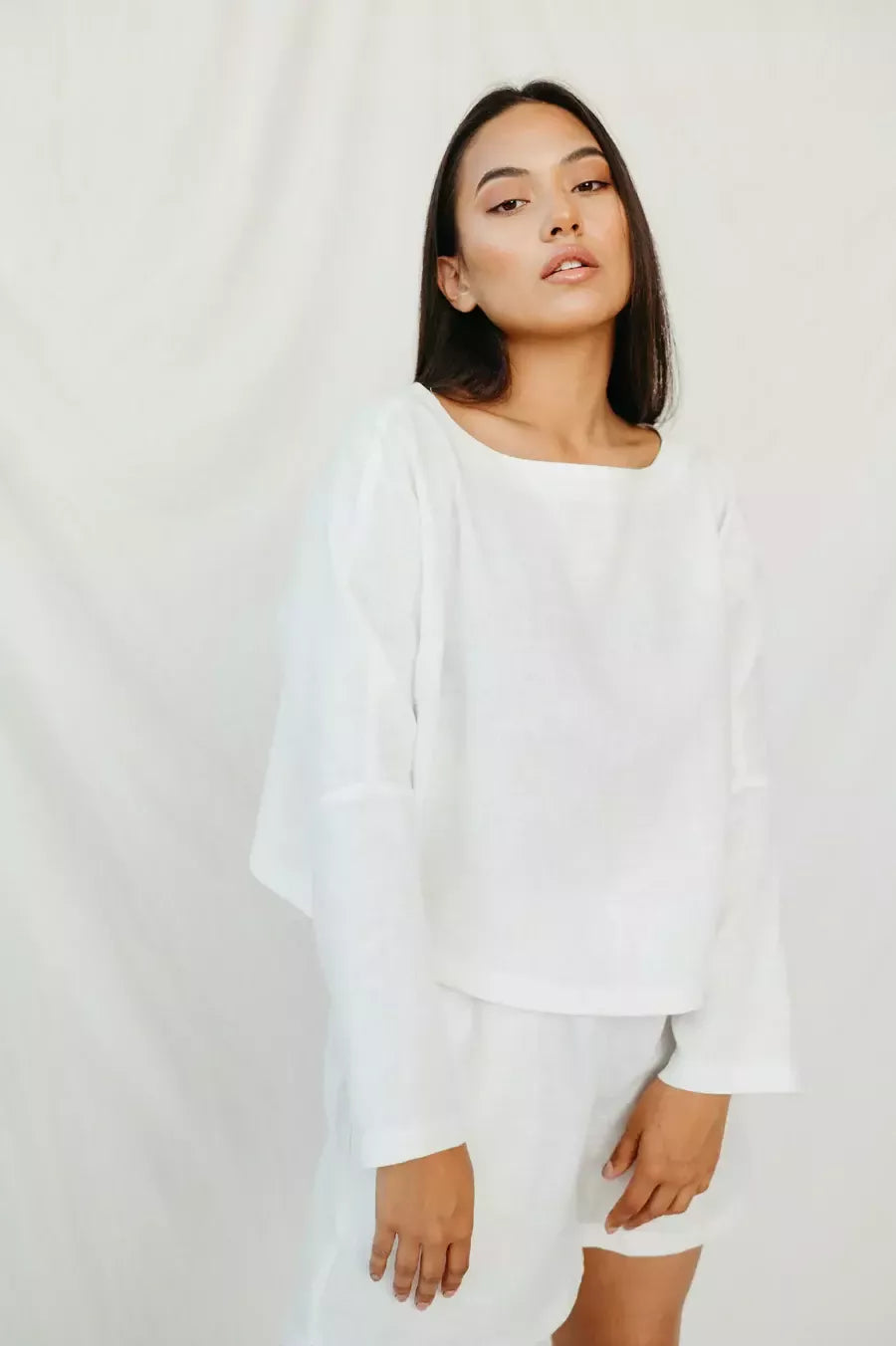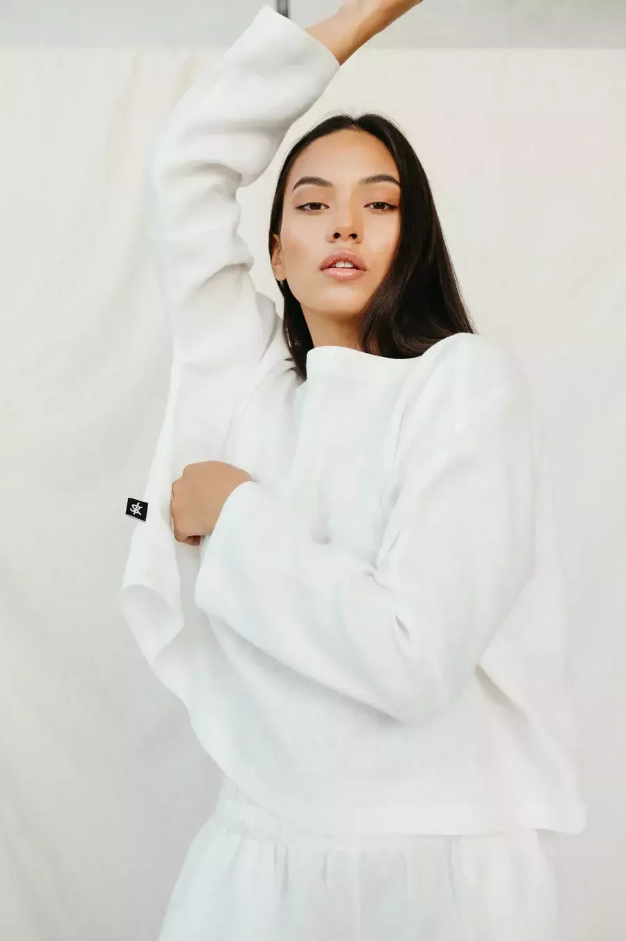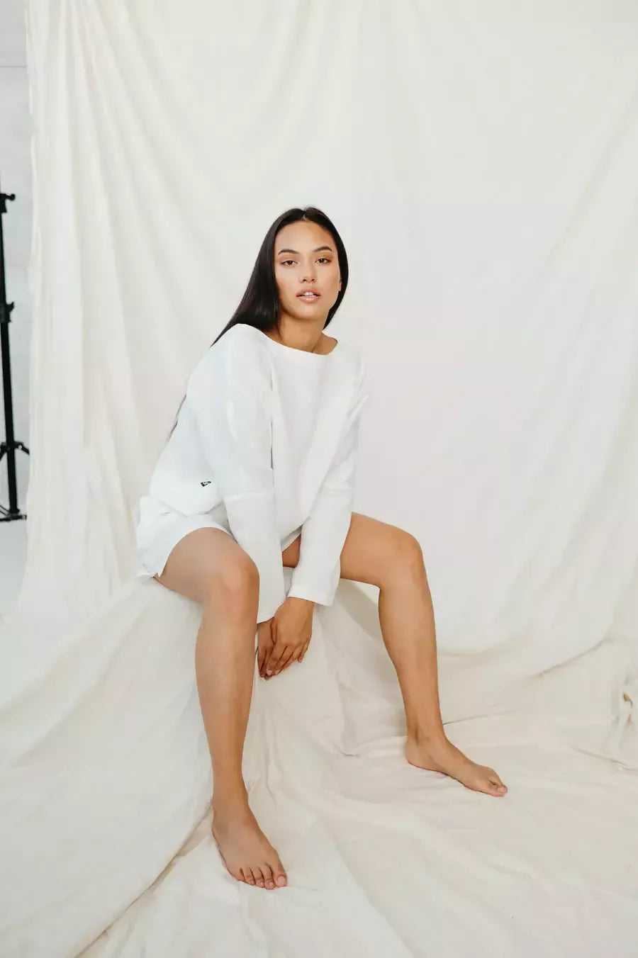 Laisvi marškinėliai pasiūti iš natūralaus neperregimo minkštinto švelnios baltos spalvos lino, storis 220 g/m2, lengvai skalbiasi ir nėra linkęs glamžytis. Marškinėliai ilgomis rankovėmis, atvirais krentančiais pečiais, lengvi ir vasariški. Sudėtis 100% linas. Gamintojas SofaKiller, pagaminta Lietuvoje. Esant klausimam ar individualaus užsakymo poreikiui prašome susisiekti.