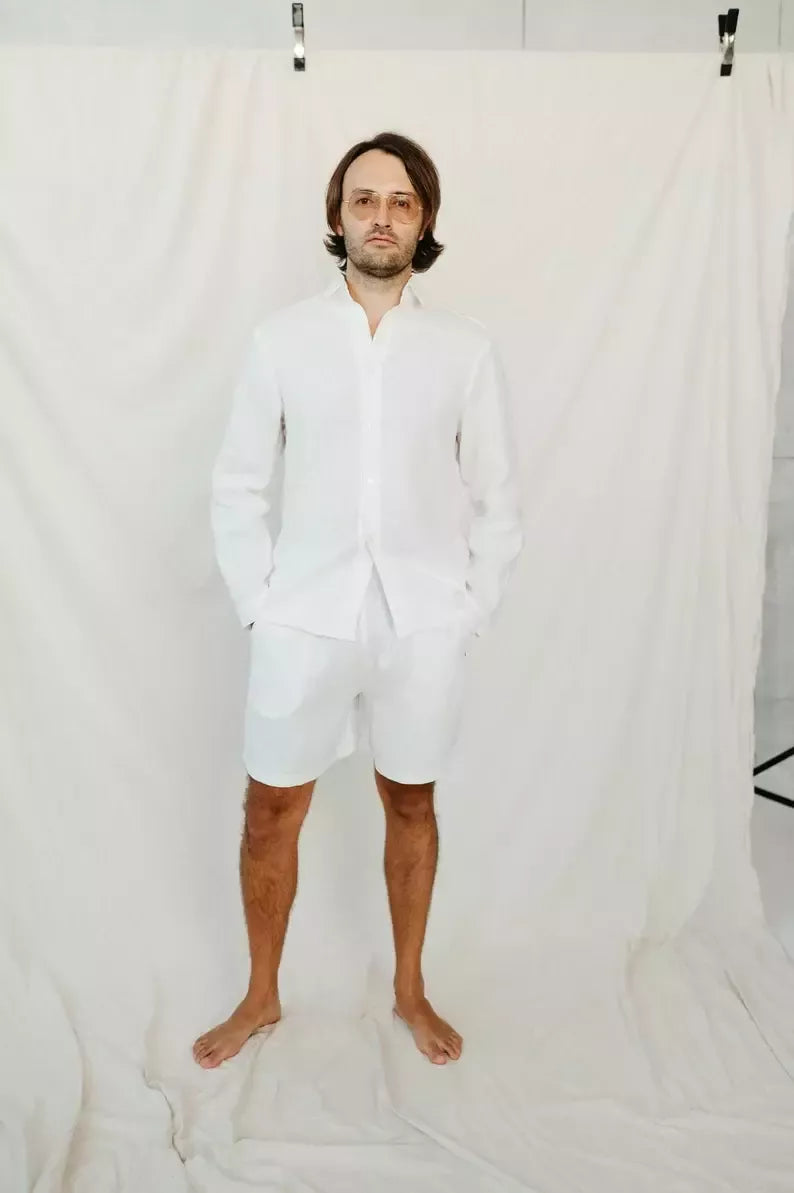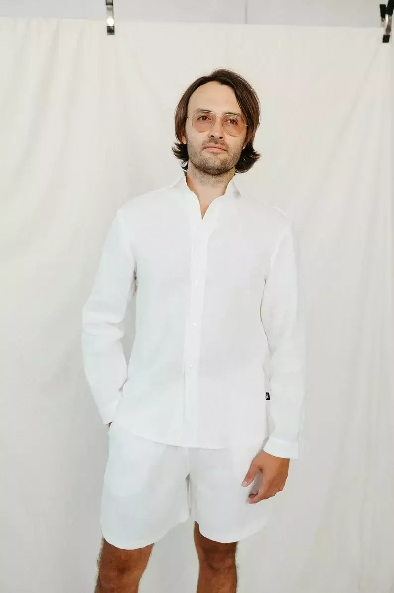 Sofa Killer baltos splavos lininiai vyriški marškiniai, susegami priekyje, klasikine apykakle, galite atsiraitoti rankoves. Minkštinto lino medžiaga švelni ir jauki, sukuria įpatingą lengvumo jausmą ir norą vilkėti marškinius nuolat. Sofa Killer vyriški lininiai marškiniai nevaržo judesių, tad puikiai tinka patogiam poilsiui ar šventei. Dekoruota Sofa Killer logotipu šone.
