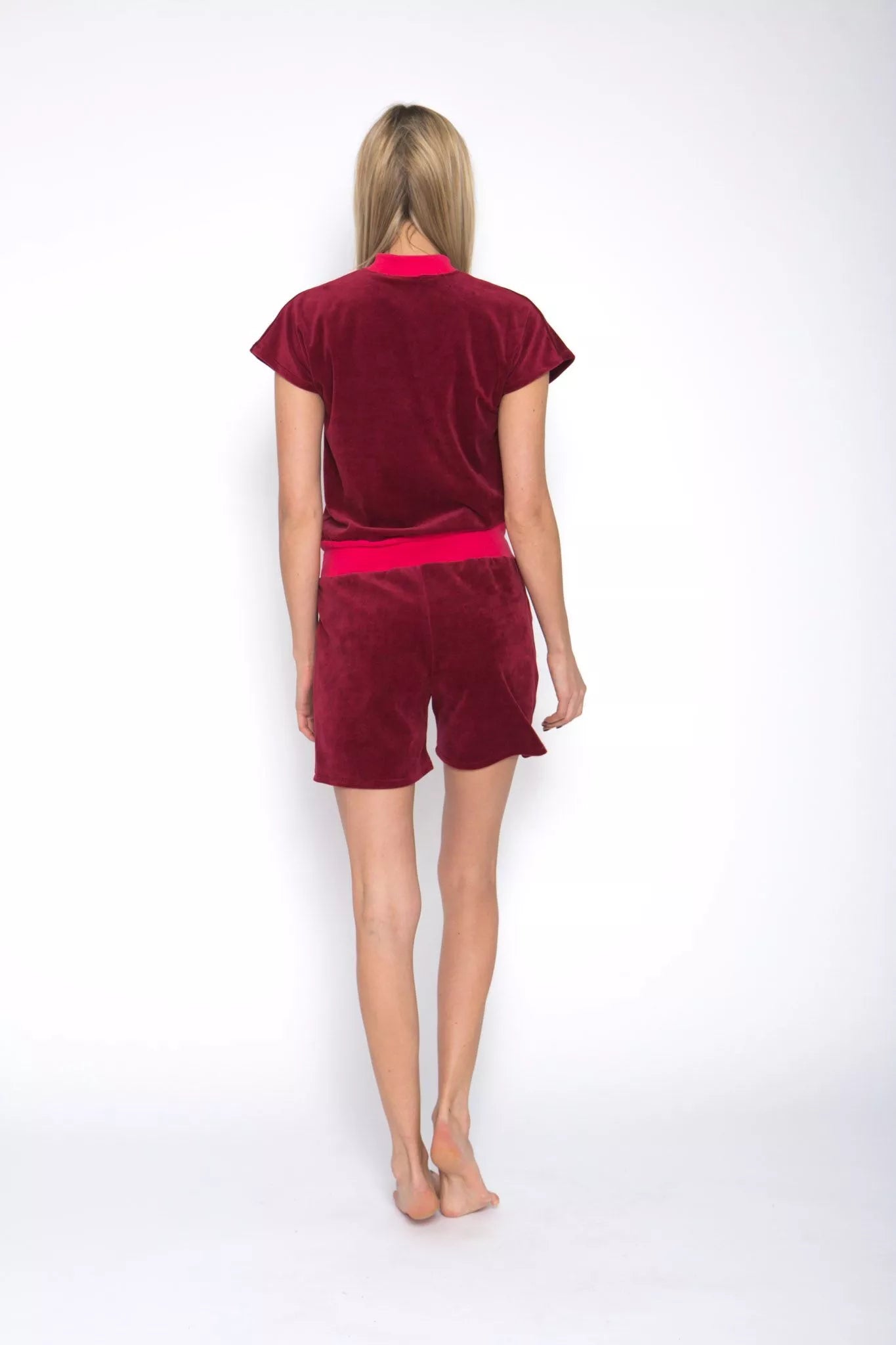 Sofa Killer bordo spalvos vveliūrinis vasarinis, trumpom rankovėm ir šortų tipo kombinezonas su oranžinės spalvos rankogaliais. Su užtrauktuku ir kišenėmis priekyje, per juosmenį susiaurinta rankogaliu. Medžiaga švelni ir jauki, sukuria įpatingą šilumos jausmą ir norą vilkėti kombinezoną nuolat. Sofa Killer kombinezonų modeliai nevaržo judesių, tad puikiai tinka tiek pasyviam tiek aktyviam poilsiui. Galite rinktis iš plačios dydžių skalės, o pats rūbas tradiciškai turi būti laisvas, tad kiek didesnis dydis puikiai tiks. Dekoruota Sofa Killer logotipu po kišene.