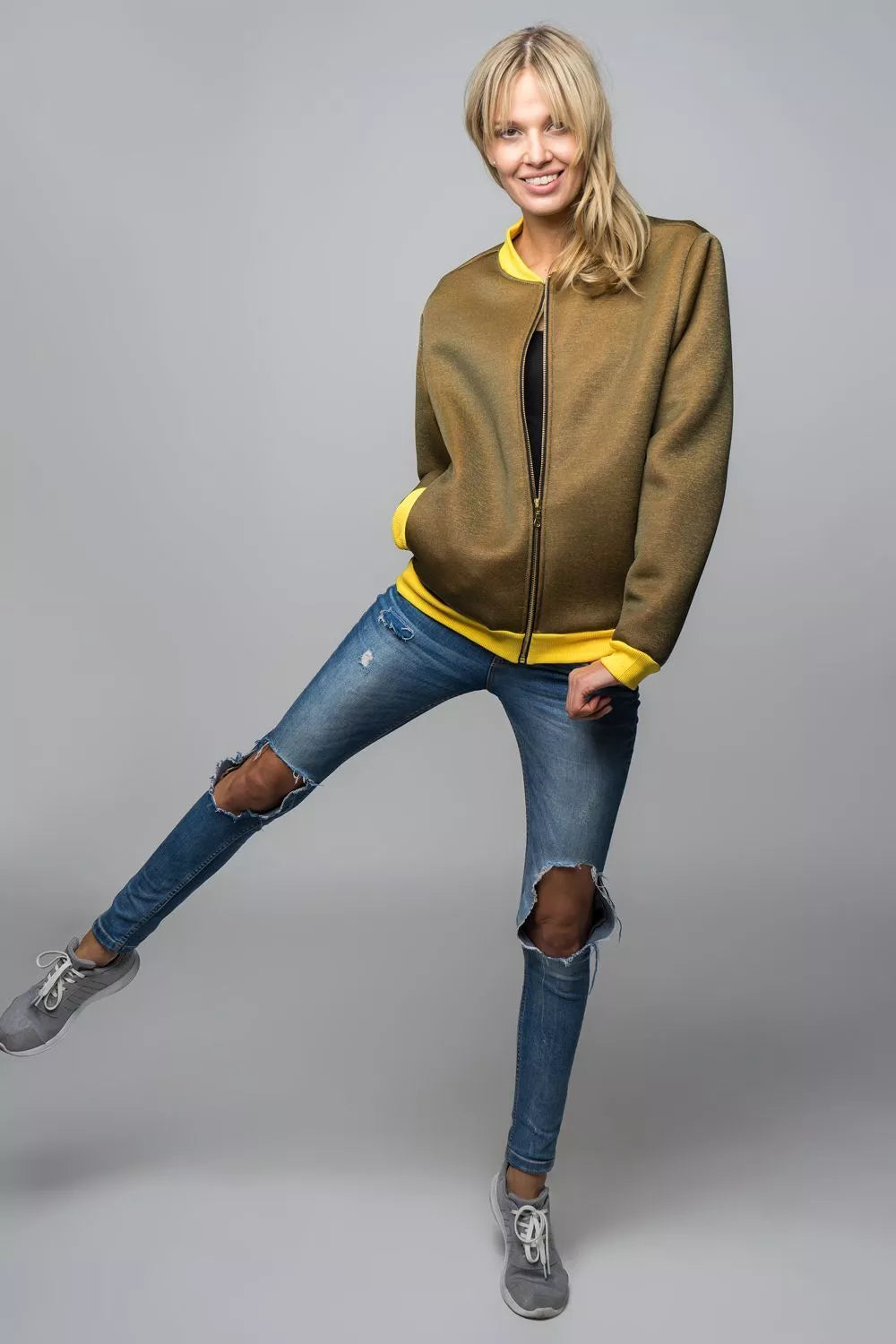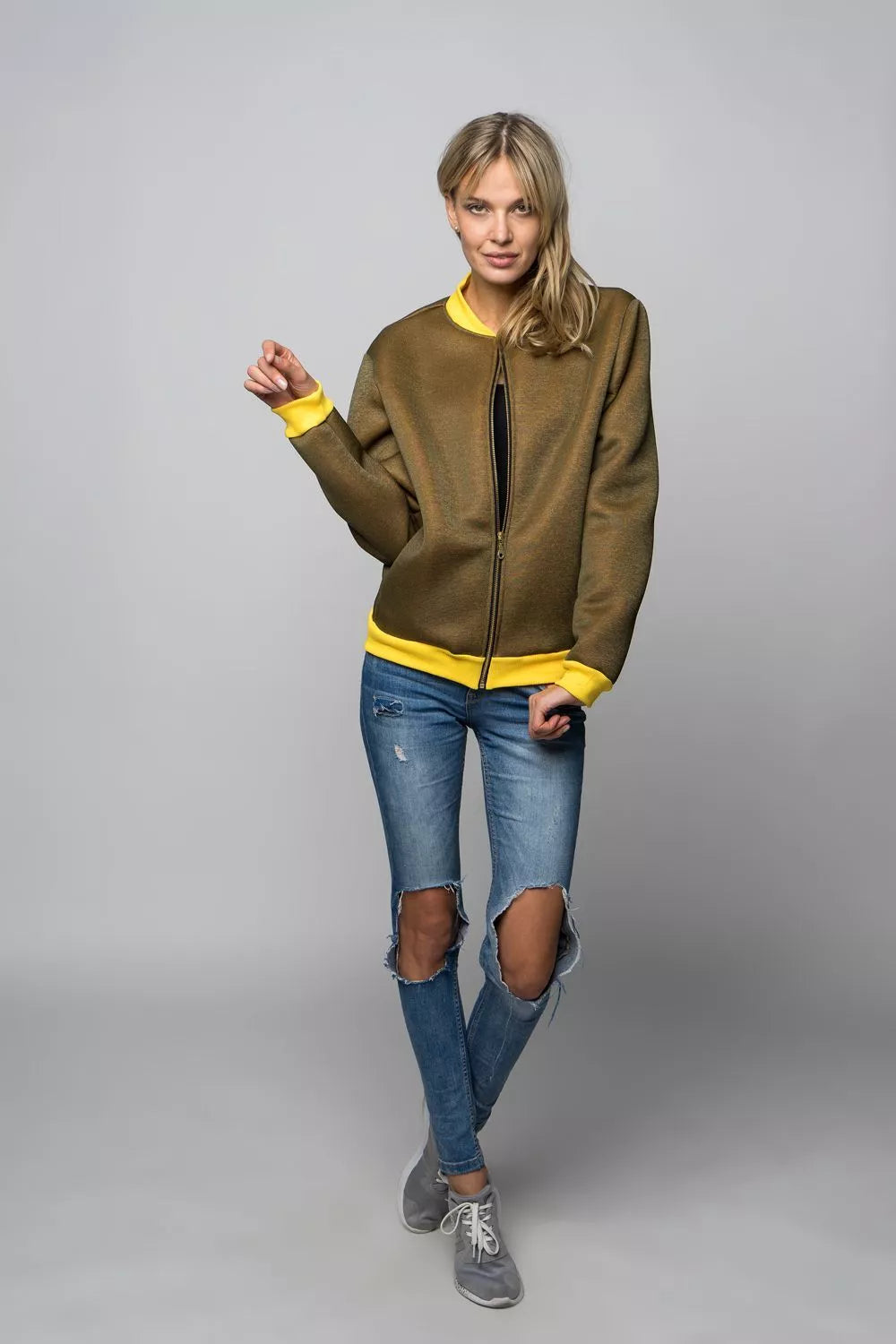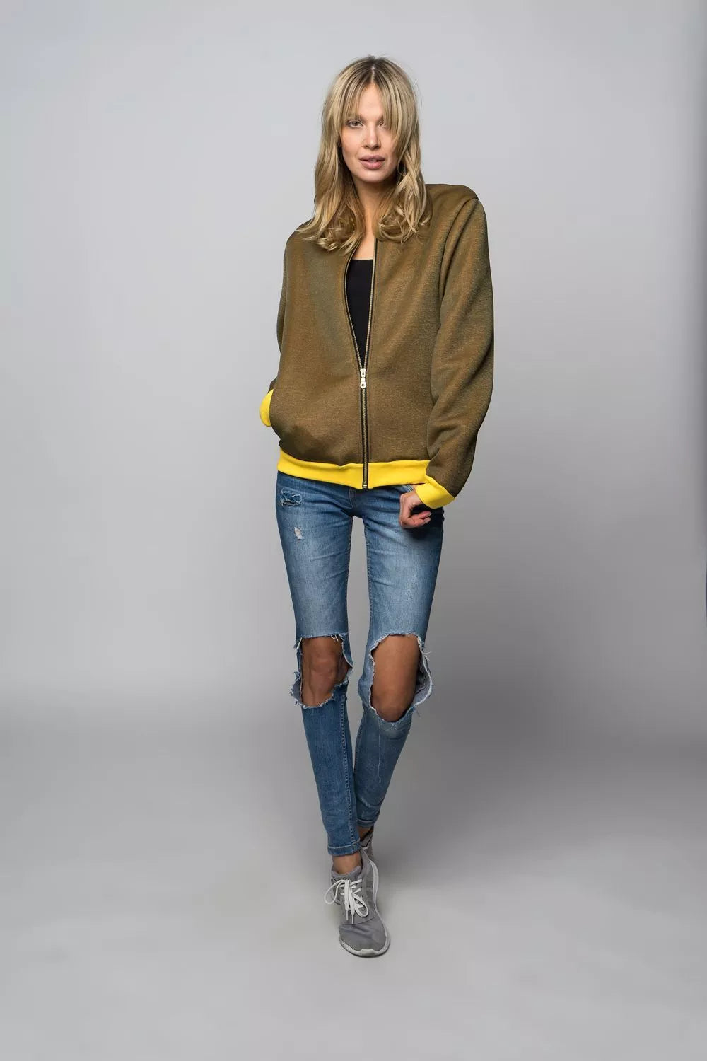 Sofa Killer garstyčių spalvos moteriškas bomberis su geltonais rankogaliais, šonuose kišenės, pasiūtas iš standaus ir minkšto polipropeleno. Galite rinktis iš plačios dydžių skalės, o pats rūbas tradiciškai turi būti laisvas, tad kiek didesnis dydis puikiai tiks.