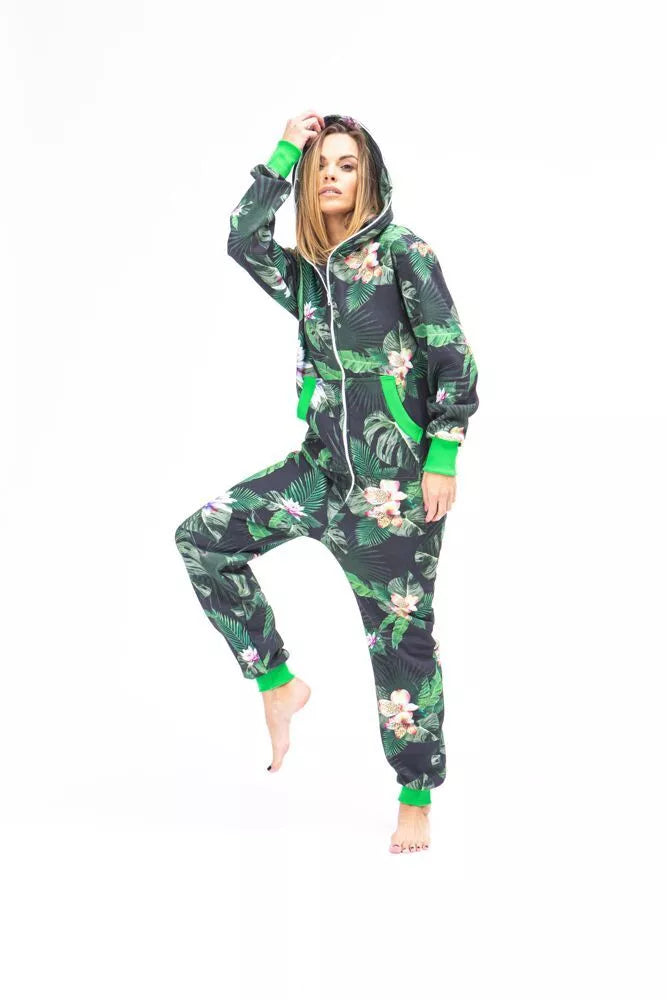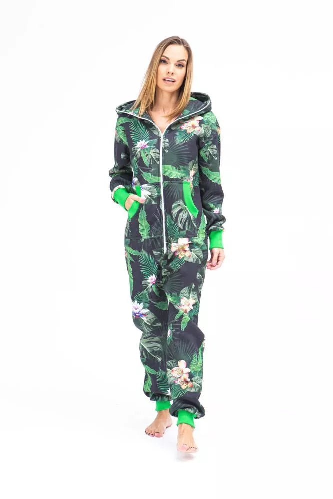 Sofa Killer gelėtas kombinezonas Tropical su gėlių, palmių, žiedų ir augalų printu, skirtas tiek vyrams tiek moterims. Priekyje kišenės apsiūtos salotinių rankogalių medžiaga. Medžiagos vidinė dalis su tankiu pūkeliu, kuris sukuria įpatingą šilumos jausmą ir norą vilkėti kombinezoną nuolat. Sofa Killer kombinezonų modeliai nevaržo judesių, tad puikiai tinka tiek pasyviam tiek aktyviam poilsiui, net miegui. Galite rinktis iš plačios dydžių skalės, o pats rūbas tradiciškai turi būti laisvas, tad kiek didesnis dydis puikiai tiks. Dekoruota Sofa Killer logotipu išsiuvinėtu ant krūtinės.