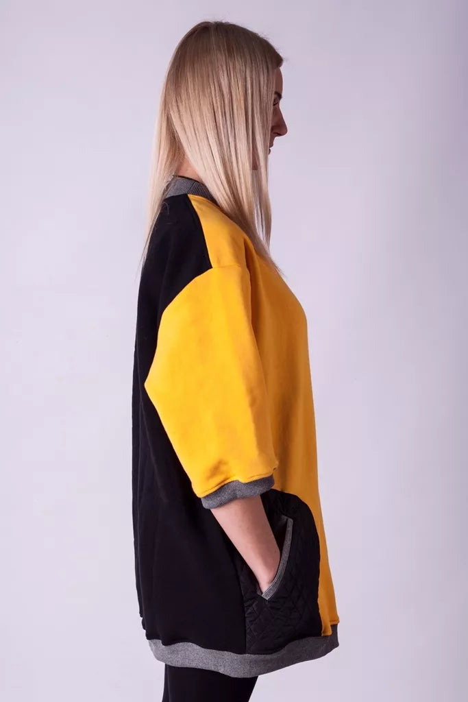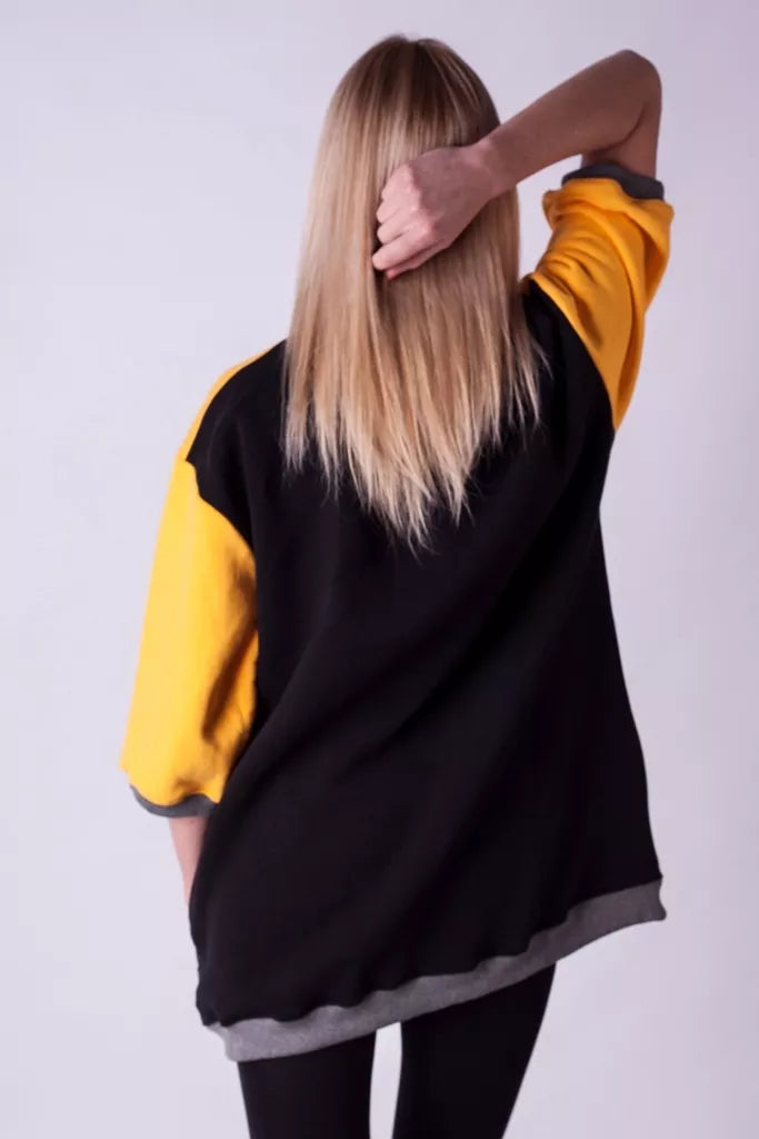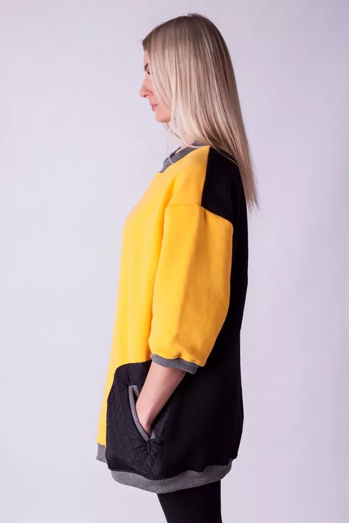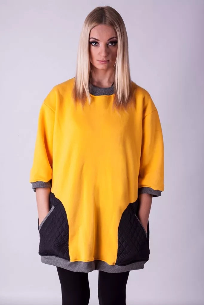 Šiltas jaukus geltonos spalvos džemperis su juodos dygsniuotos medžiagos kišenėmis ir juoda nugara, puikiai tiks kaip suknelė. Medžiagos vidinė dalis su tankiu pūkeliu, kuris sukuria įpatingą šilumos jausmą ir norą vilkėti džemperį nuolat. Sofa Killer džemperių modeliai nevaržo judesių, tad puikiai tinka tiek pasyviam tiek aktyviam poilsiui. Rankovės trijų ketvirčių ilgio Galite rinktis iš plačios dydžių skalės, o pats rūbas tradiciškai turi būti laisvas, tad kiek didesnis dydis puikiai tiks.