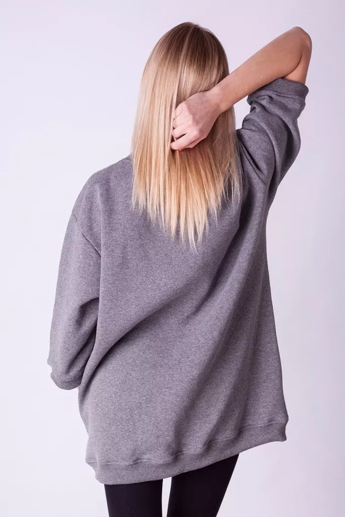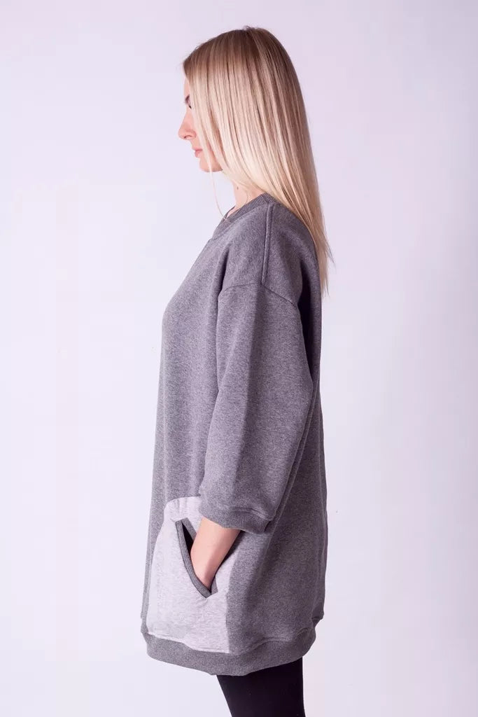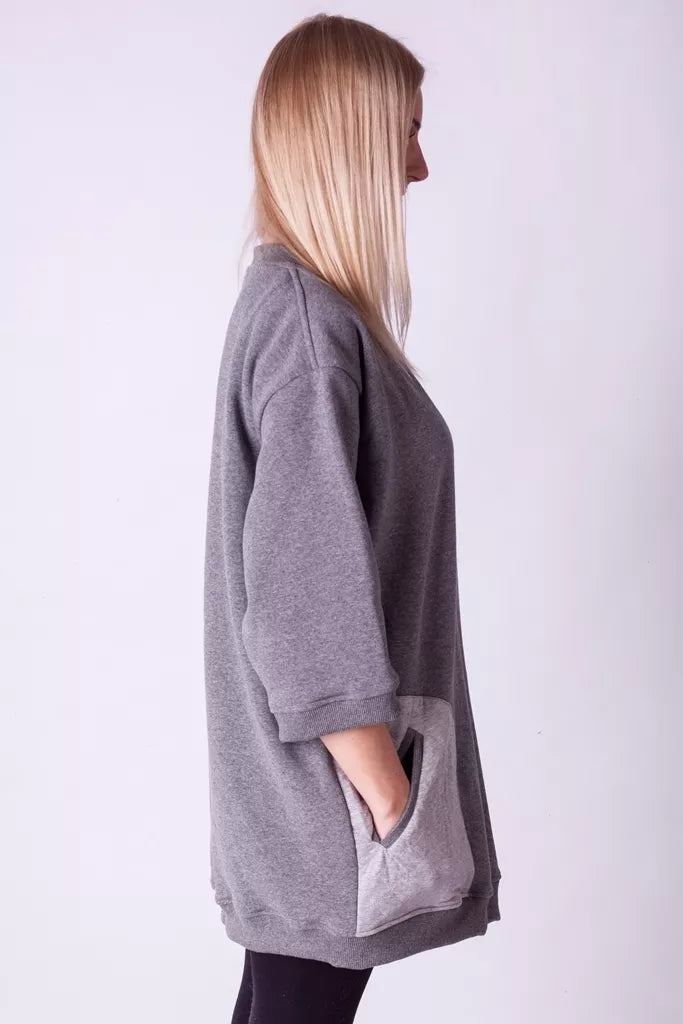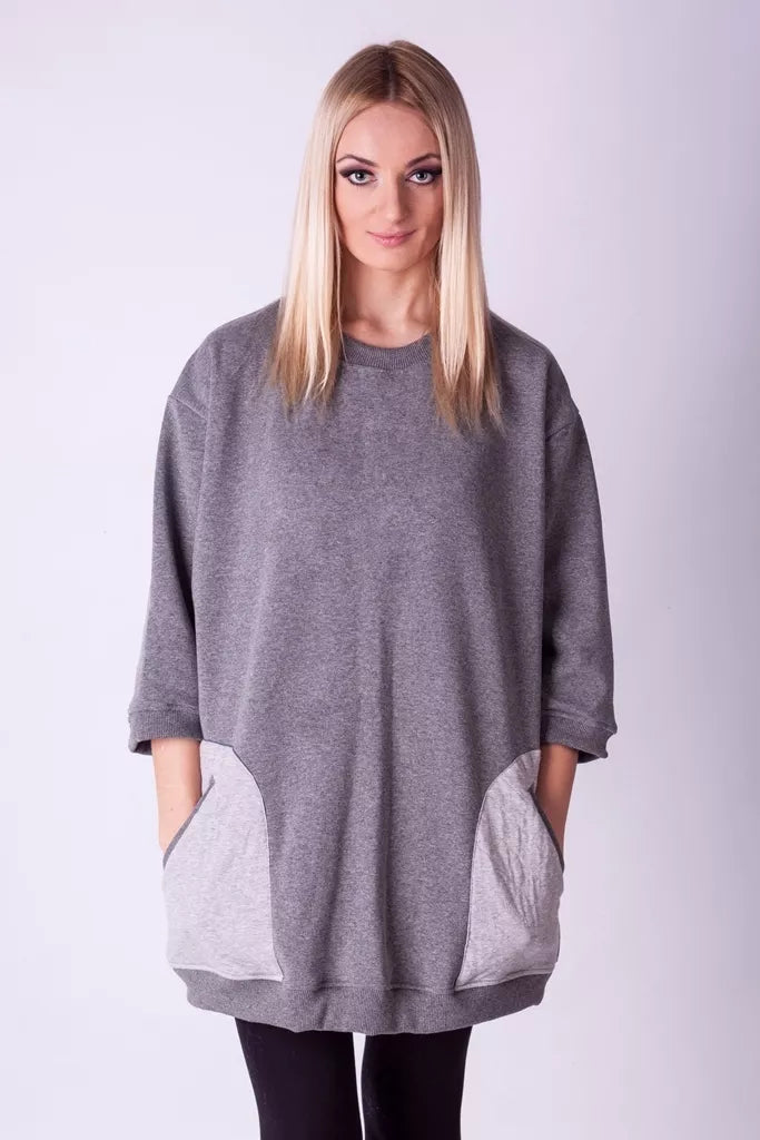 Šiltas jaukus grafito spalvos džemperis su pilkos dygsniuotos medžiagos kišenėmis, puikiai tiks kaip suknelė. Medžiagos vidinė dalis su tankiu pūkeliu, kuris sukuria įpatingą šilumos jausmą ir norą vilkėti džemperį nuolat. Sofa Killer džemperių modeliai nevaržo judesių, tad puikiai tinka tiek pasyviam tiek aktyviam poilsiui. Rankovės trijų ketvirčių ilgio Galite rinktis iš plačios dydžių skalės, o pats rūbas tradiciškai turi būti laisvas, tad kiek didesnis dydis puikiai tiks.