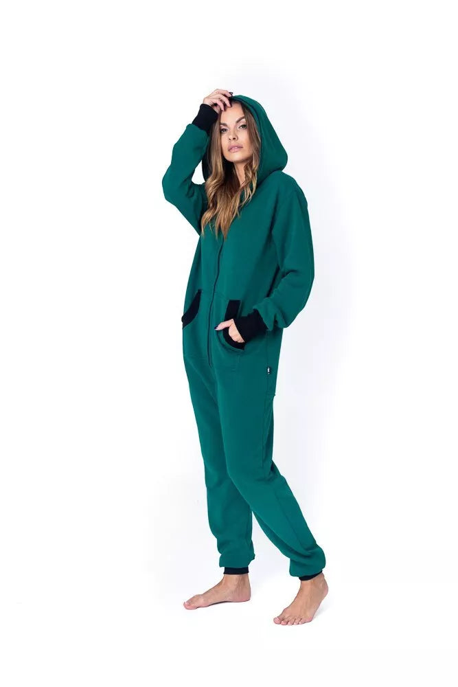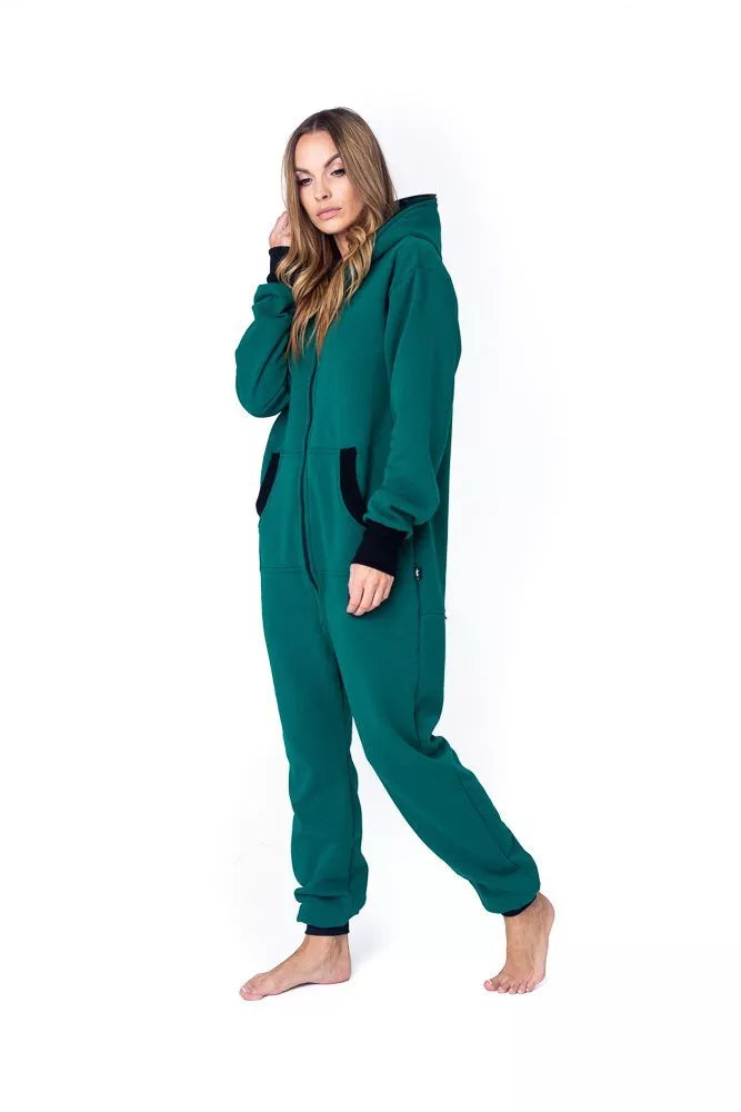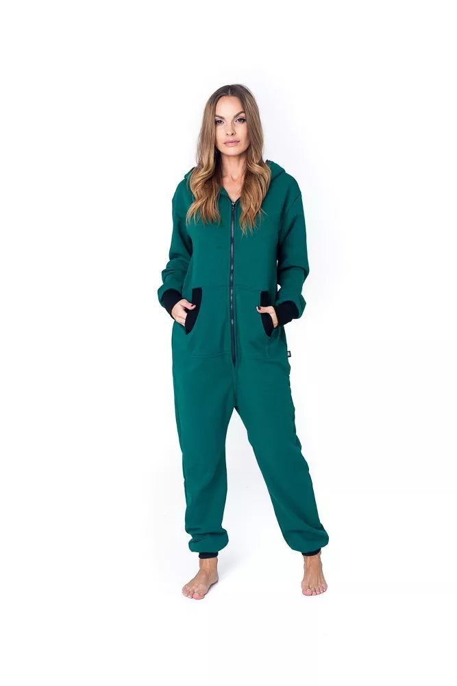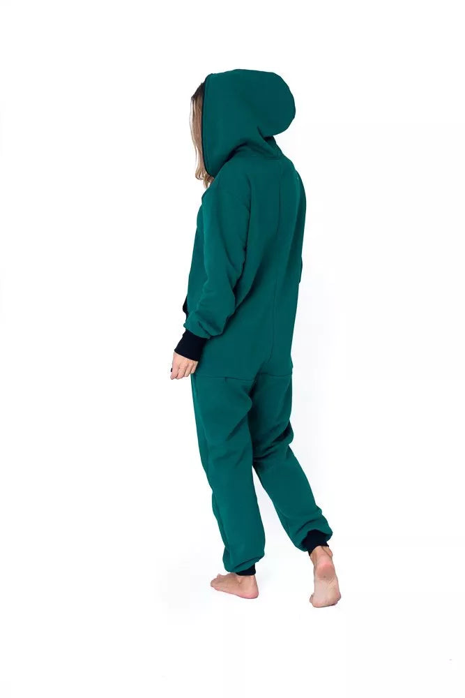 Šiltas jaukus tamsiai žalias (haki) kombinezonas su juodais rankogaliais ir juodu užtrauktuku bei papildomu užtrauktuku nugaroje, skirtas tiek vyrams tiek moterims. Priekyje kišenės apsiūtos juoda rankogalių medžiaga. Medžiagos vidinė dalis su tankiu pūkeliu, kuris sukuria įpatingą šilumos jausmą ir norą vilkėti kombinezoną nuolat. Sofa Killer kombinezonų modeliai nevaržo judesių, tad puikiai tinka tiek pasyviam tiek aktyviam poilsiui, net miegui. Galite rinktis iš plačios dydžių skalės, o pats rūbas tradiciškai turi būti laisvas, tad kiek didesnis dydis puikiai tiks. Dekoruotas Sofa KIller logotipu išsiuvinėtu ant krūtinės.