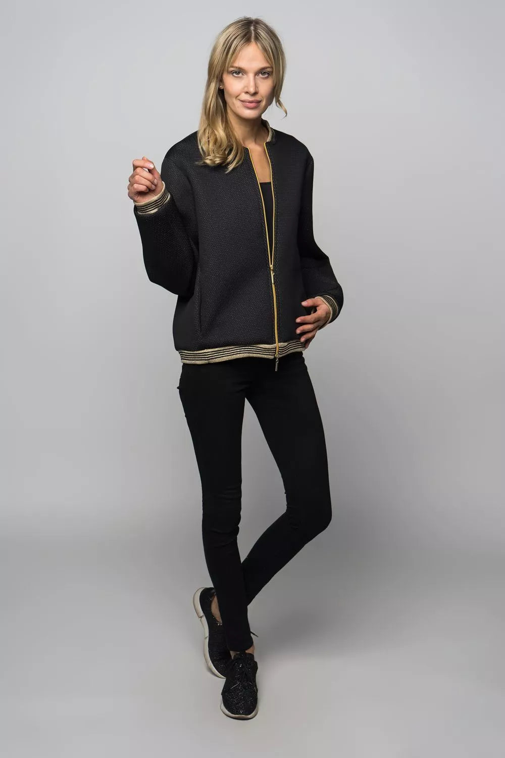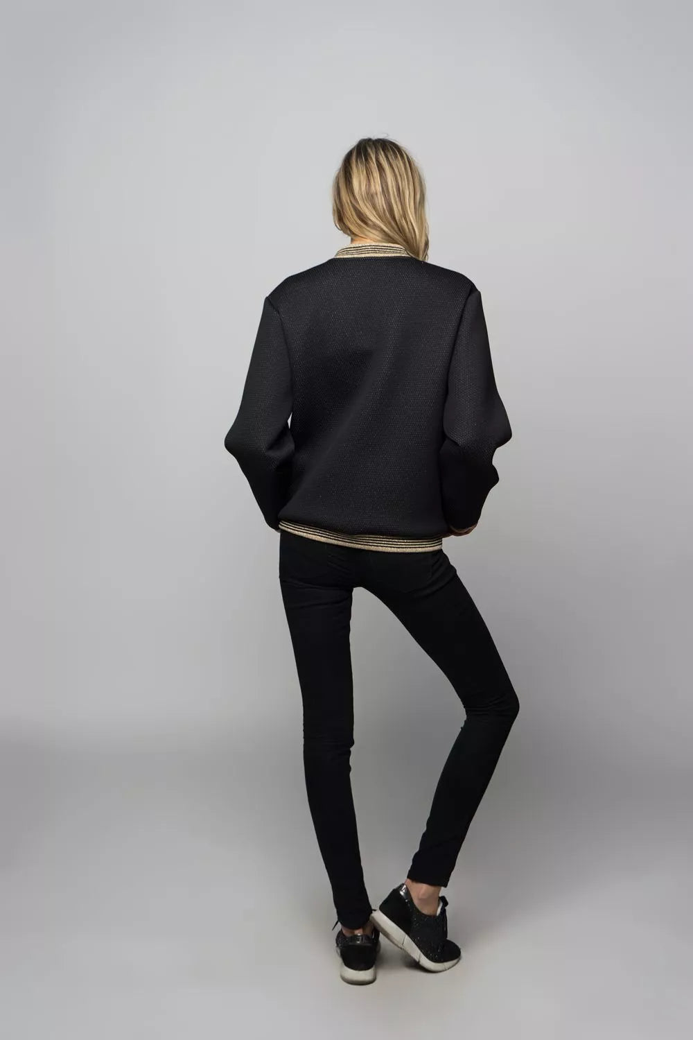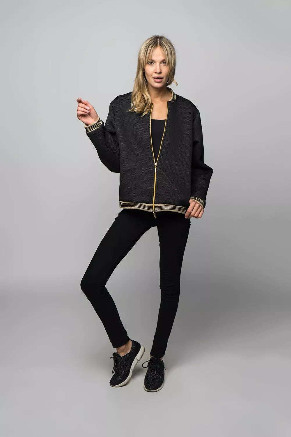 Sofa Killer juodas blizgus moteriškas bomberis su aukso spalvos rankogaliais, šonuose kišenės, pasiūtas iš standaus ir minkšto polipropeleno. Galite rinktis iš plačios dydžių skalės, o pats rūbas tradiciškai turi būti laisvas, tad kiek didesnis dydis puikiai tiks.
