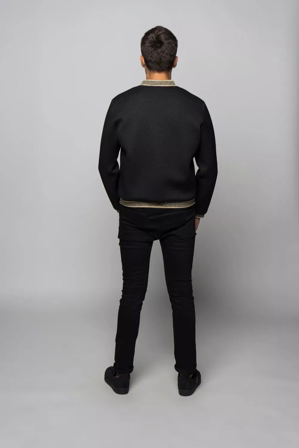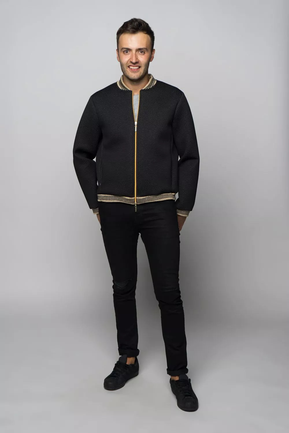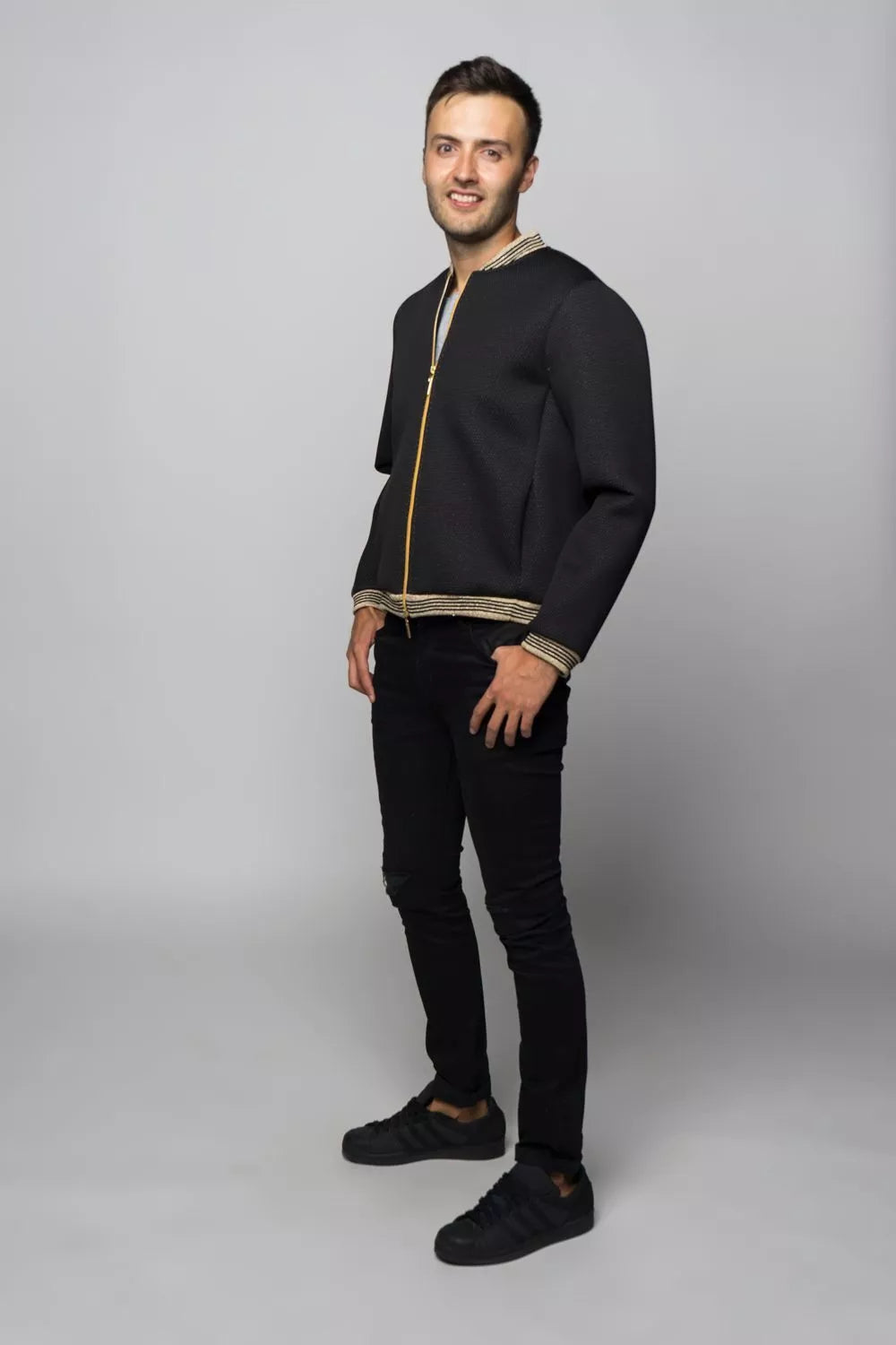 Sofa Killer juodas blizgus vyriškas bomberis su aukso spalvos rankogaliais, šonuose kišenės, pasiūtas iš standaus ir minkšto polipropeleno. Galite rinktis iš plačios dydžių skalės, o pats rūbas tradiciškai turi būti laisvas, tad kiek didesnis dydis puikiai tiks.