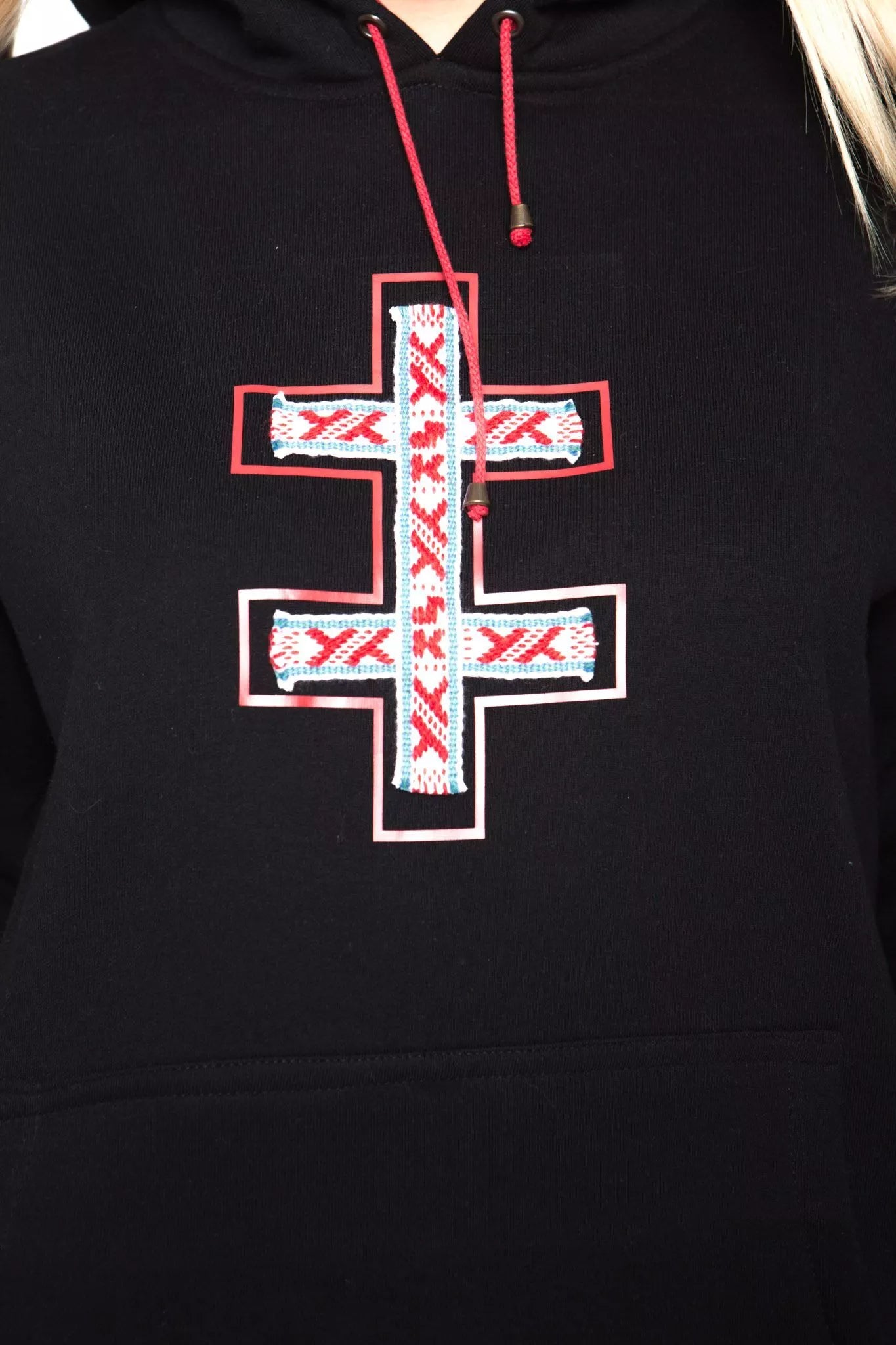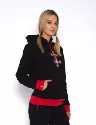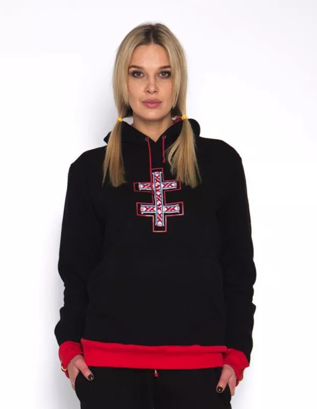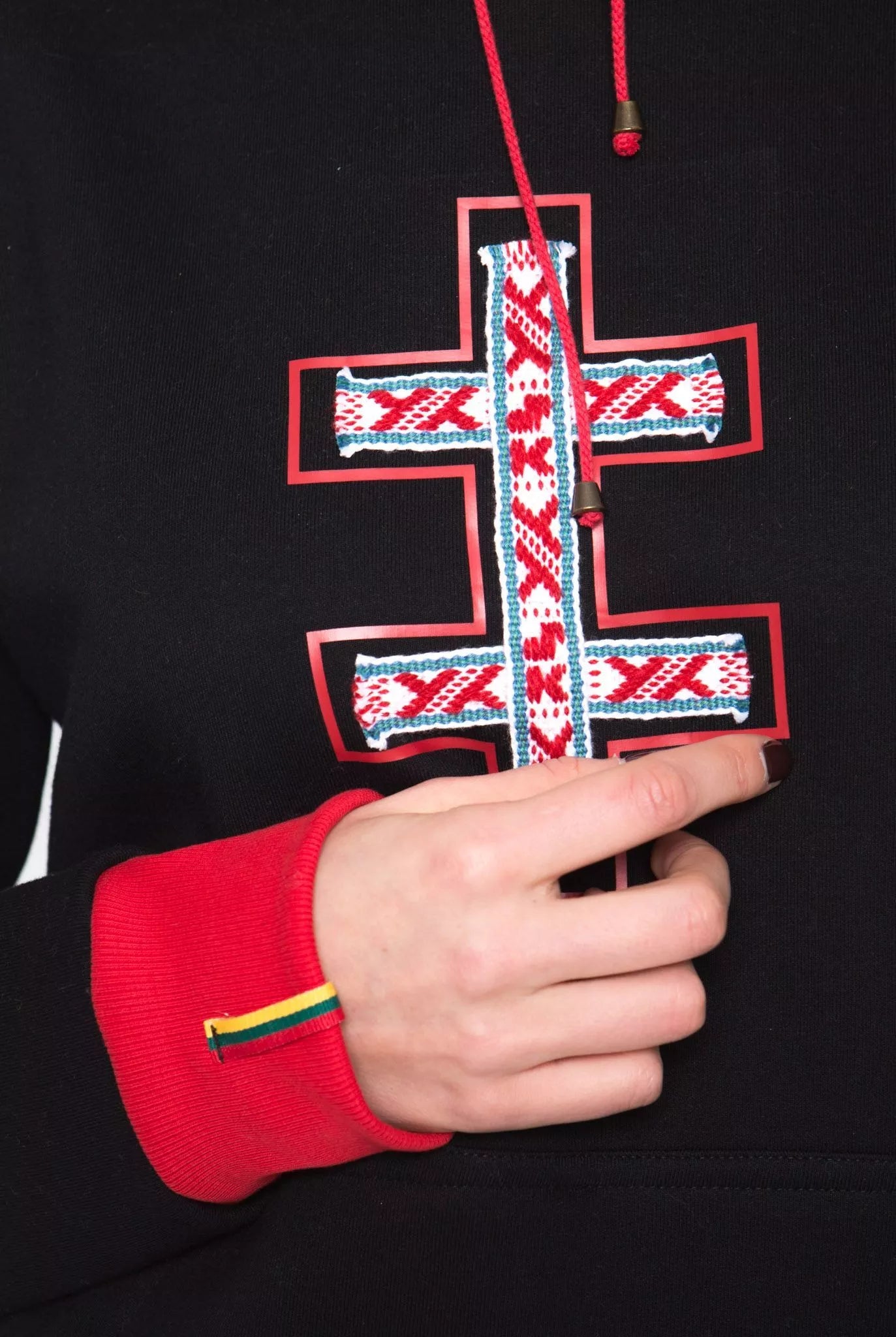 Šiltas jaukus juodas džemperis su tautinėm juostom išaustom tautodailininkės rankomis. Juosta išausta mažosios Lietuvos regionui būdingais motyvais. Ant krūtinės dvigubo kryžiaus spaudas, LDK simbolis. rankogaliai apsiūti Lietuvos trispalvės juostelėmis. Medžiagos vidinė dalis su tankiu pūkeliu, kuris sukuria įpatingą šilumos jausmą ir norą vilkėti džemperį nuolat. Sofa Killer džemperių modeliai nevaržo judesių, tad puikiai tinka tiek pasyviam tiek aktyviam poilsiui. Jei pageidaujate viso kostiumo su kelnėmis - susisiekite, kelnių kaina 39 euro.