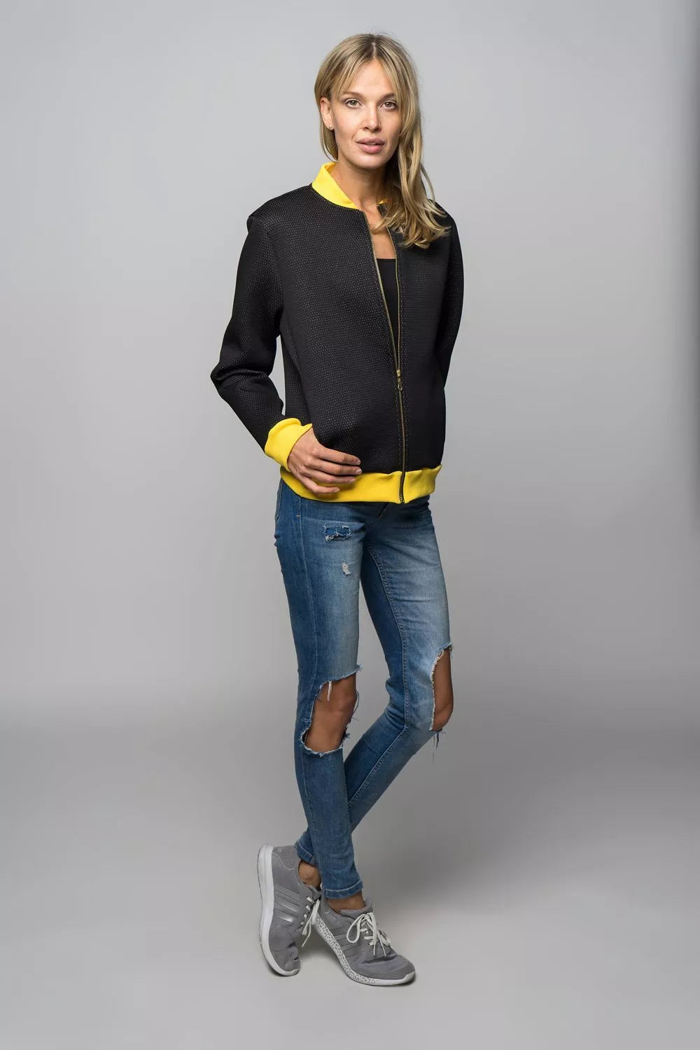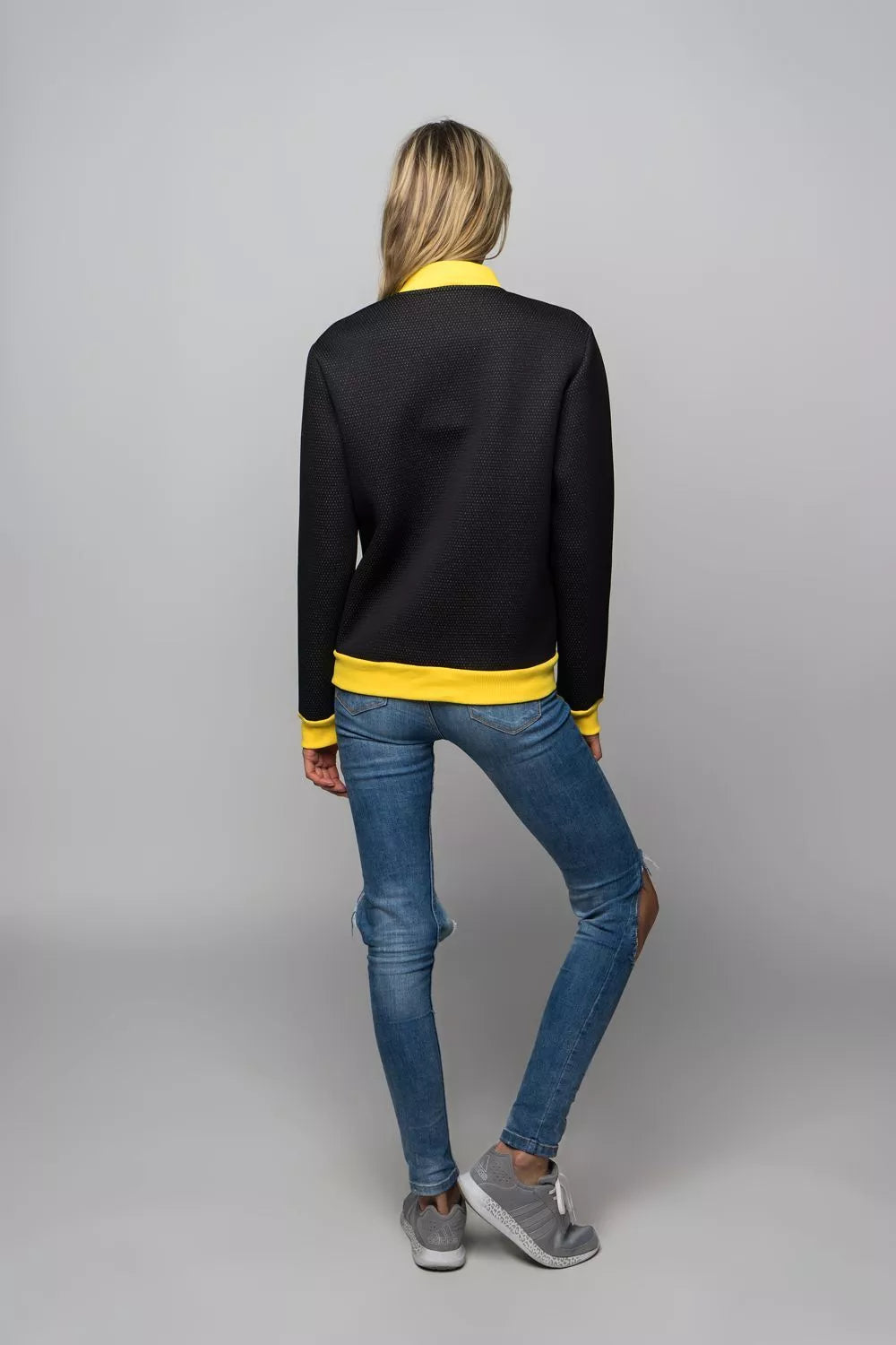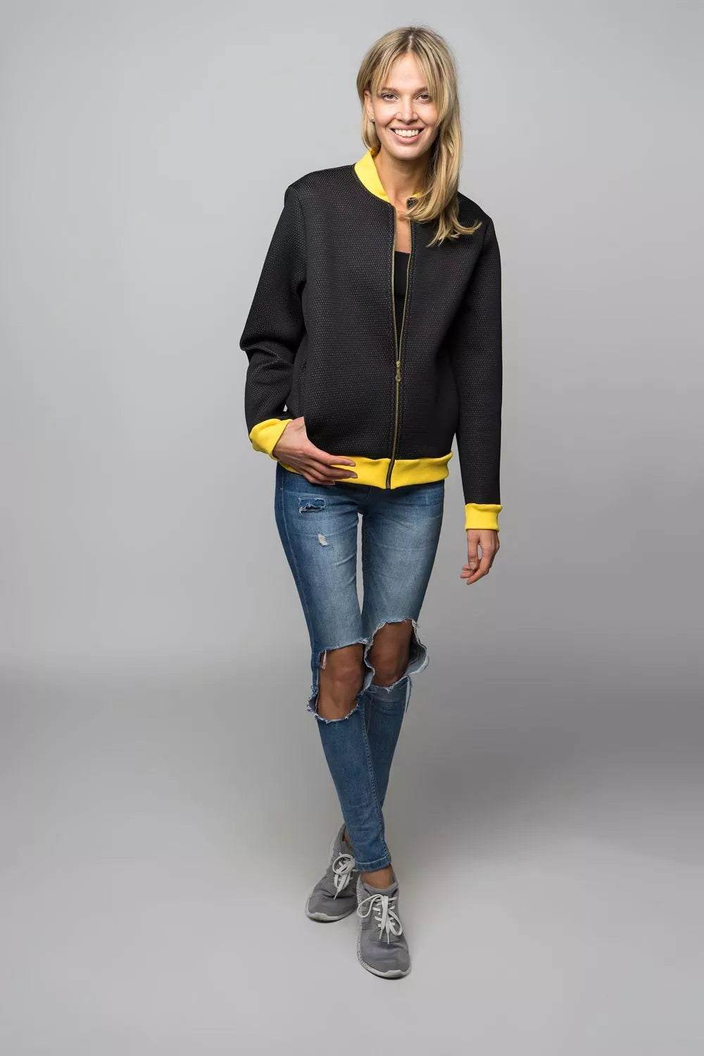 Sofa Killer juodas moteriškas bomberis su geltonais rankogaliais, šonuose kišenės, pasiūtas iš standaus ir minkšto polipropeleno. Galite rinktis iš plačios dydžių skalės, o pats rūbas tradiciškai turi būti laisvas, tad kiek didesnis dydis puikiai tiks.
