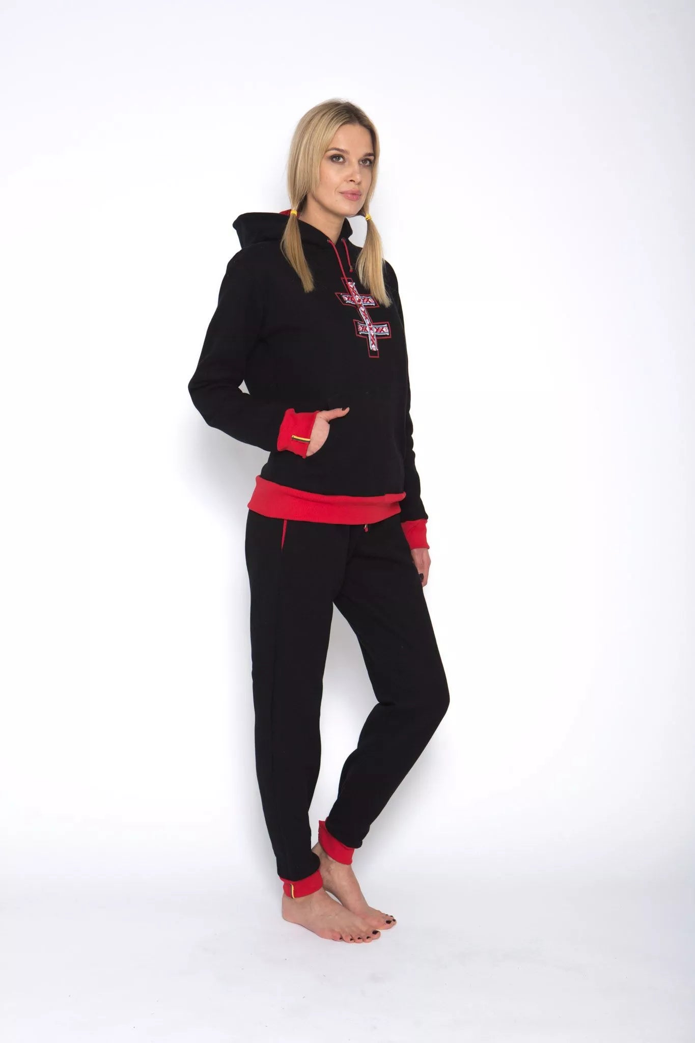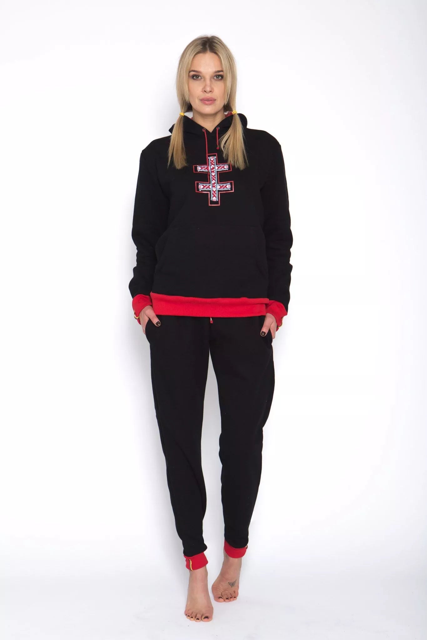 Šiltas jaukus juodas sportinis kostiumas su tautinėm juostom išaustom tautodailininkės rankomis. Juosta išausta mažosios Lietuvos regionui būdingais motyvais. Ant krūtinės dvigubo kryžiaus spaudas, LDK simbolis. rankogaliai apsiūti Lietuvos trispalvės juostelėmis. Medžiagos vidinė dalis su tankiu pūkeliu, kuris sukuria įpatingą šilumos jausmą ir norą vilkėti džemperį nuolat. Sofa Killer džemperių modeliai nevaržo judesių, tad puikiai tinka tiek pasyviam tiek aktyviam poilsiui. Jei pageidaujate pageidaujate skirtingų dydžių viršutinės ar apatinės dalies, - susisiekite.
