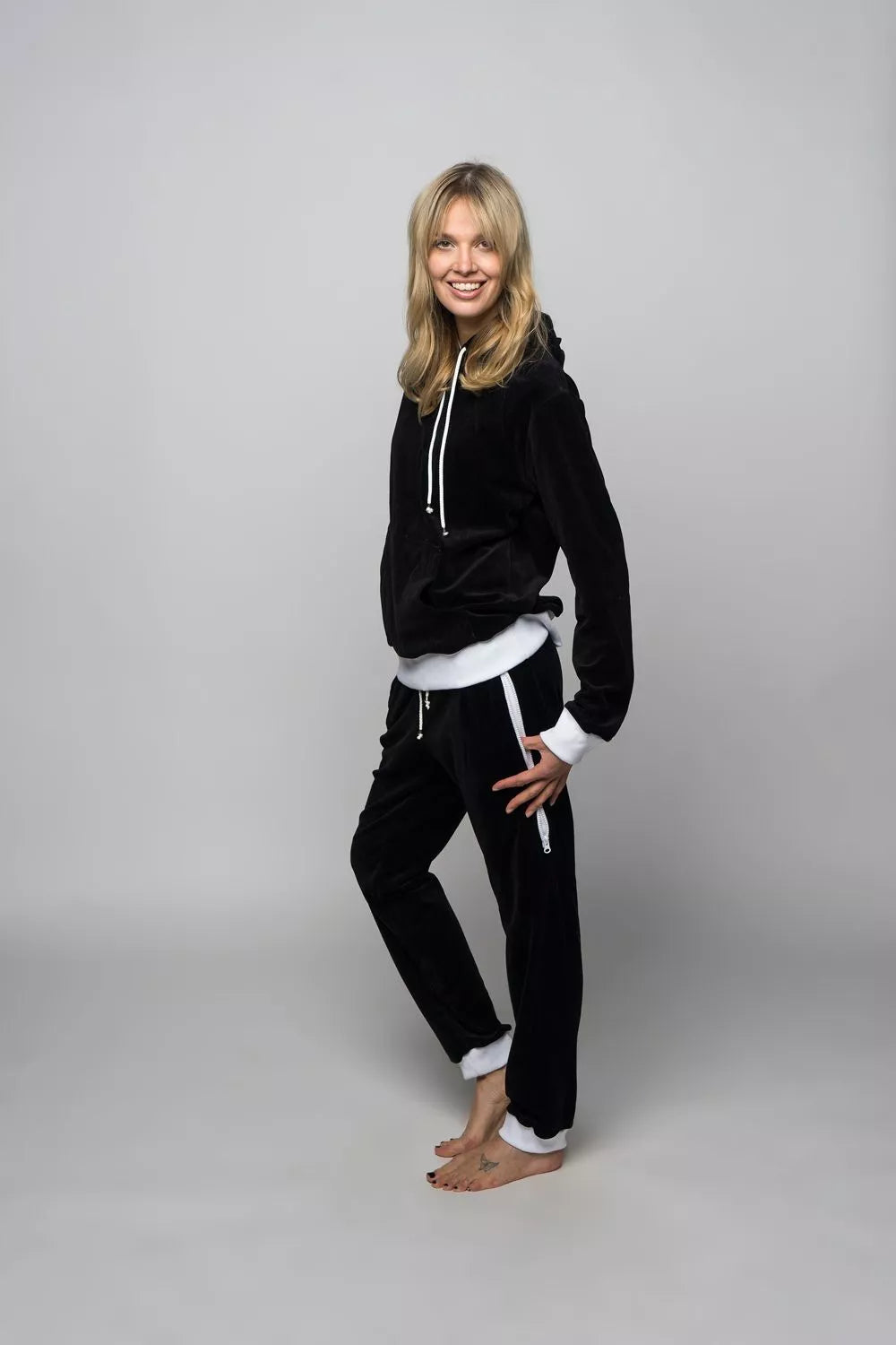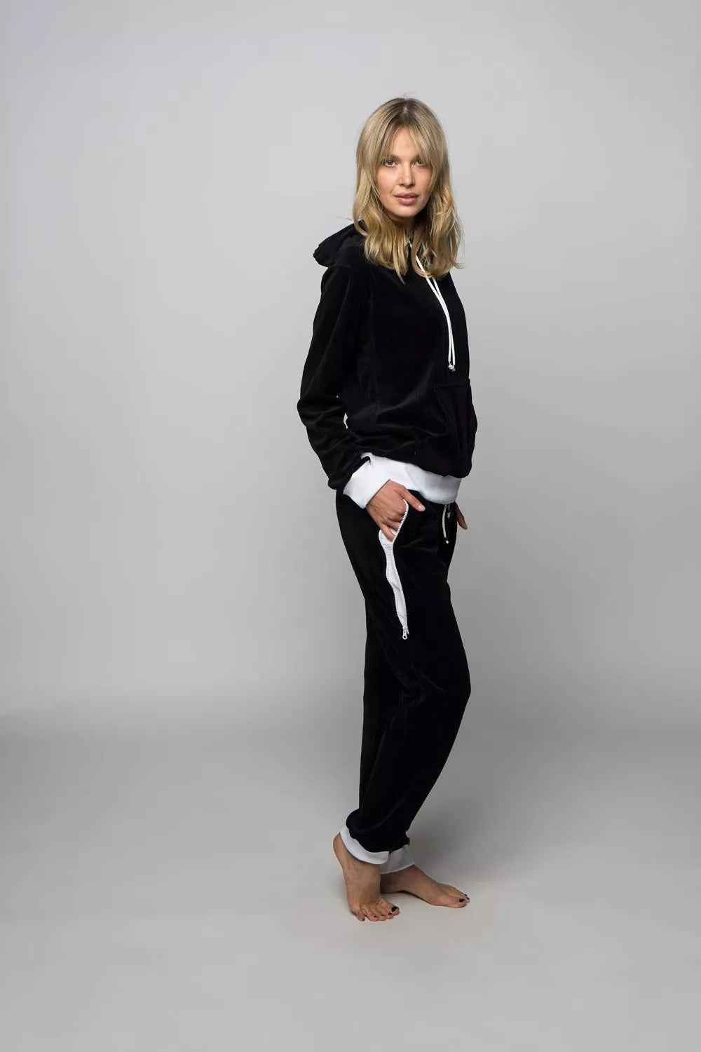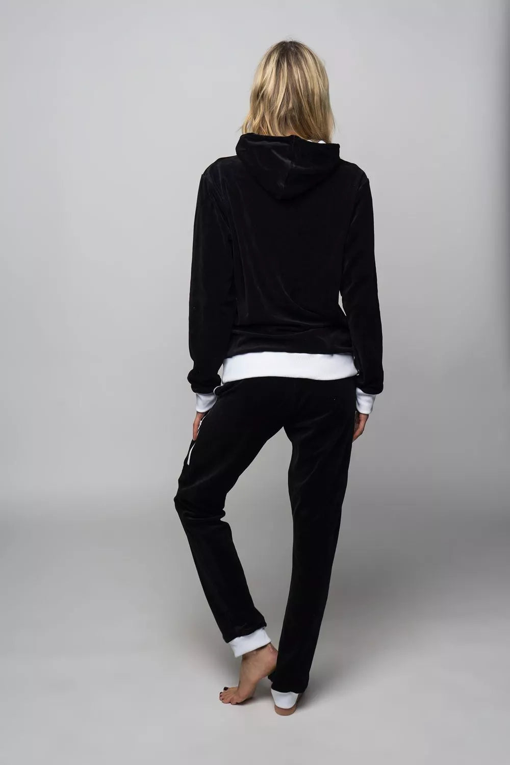 Sofa Killer juodas veliūrinis sportinis kostiumas su baltos spalvos detalėmis, skirtas tiek vyrams tiek moterims. Kapišono vidus su derančia baltos spalvos medžiaga. Kišenės džemperio priekyje, kelnėse kišenės dvigubos su jas uždarančiu užtrauktuku, derančios spalvos raištukai kelnėse ir džemperyje. Sofa Killer sportinių kostiumų modeliai nevaržo judesių, tad puikiai tinka tiek pasyviam tiek aktyviam poilsiui, net miegui. Galite rinktis iš plačios dydžių skalės, o pats rūbas tradiciškai turi būti laisvas, tad kiek didesnis dydis puikiai tiks. Dekoruota Sofa Killer logotipu po kišene.