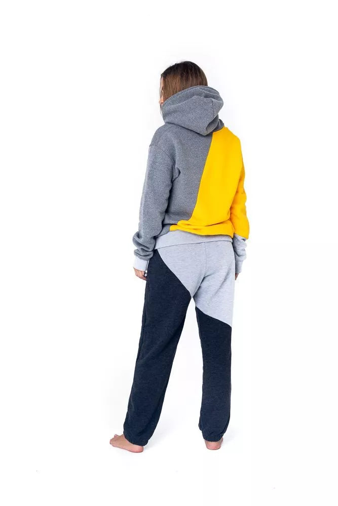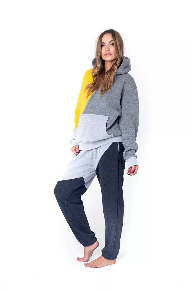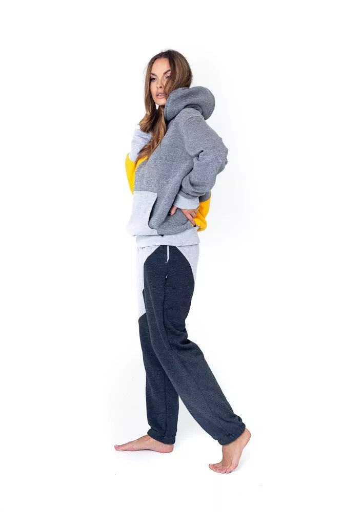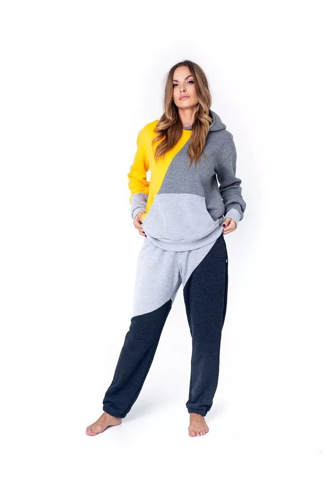 Sofa Killer keturių spalvų sportinis kostiumas Romby, geltonos rankovės ir trijų pilkų spalvų derinys. Medžiagos vidinė dalis su tankiu pūkeliu, kuris sukuria įpatingą šilumos jausmą ir norą vilkėti džemperį nuolat. Sofa Killer džemperių modeliai nevaržo judesių, tad puikiai tinka tiek pasyviam tiek aktyviam poilsiui.