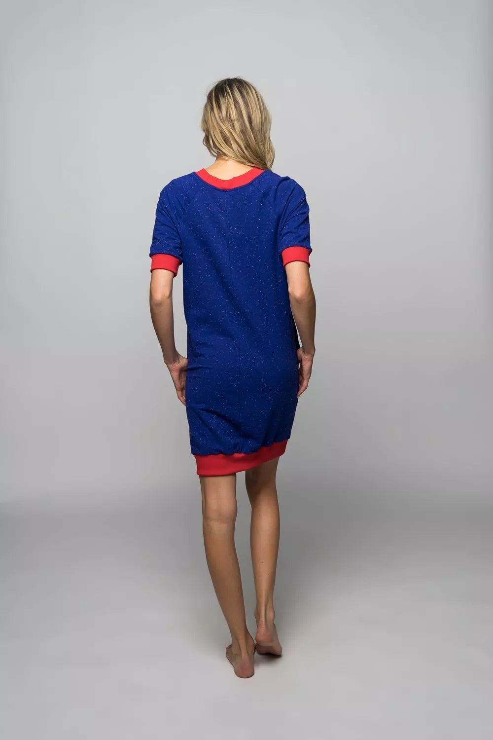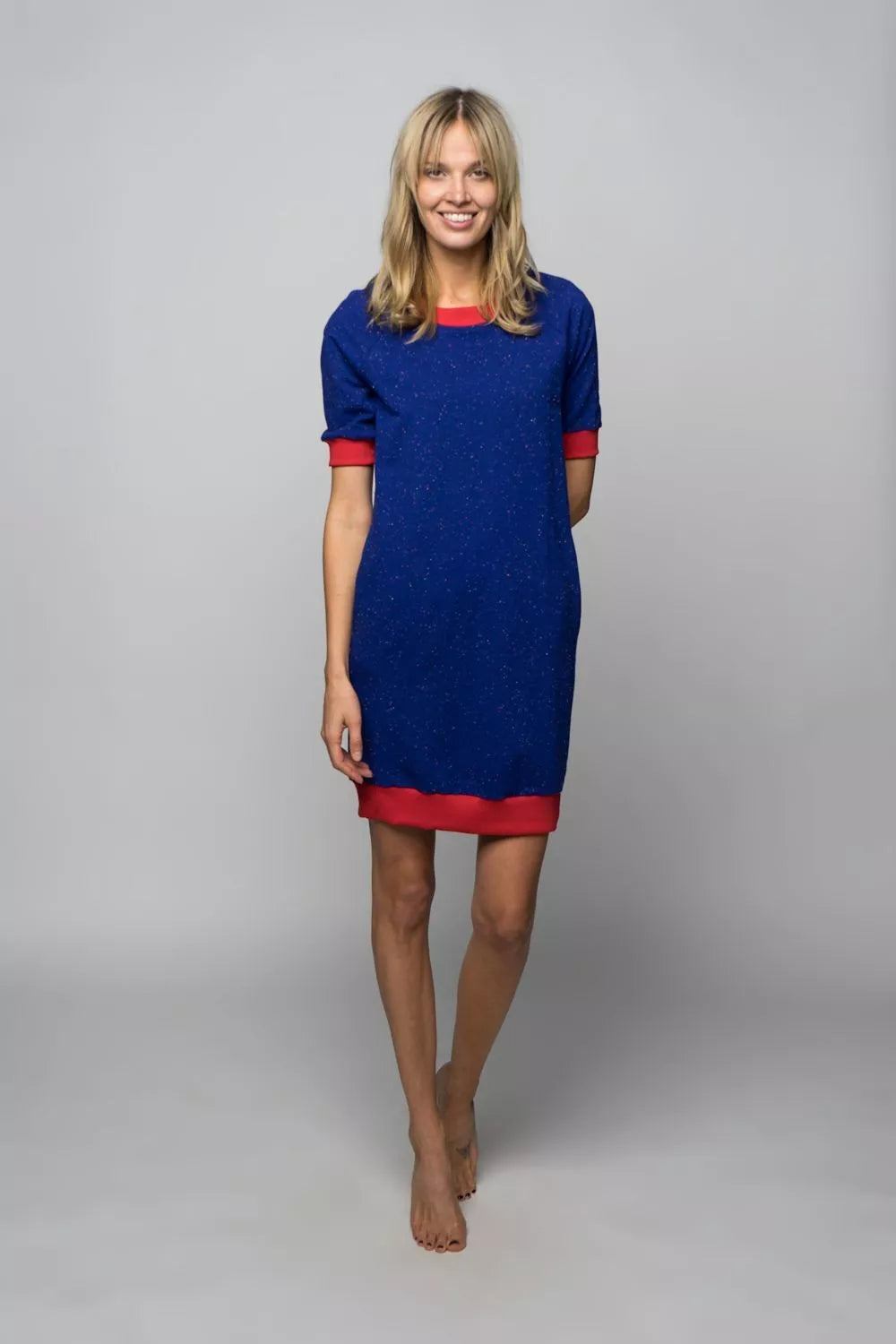 Sofa Killer mėlyna taškuota suknelė su raudonais, čili atspalvio rankogaliais ir dviem kišenėm šonuose. Audinys natūralus, tad suknelė puikiai tiks vasarą. Sofa Killer suknelių modeliai nevaržo judesių, tad puikiai tinka tiek pasyviam tiek aktyviam poilsiui. Rankovės dviejų ketvirčių ilgio. Galite rinktis iš plačios dydžių skalės, o pats rūbas tradiciškai turi būti laisvas, tad kiek didesnis dydis puikiai tiks.