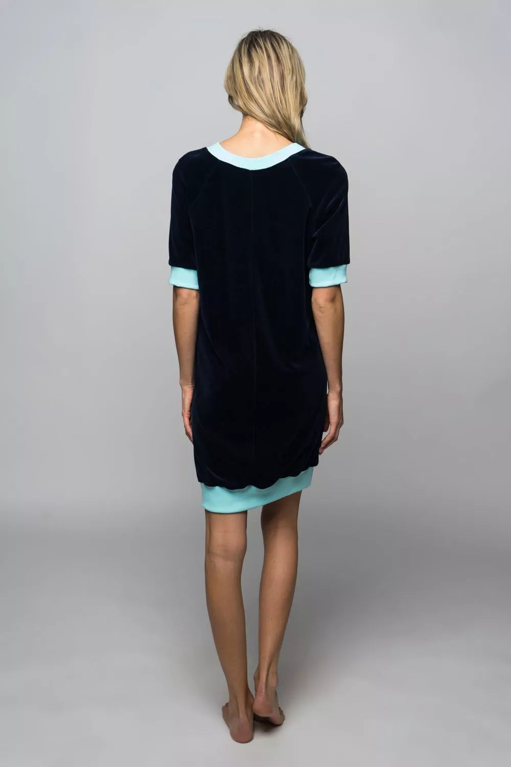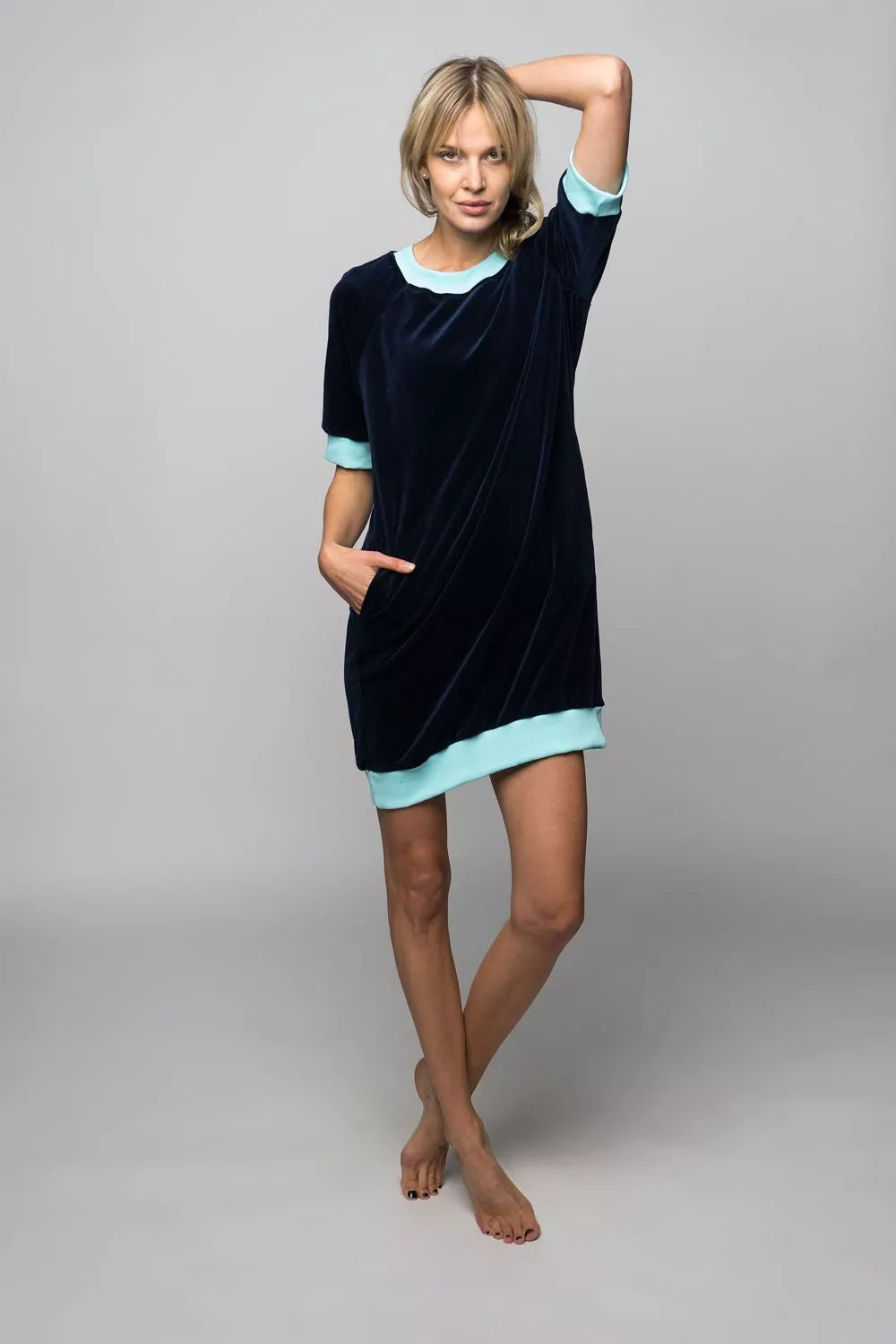 Sofa Killer mėlyno veliūro suknelė su turkio spalvos rankogaliais ir dviem kišenėm šonuose. Audinys natūralus, tad suknelė puikiai tiks vasarą. Sofa Killer suknelių modeliai nevaržo judesių, tad puikiai tinka tiek pasyviam tiek aktyviam poilsiui. Rankovės dviejų ketvirčių ilgio. Galite rinktis iš plačios dydžių skalės, o pats rūbas tradiciškai turi būti laisvas, tad kiek didesnis dydis puikiai tiks.