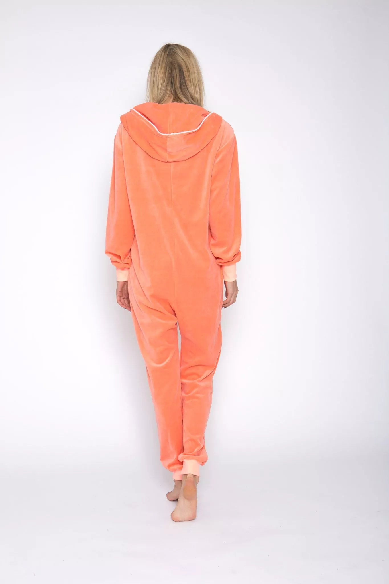 Sofa Killer persiko spalvos veliūrinis kombinezonas su geltonos spalvos rankogaliais (bet galite pasirinkti Jums labiau patinkančią spalvą), kapišono vidus veliūrinis, slim fit tipo, skirtas tiek vyrams tiek moterims. Kišenės priekyje ir užtrauktukas iki pat kapišono viršaus. Medžiaga švelni ir jauki, sukuria įpatingą šilumos jausmą ir norą vilkėti kombinezoną nuolat. Sofa Killer kombinezonų modeliai nevaržo judesių, tad puikiai tinka tiek pasyviam tiek aktyviam poilsiui, net miegui. Galite rinktis iš plačios dydžių skalės, o pats rūbas tradiciškai turi būti laisvas, tad kiek didesnis dydis puikiai tiks. Dekoruota Sofa Killer logotipu po kišene.