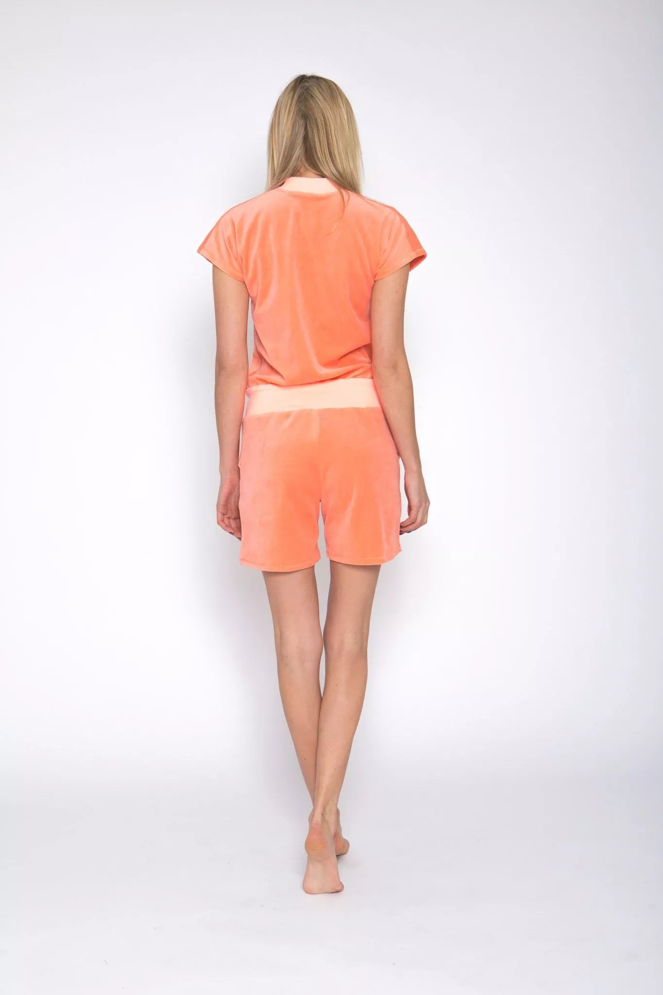 Sofa Killer persiko spalvos veliūrinis vasarinis, trumpom rankovėm ir šortų tipo kombinezonas su oranžinės spalvos rankogaliais. Su užtrauktuku ir kišenėmis priekyje, per juosmenį susiaurinta rankogaliu. Medžiaga švelni ir jauki, sukuria įpatingą šilumos jausmą ir norą vilkėti kombinezoną nuolat. Sofa Killer kombinezonų modeliai nevaržo judesių, tad puikiai tinka tiek pasyviam tiek aktyviam poilsiui. Galite rinktis iš plačios dydžių skalės, o pats rūbas tradiciškai turi būti laisvas, tad kiek didesnis dydis puikiai tiks. Dekoruota Sofa Killer logotipu po kišene.