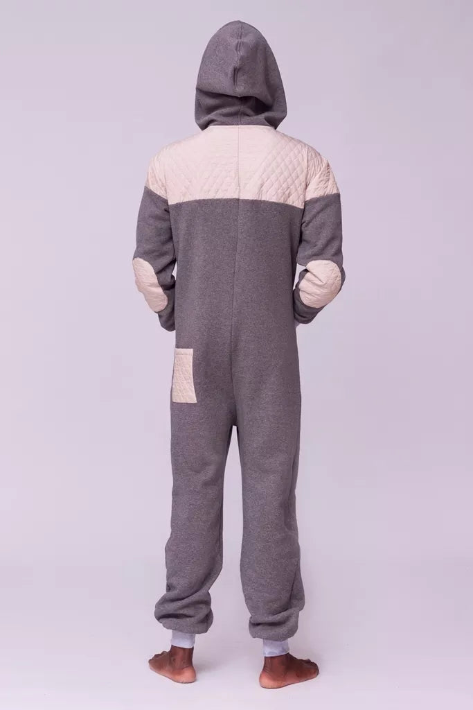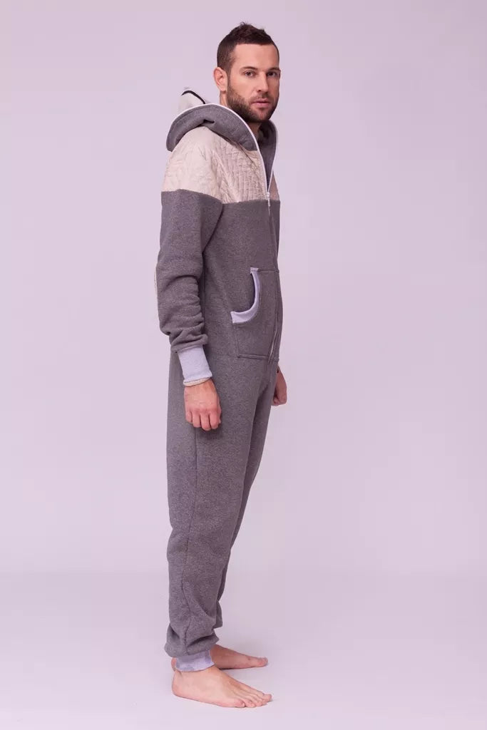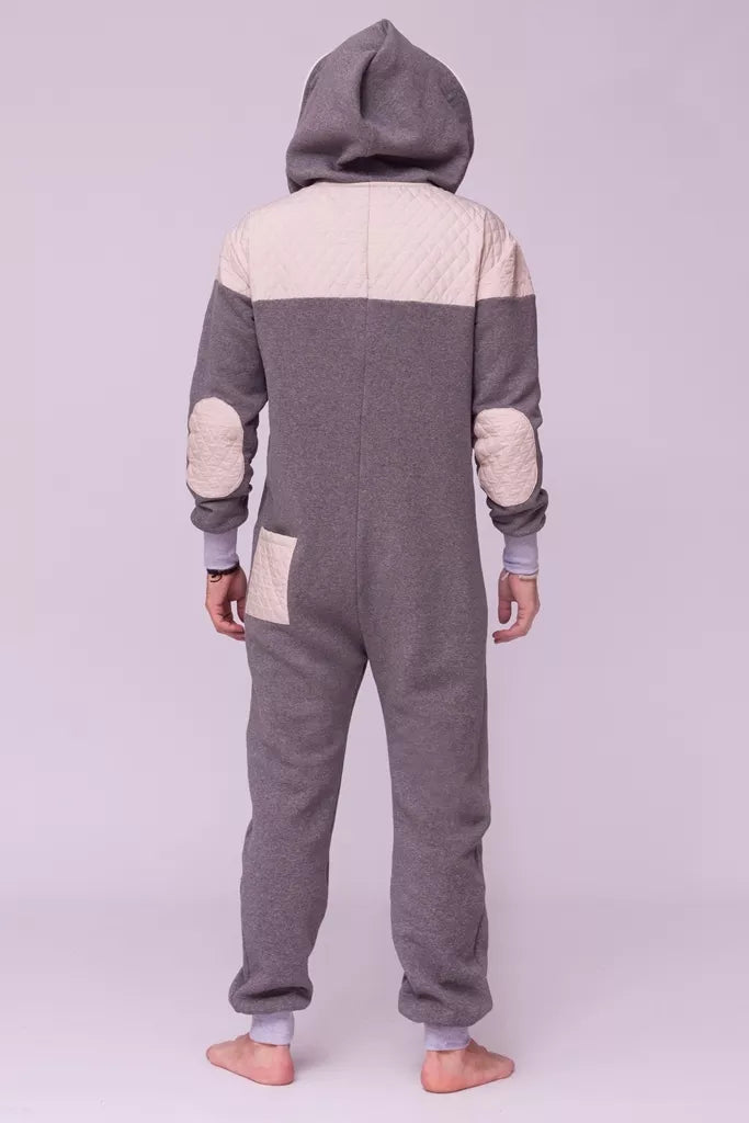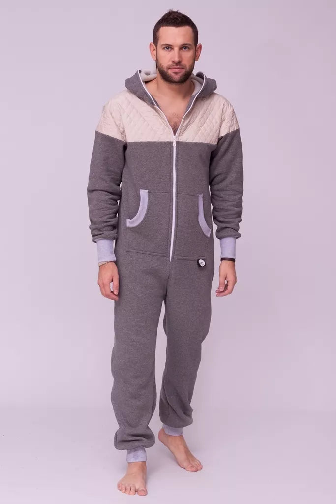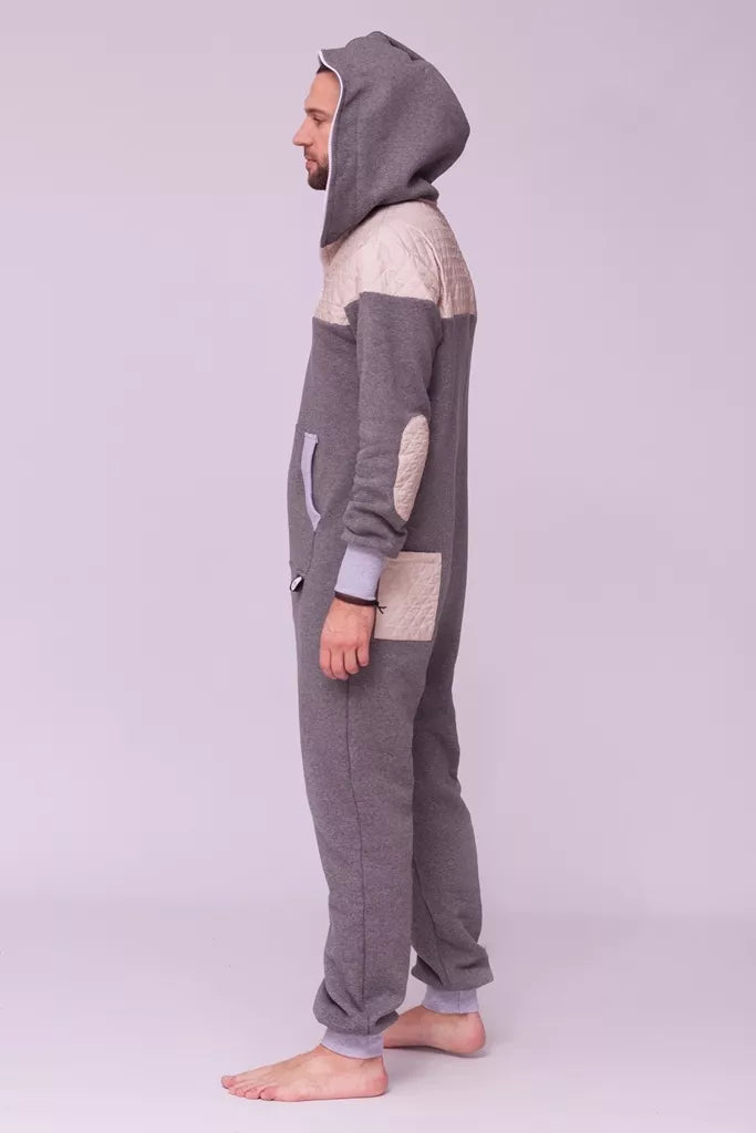 Šiltas jaukus kombinezonas su balintos kavos dygsniuotos medžiagos aplikacijomis ir pilkais rankogaliais (bet galite pasirinkti Jums labiau patinkančią spalvą), skirtas tiek vyrams tiek moterims. Kišenės priekyje ir viena nugaroje. Medžiagos vidinė dalis su tankiu pūkeliu, kuris sukuria įpatingą šilumos jausmą ir norą vilkėti kombinezoną nuolat. Sofa Killer kombinezonų modeliai nevaržo judesių, tad puikiai tinka tiek pasyviam tiek aktyviam poilsiui, net miegui. Galite rinktis iš plačios dydžių skalės, o pats rūbas tradiciškai turi būti laisvas, tad kiek didesnis dydis puikiai tiks. Dekoruota Sofa Killer logotipu po kišene.