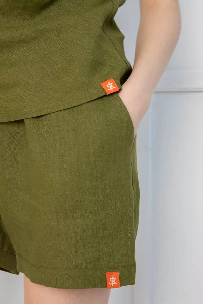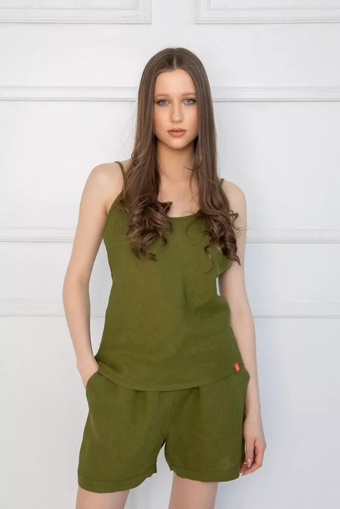 Sofa Killer samanų žalios spalvos lininis kostiumas su šortais ir marškinėliais be rankovių. Šortai turi kišenės priekyje. Medžiaga švelni ir jauki dėl minkštinto lino, sukuria lengvumo jausmą ir norą vilkėti kostiumą karštomis vasaros dienomis. Sofa Killer drabužių modeliai nevaržo judesių, tad puikiai tinka tiek pasyviam tiek aktyviam poilsiui, net miegui. Galite rinktis iš plačios dydžių skalės, o pats rūbas tradiciškai turi būti laisvas, tad kiek didesnis dydis puikiai tiks. Dekoruota oranžiniu Sofa Killer logotipu po kišene.