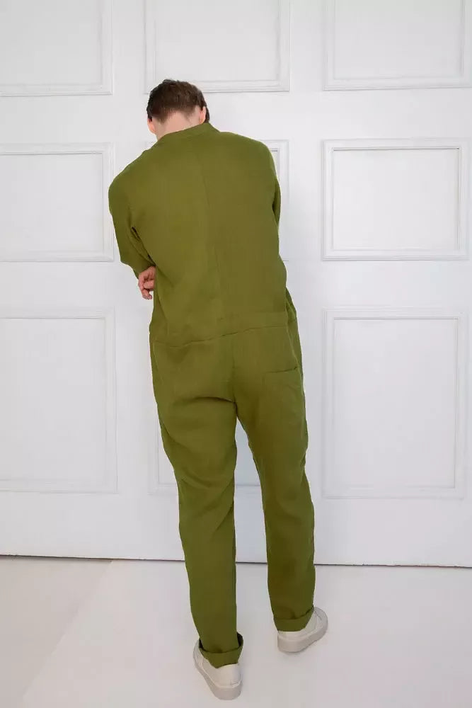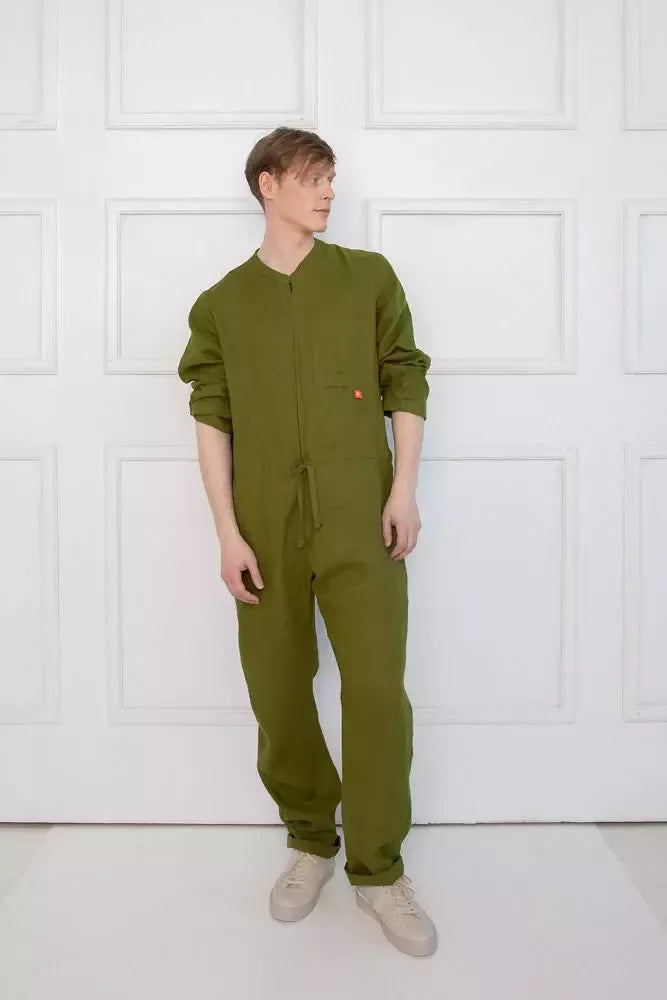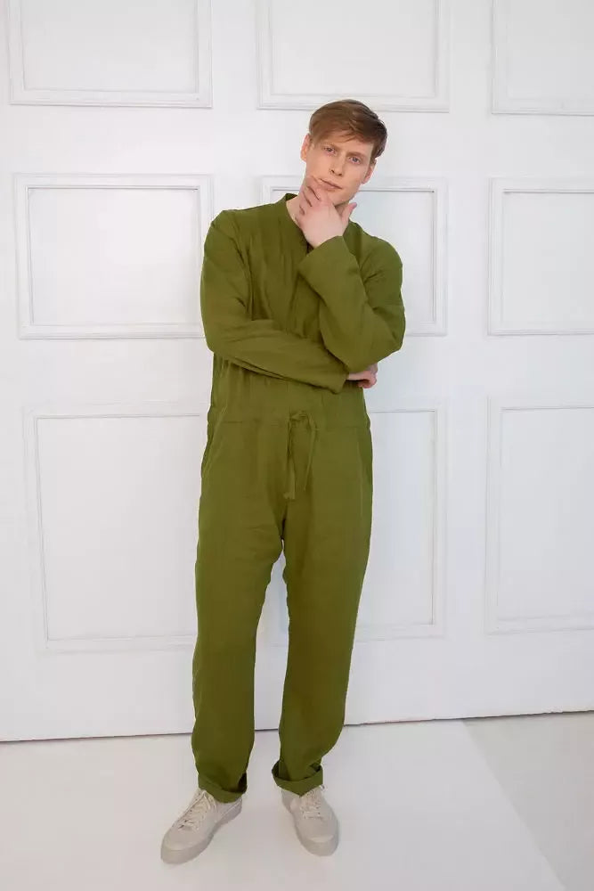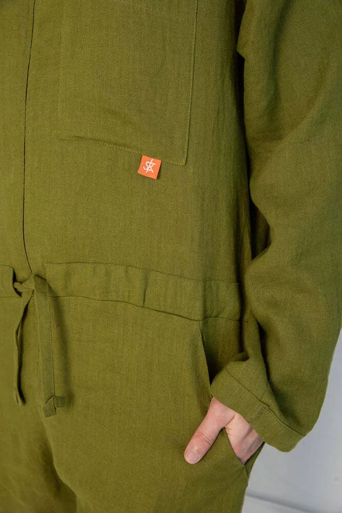 Sofa Killer samanų žalios spalvos lininis kombinezonas surišamas per juosmenį. Kišenės priekyje ir užtrauktukas iki pat kaklo, galite atsiraitoti rankoves ir klešnes. Medžiaga švelni ir jauki dėl minkštinto lino, sukuria lengvumo jausmą ir norą vilkėti kombinezoną nuolat. Sofa Killer kombinezonų modeliai nevaržo judesių, tad puikiai tinka tiek pasyviam tiek aktyviam poilsiui, net miegui. Galite rinktis iš plačios dydžių skalės, o pats rūbas tradiciškai turi būti laisvas, tad kiek didesnis dydis puikiai tiks. Dekoruota oranžiniu Sofa Killer logotipu po kišene.