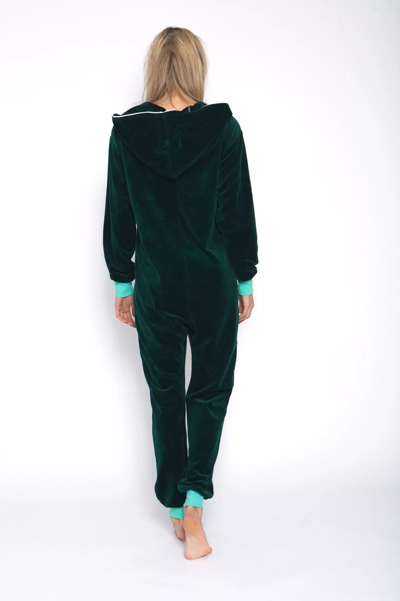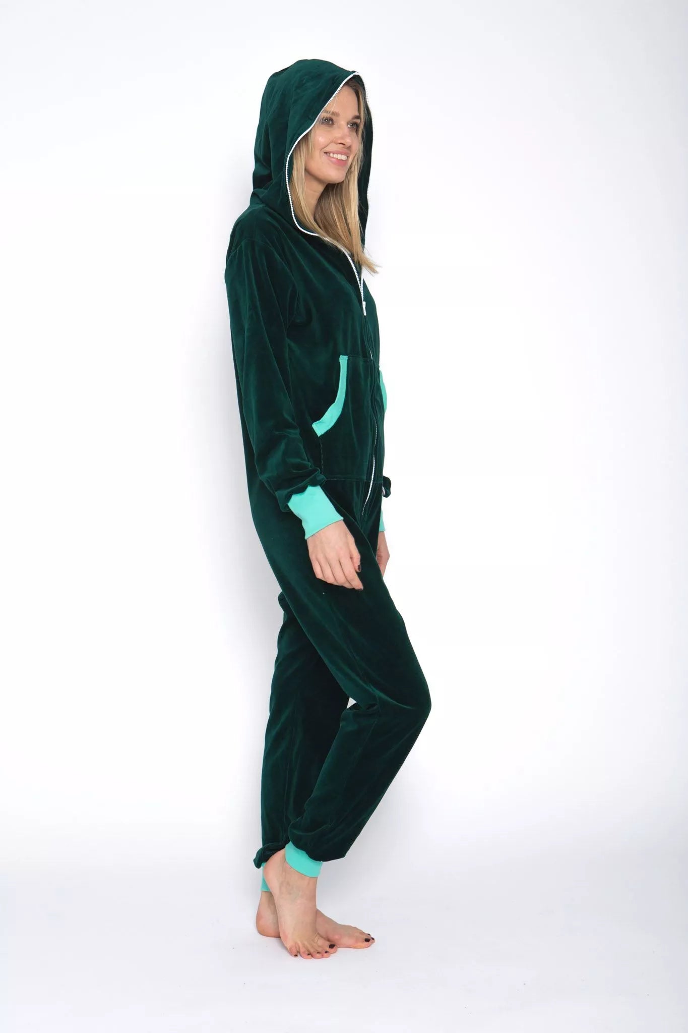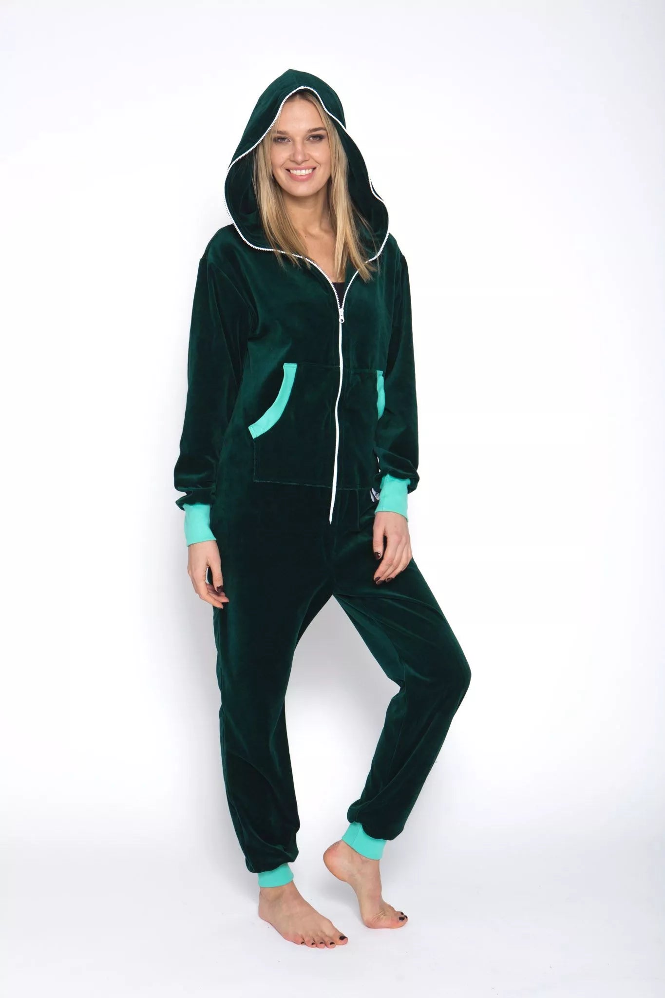 Sofa Killer smaragdo spalvos veliūrinis kombinezonas su turkio spalvos rankogaliais (bet galite pasirinkti Jums labiau patinkančią spalvą), kapišono vidus veliūrinis, slim fit tipo, skirtas tiek vyrams tiek moterims. Kišenės priekyje ir užtrauktukas iki pat kapišono viršaus. Medžiaga švelni ir jauki, sukuria įpatingą šilumos jausmą ir norą vilkėti kombinezoną nuolat. Sofa Killer kombinezonų modeliai nevaržo judesių, tad puikiai tinka tiek pasyviam tiek aktyviam poilsiui, net miegui. Galite rinktis iš plačios dydžių skalės, o pats rūbas tradiciškai turi būti laisvas, tad kiek didesnis dydis puikiai tiks. Dekoruota Sofa Killer logotipu po kišene.
