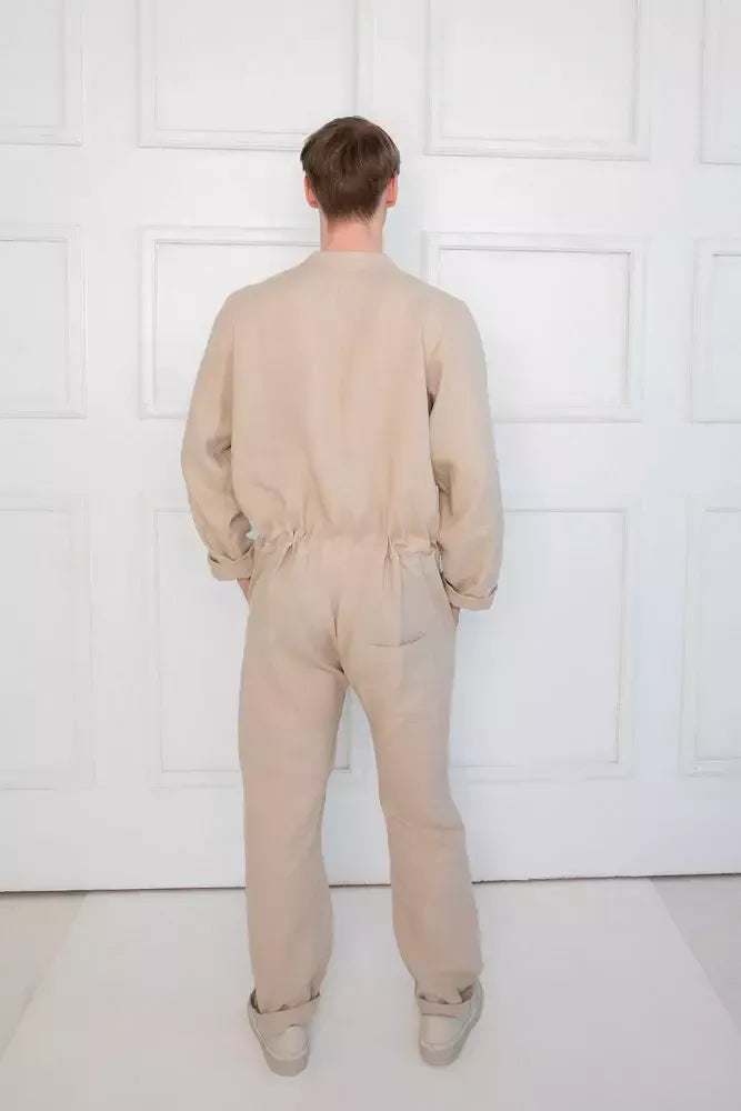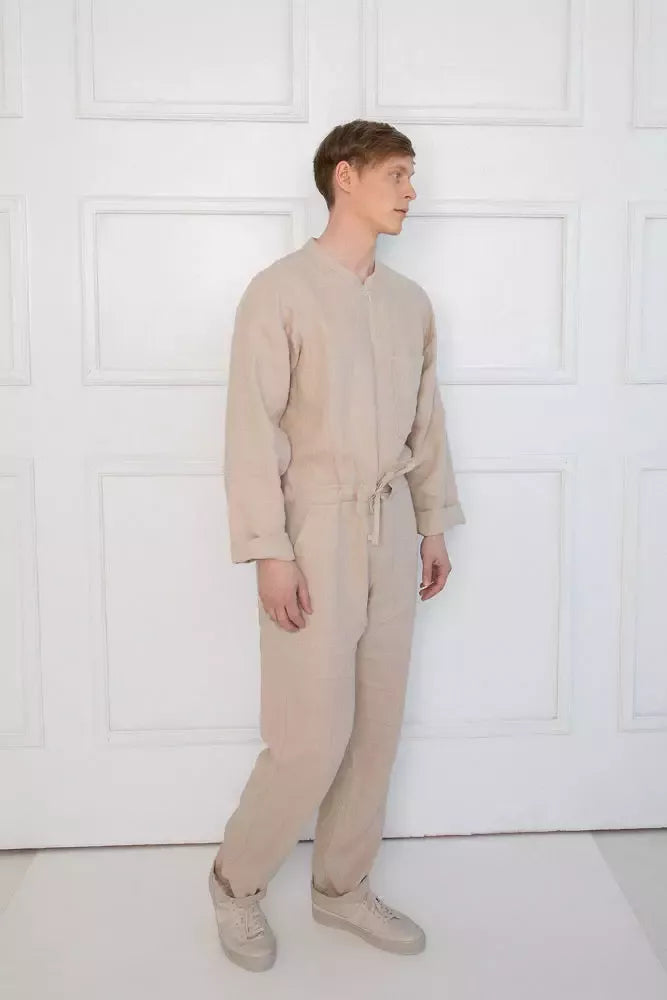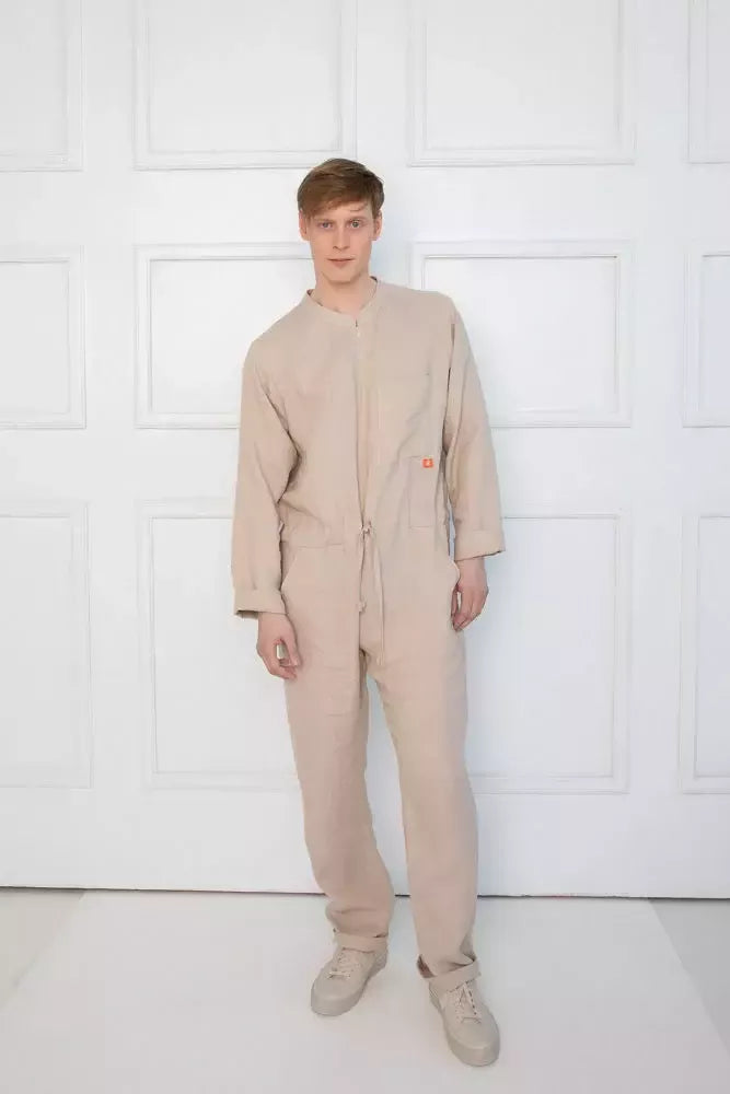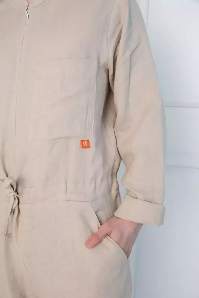 Sofa Killer smėlio spalvos lininis kombinezonas surišamas per juosmenį. Kišenės priekyje ir užtrauktukas iki pat kaklo, galite atsiraitoti rankoves ir klešnes. Medžiaga švelni ir jauki dėl minkštinto lino, sukuria lengvumo jausmą ir norą vilkėti kombinezoną nuolat. Sofa Killer kombinezonų modeliai nevaržo judesių, tad puikiai tinka tiek pasyviam tiek aktyviam poilsiui, net miegui. Galite rinktis iš plačios dydžių skalės, o pats rūbas tradiciškai turi būti laisvas, tad kiek didesnis dydis puikiai tiks. Dekoruota oranžiniu Sofa Killer logotipu po kišene.
