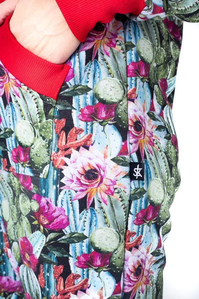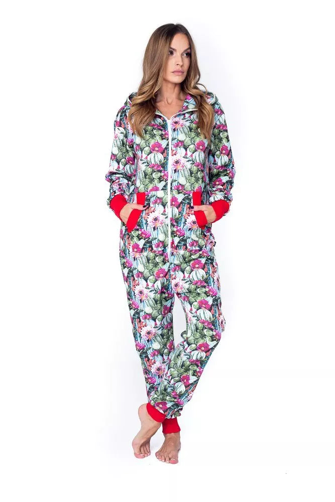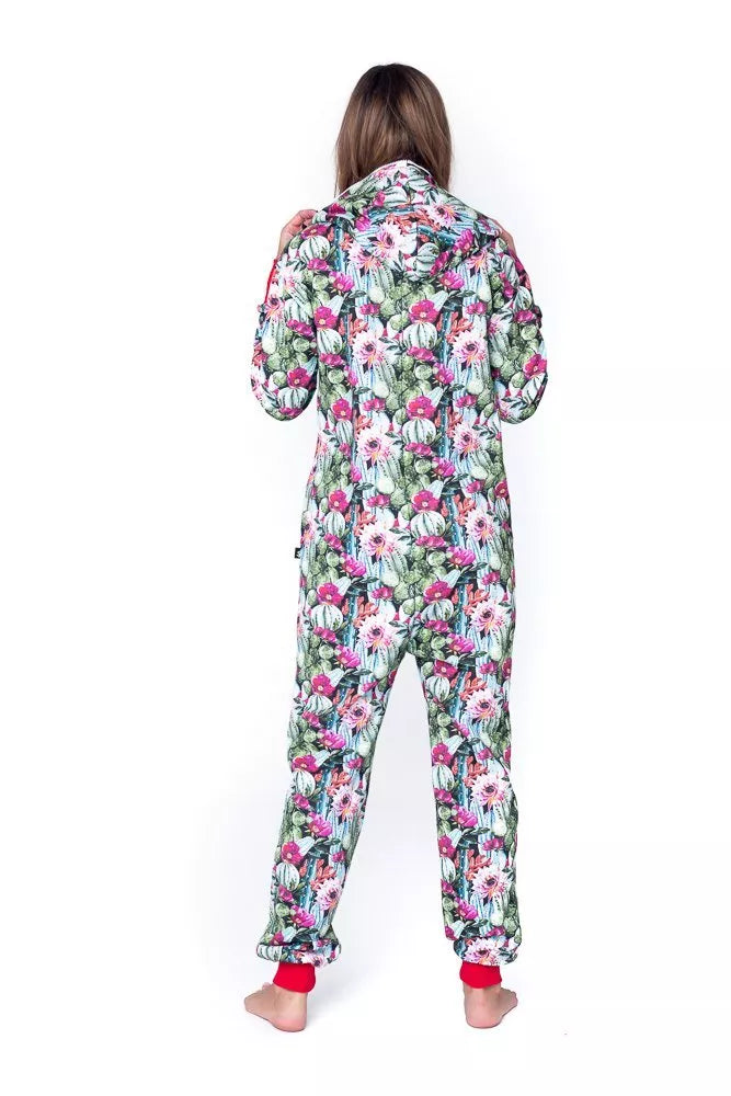 Sofa Killer spalvingų kaktusų rašto spauda dekoruotas kombinezonas Cactus, skirtas tiek vyrams tiek moterims. Priekyje kišenės apsiūtos raudonų rankogalių medžiaga. Medžiagos vidinė dalis su tankiu pūkeliu, kuris sukuria įpatingą šilumos jausmą ir norą vilkėti kombinezoną nuolat. Sofa Killer kombinezonų modeliai nevaržo judesių, tad puikiai tinka tiek pasyviam tiek aktyviam poilsiui, net miegui. Galite rinktis iš plačios dydžių skalės, o pats rūbas tradiciškai turi būti laisvas, tad kiek didesnis dydis puikiai tiks. Dekoruota Sofa Killer logotipu išsiuvinėtu ant krūtinės.