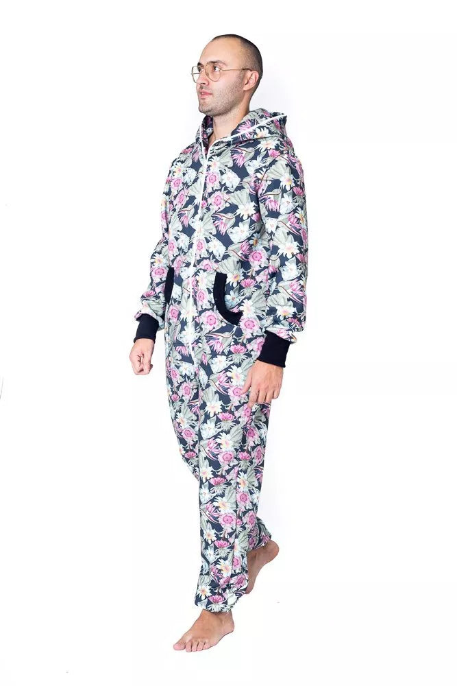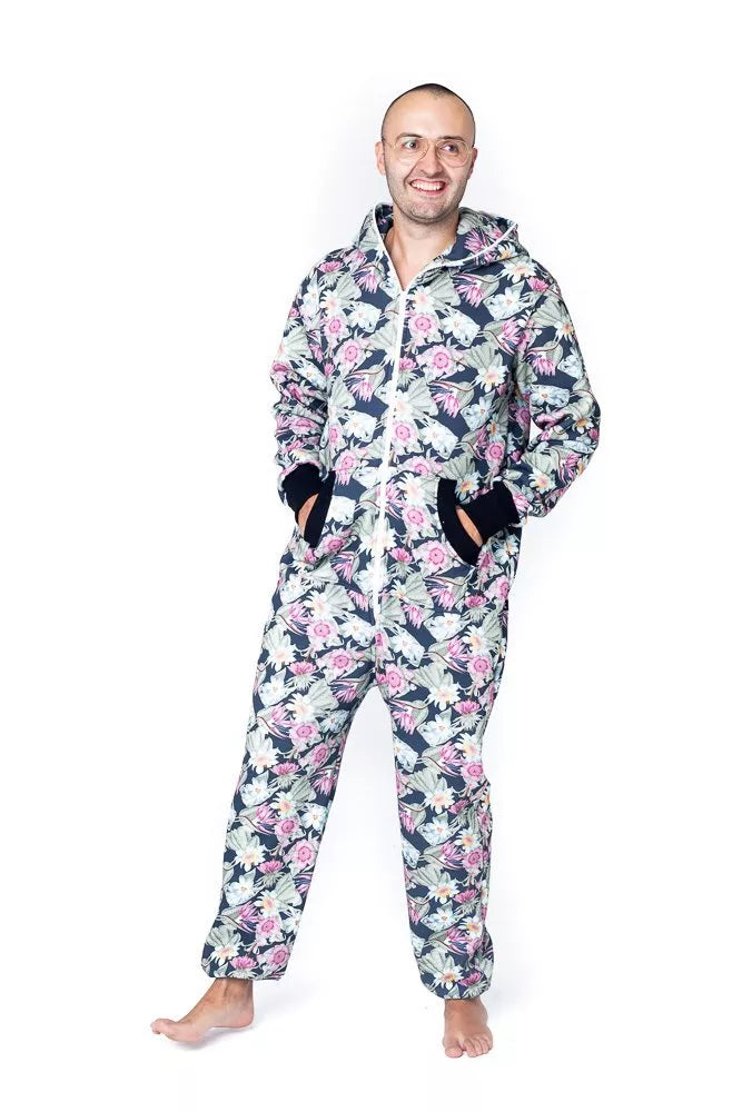 Sofa Killer spalvingų žydinčių gėlių rašto spauda dekoruotas kombinezonas Floral, skirtas tiek vyrams tiek moterims. Priekyje kišenės apsiūtos juodų rankogalių medžiaga. Medžiagos vidinė dalis su tankiu pūkeliu, kuris sukuria įpatingą šilumos jausmą ir norą vilkėti kombinezoną nuolat. Sofa Killer kombinezonų modeliai nevaržo judesių, tad puikiai tinka tiek pasyviam tiek aktyviam poilsiui, net miegui. Galite rinktis iš plačios dydžių skalės, o pats rūbas tradiciškai turi būti laisvas, tad kiek didesnis dydis puikiai tiks. Dekoruota Sofa Killer logotipu išsiuvinėtu ant krūtinės.