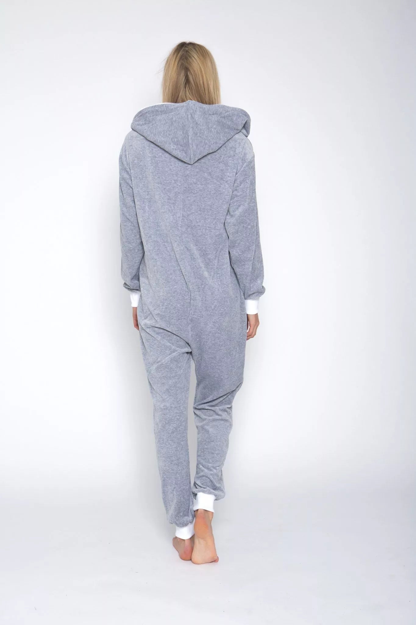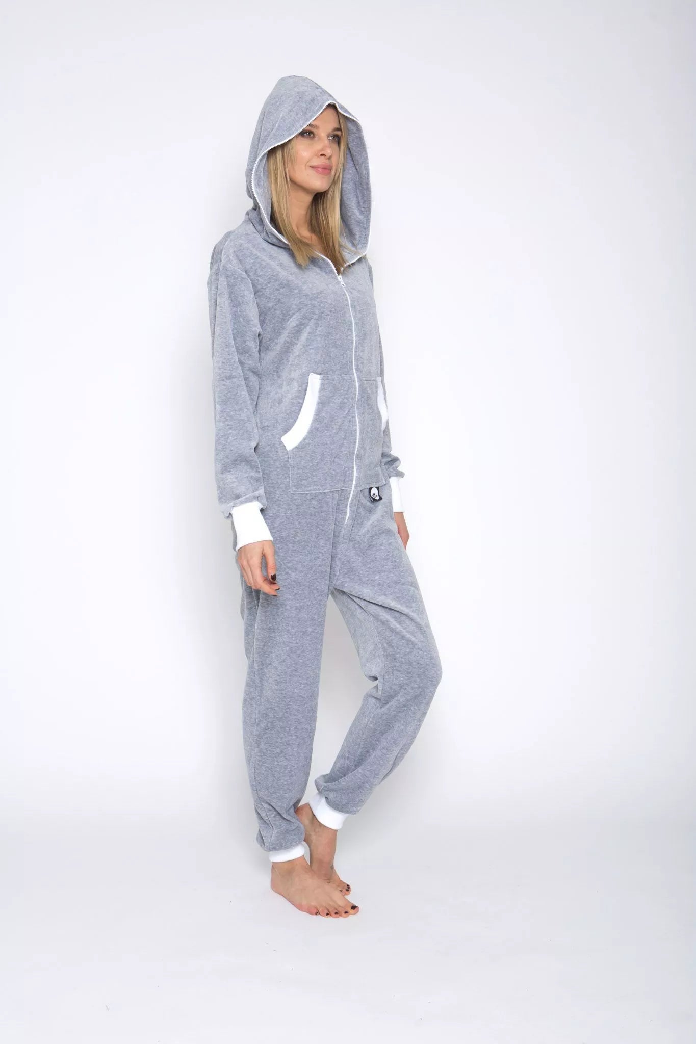 Sofa Killer šviesiai pilkas spalvos veliūrinis kombinezonas su geltonos spalvos rankogaliais (bet galite pasirinkti Jums labiau patinkančią spalvą), kapišono vidus veliūrinis, slim fit tipo, skirtas tiek vyrams tiek moterims. Kišenės priekyje ir užtrauktukas iki pat kapišono viršaus. Medžiaga švelni ir jauki, sukuria įpatingą šilumos jausmą ir norą vilkėti kombinezoną nuolat. Sofa Killer kombinezonų modeliai nevaržo judesių, tad puikiai tinka tiek pasyviam tiek aktyviam poilsiui, net miegui. Galite rinktis iš plačios dydžių skalės, o pats rūbas tradiciškai turi būti laisvas, tad kiek didesnis dydis puikiai tiks. Dekoruota Sofa Killer logotipu po kišene.