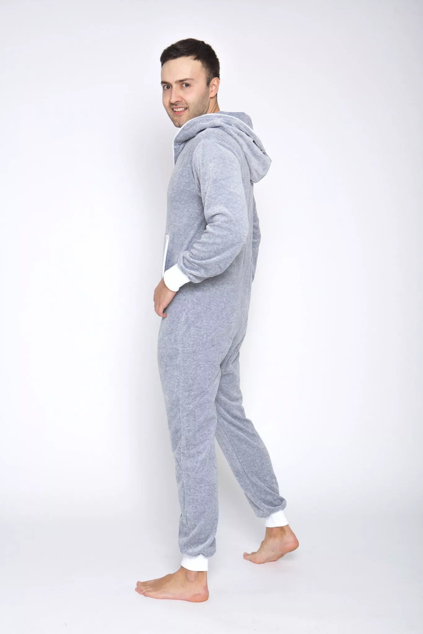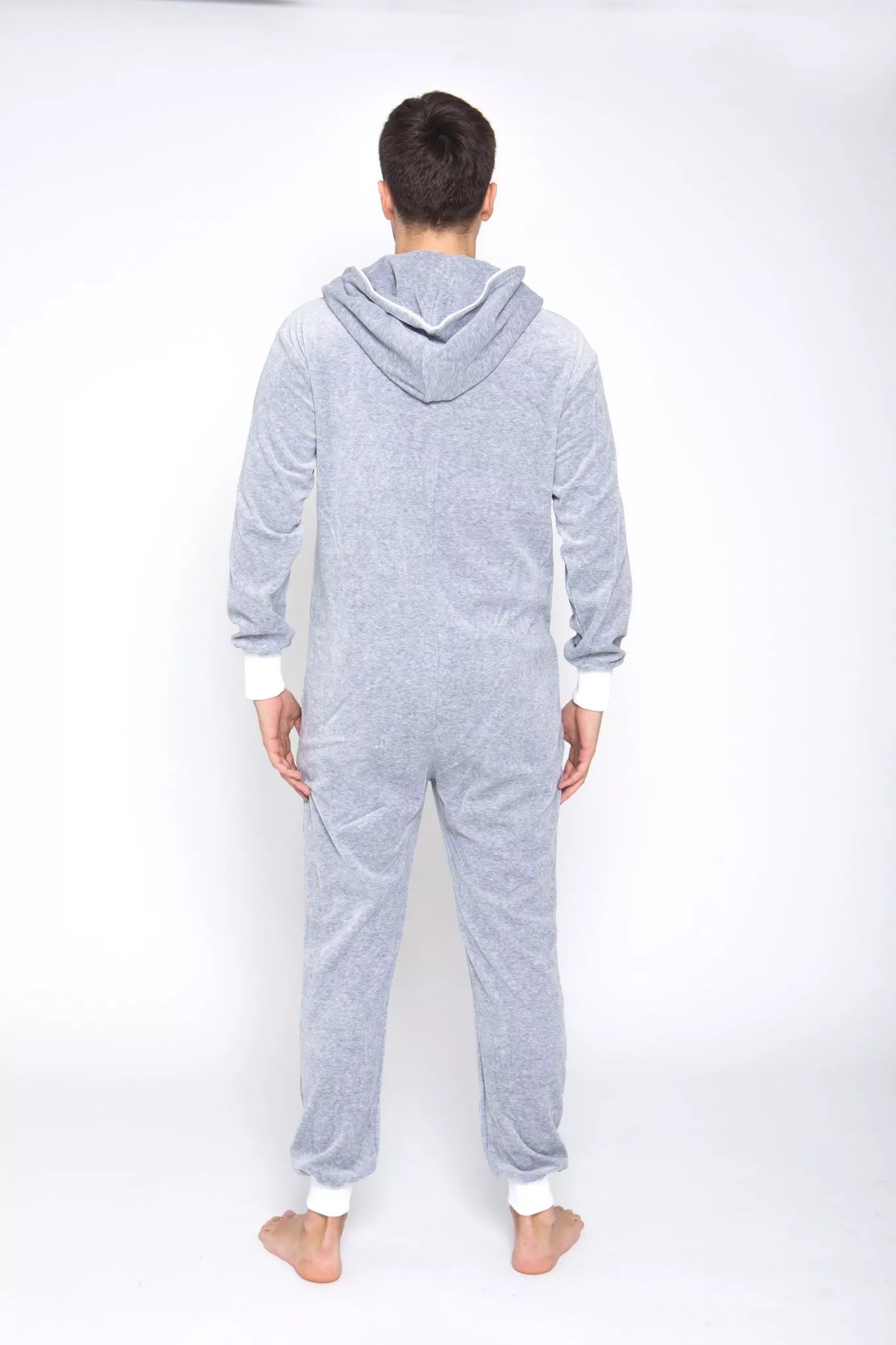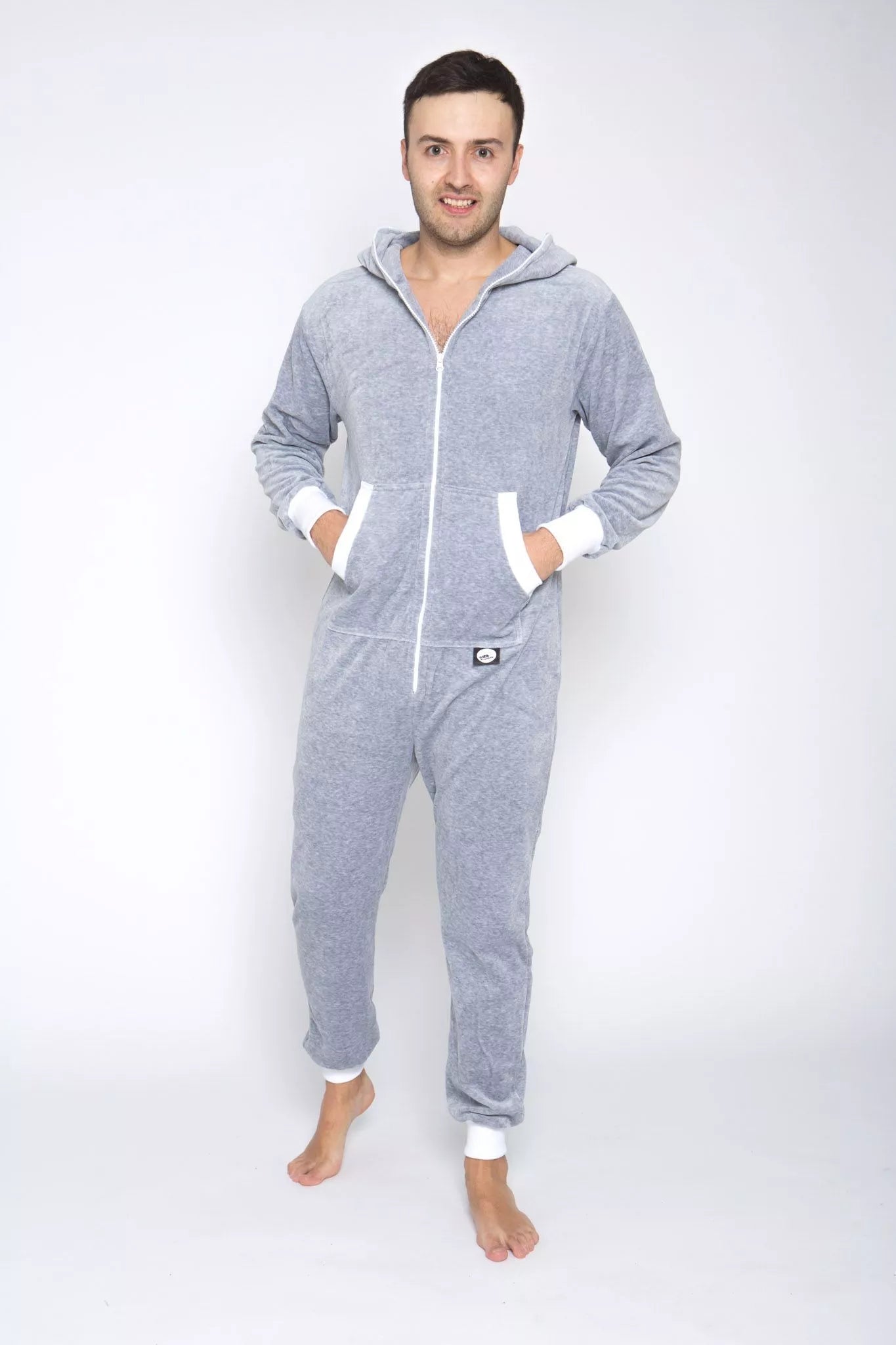 Sofa Killer šviesiai pilkas veliūrinis kombinezonas su juodais rankogaliais (bet galite pasirinkti Jums labiau patinkančią spalvą), slim fit tipo, skirtas tiek vyrams tiek moterims. Kišenės priekyje ir užtrauktukas iki pat kapišono viršaus. Medžiaga švelni ir jauki, sukuria įpatingą šilumos jausmą ir norą vilkėti kombinezoną nuolat. Sofa Killer kombinezonų modeliai nevaržo judesių, tad puikiai tinka tiek pasyviam tiek aktyviam poilsiui, net miegui. Galite rinktis iš plačios dydžių skalės, o pats rūbas tradiciškai turi būti laisvas, tad kiek didesnis dydis puikiai tiks. Dekoruota Sofa Killer logotipu po kišene.
