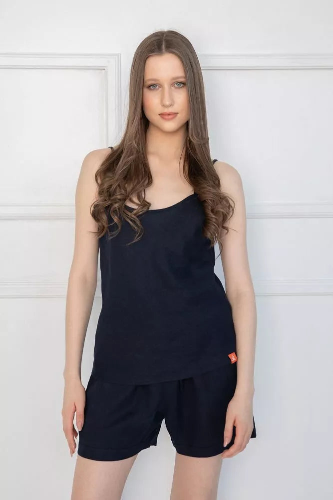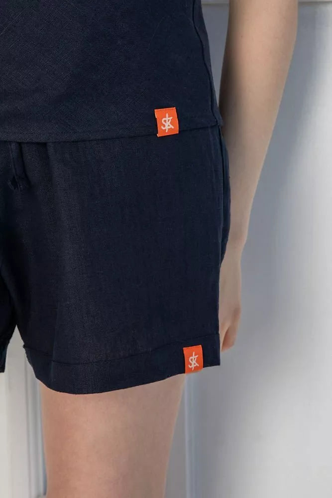Sofa Killer tamsiai mėlynas lininis kostiumas su šortais ir marškinėliais be rankovių. Šortai turi kišenės priekyje. Medžiaga švelni ir jauki dėl minkštinto lino, sukuria lengvumo jausmą ir norą vilkėti kostiumą karštomis vasaros dienomis. Sofa Killer drabužių modeliai nevaržo judesių, tad puikiai tinka tiek pasyviam tiek aktyviam poilsiui, net miegui. Galite rinktis iš plačios dydžių skalės, o pats rūbas tradiciškai turi būti laisvas, tad kiek didesnis dydis puikiai tiks. Dekoruota oranžiniu Sofa Killer logotipu po kišene.