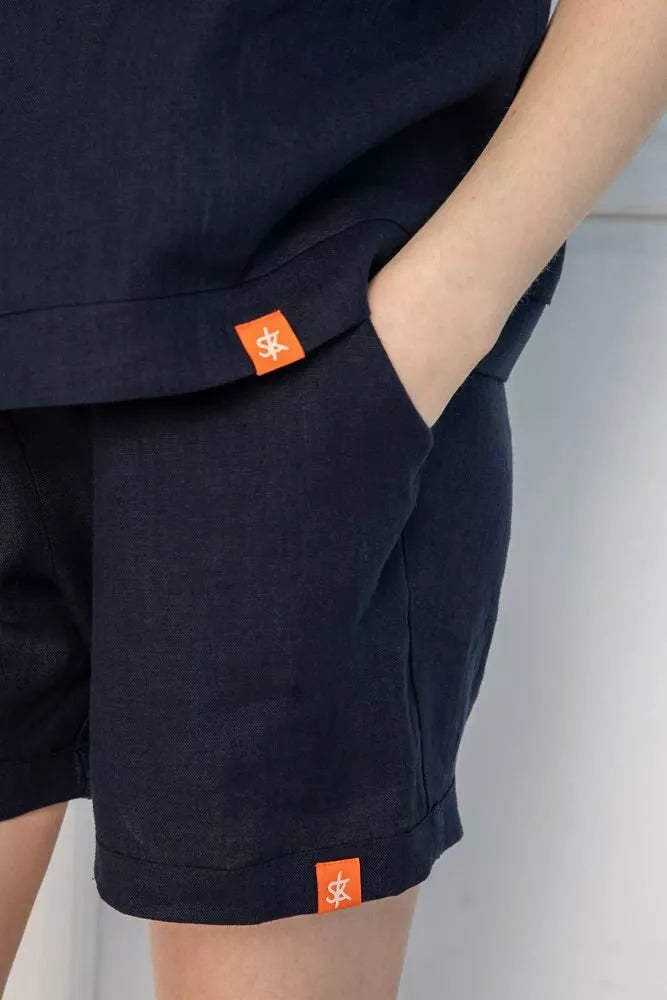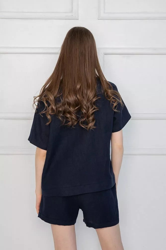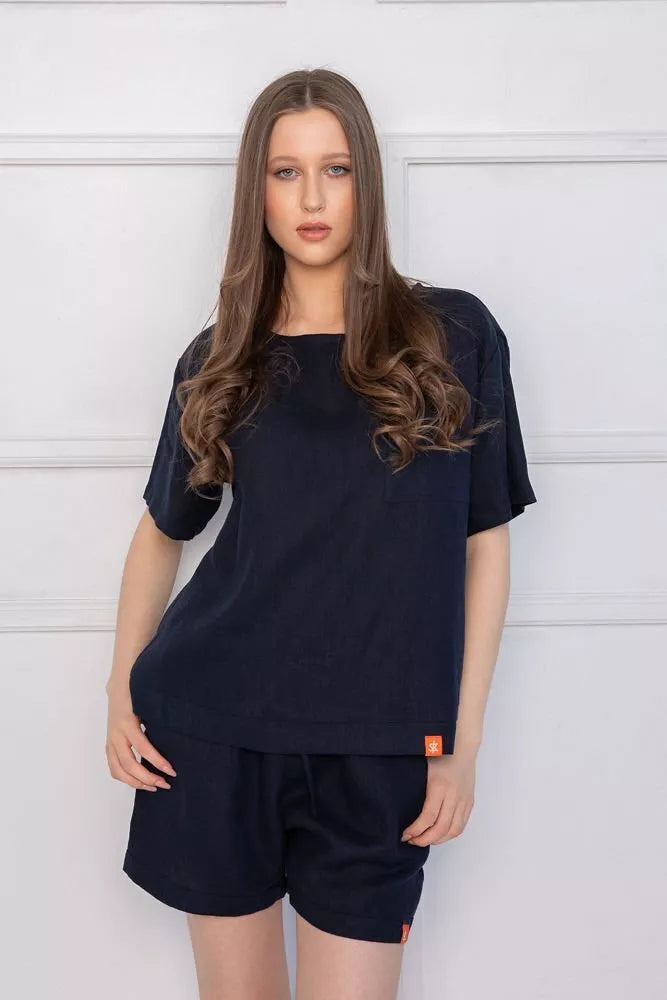 Sofa Killer tamsiai mėlynas lininis kostiumas su šortais ir marškinėliais trumpomis rankovėmis. Šortai turi kišenės priekyje. Medžiaga švelni ir jauki dėl minkštinto lino, sukuria lengvumo jausmą ir norą vilkėti kostiumą karštomis vasaros dienomis. Sofa Killer drabužių modeliai nevaržo judesių, tad puikiai tinka tiek pasyviam tiek aktyviam poilsiui, net miegui. Galite rinktis iš plačios dydžių skalės, o pats rūbas tradiciškai turi būti laisvas, tad kiek didesnis dydis puikiai tiks. Dekoruota oranžiniu Sofa Killer logotipu po kišene.