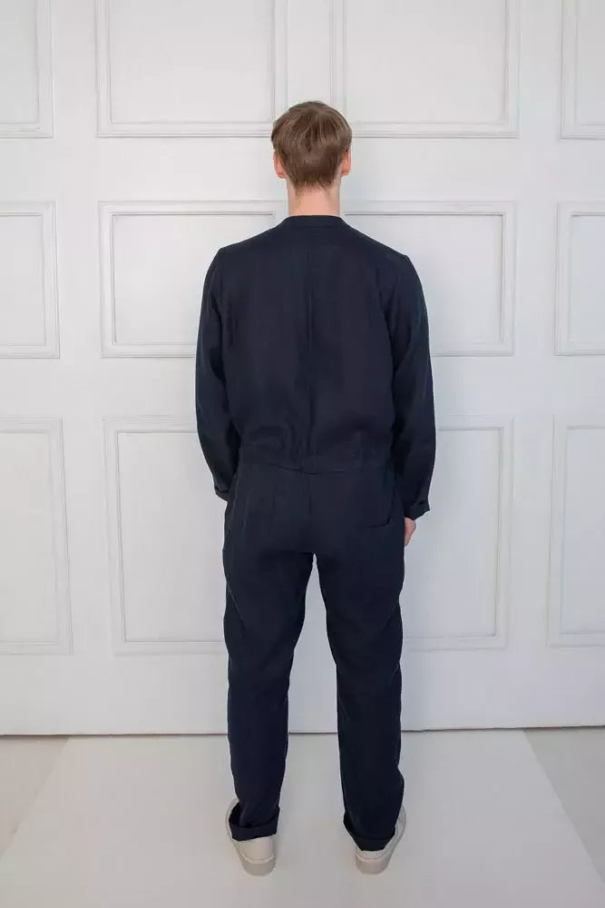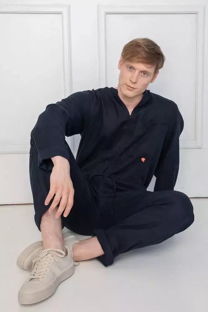 Sofa Killer tamsiai mėlynos spalvos lininis kombinezonas surišamas per juosmenį. Kišenės priekyje ir užtrauktukas iki pat kaklo, galite atsiraitoti rankoves ir klešnes. Medžiaga švelni ir jauki dėl minkštinto lino, sukuria lengvumo jausmą ir norą vilkėti kombinezoną nuolat. Sofa Killer kombinezonų modeliai nevaržo judesių, tad puikiai tinka tiek pasyviam tiek aktyviam poilsiui, net miegui. Galite rinktis iš plačios dydžių skalės, o pats rūbas tradiciškai turi būti laisvas, tad kiek didesnis dydis puikiai tiks. Dekoruota oranžiniu Sofa Killer logotipu po kišene.
