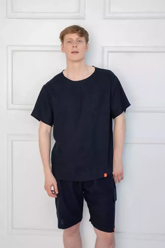 Sofa Killer tamsiai mėlynos spalvos lininis kostiumas su šortais ir marškinėliais trumpomis rankovėmis. Šortai turi kišenės priekyje. Medžiaga švelni ir jauki dėl minkštinto lino, sukuria lengvumo jausmą ir norą vilkėti kostiumą karštomis vasaros dienomis. Sofa Killer drabužių modeliai nevaržo judesių, tad puikiai tinka tiek pasyviam tiek aktyviam poilsiui, net miegui. Galite rinktis iš plačios dydžių skalės, o pats rūbas tradiciškai turi būti laisvas, tad kiek didesnis dydis puikiai tiks. Dekoruota oranžiniu Sofa Killer logotipu po kišene.