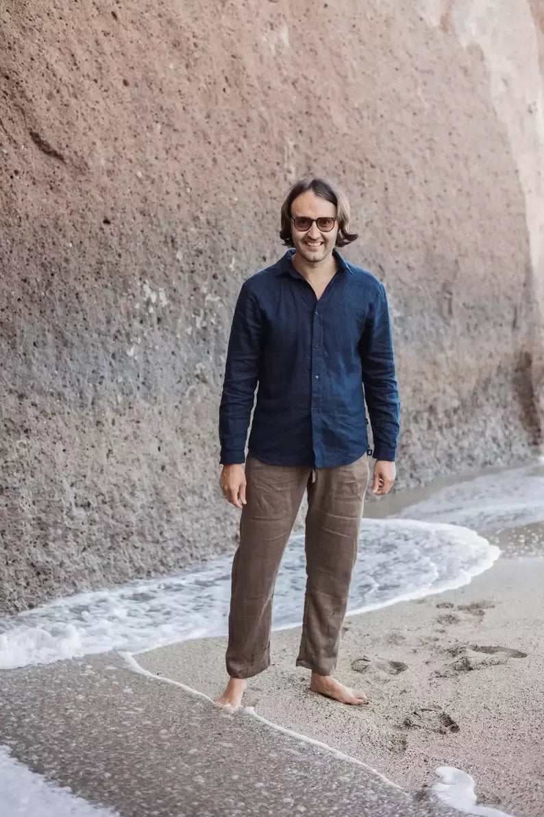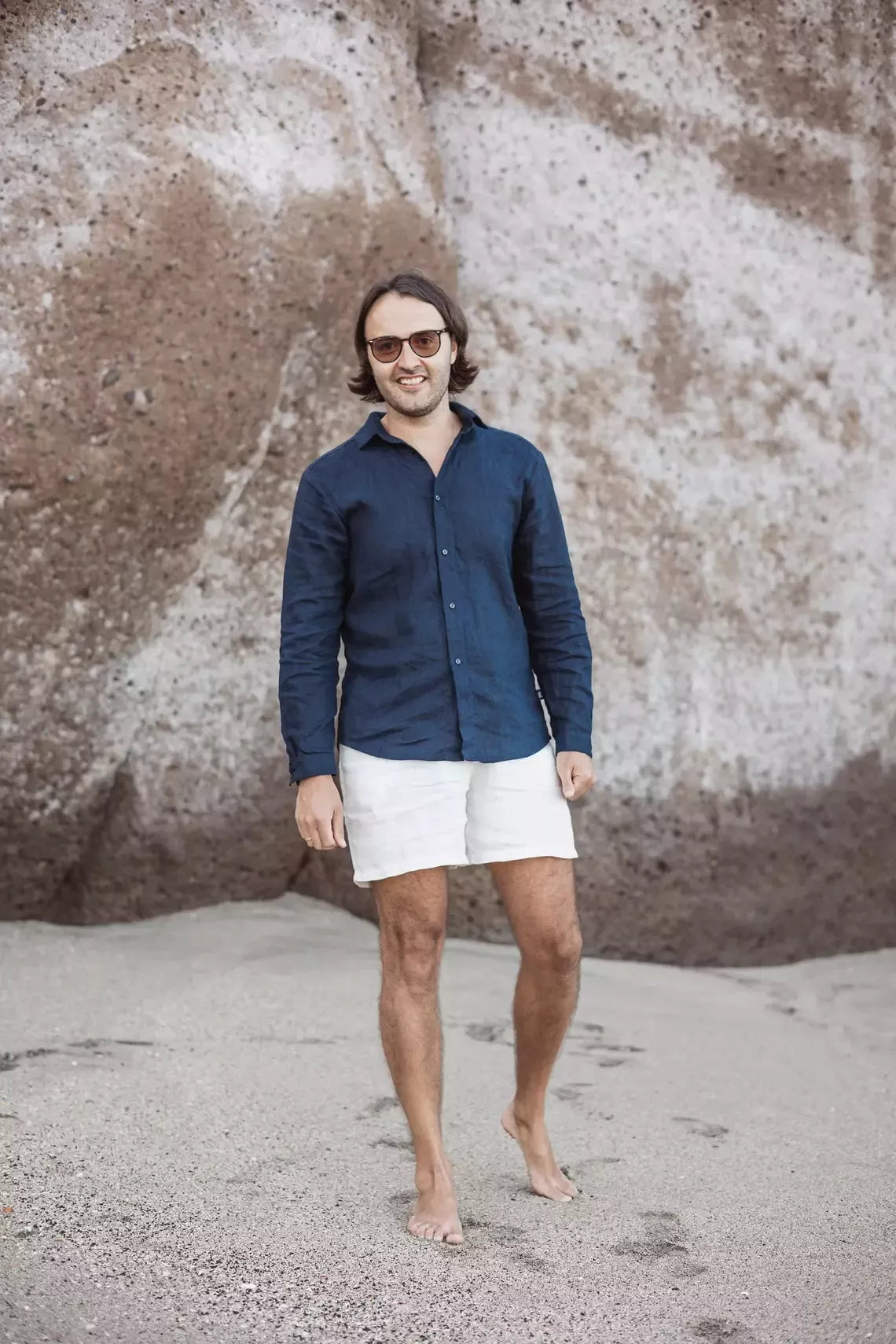Sofa Killer tamsiai mėlynos splavos lininiai vyriški marškiniai, susegami priekyje, klasikine apykakle, galite atsiraitoti rankoves. Minkštinto lino medžiaga švelni ir jauki, sukuria įpatingą lengvumo jausmą ir norą vilkėti marškinius nuolat. Sofa Killer vyriški lininiai marškiniai nevaržo judesių, tad puikiai tinka patogiam poilsiui ar šventei. Dekoruota Sofa Killer logotipu šone.