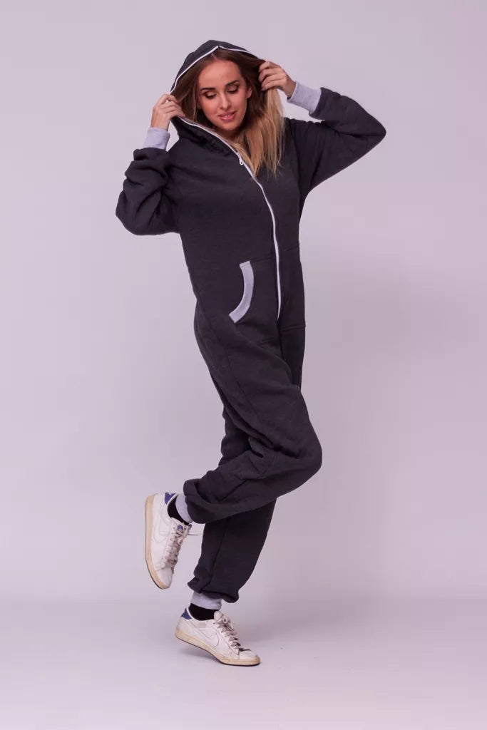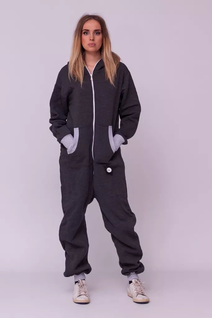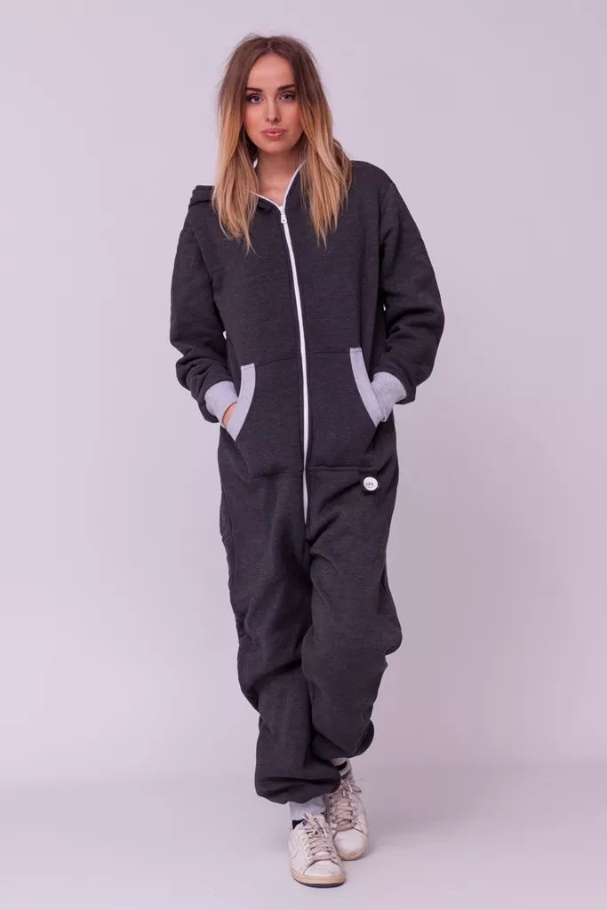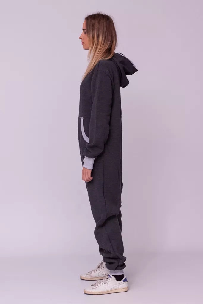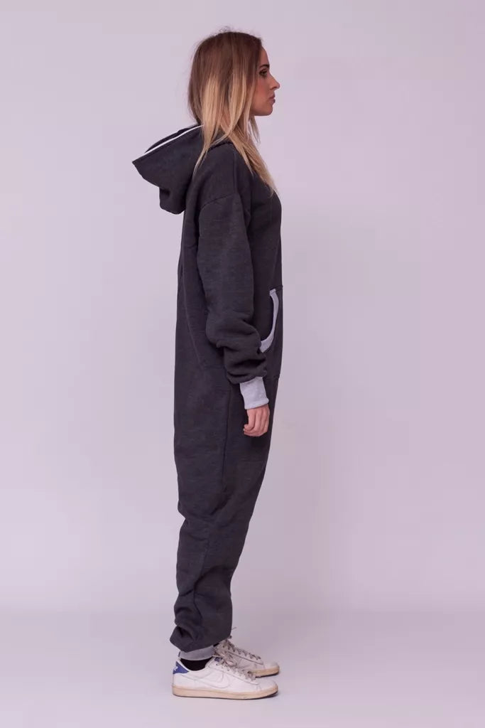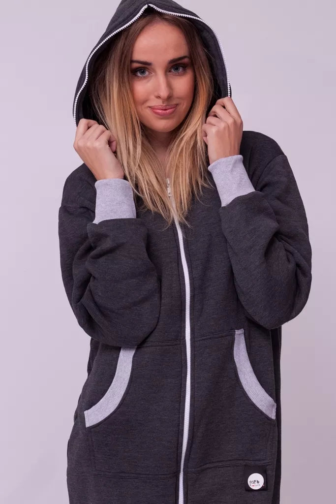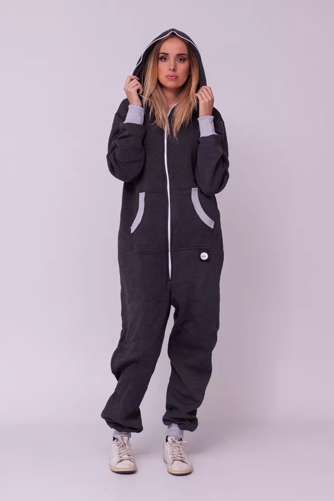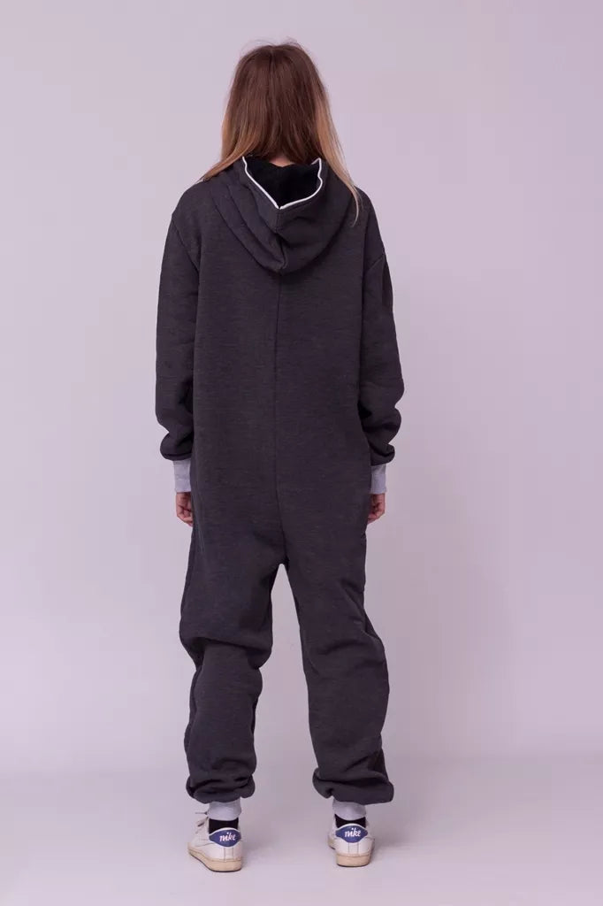 Šiltas jaukus tamsiai pilkas (melandžo) kombinezonas su pilkais rankogaliais, skirtas tiek vyrams tiek moterims. Priekyje kišenės apsiūtos pilka rankogalių medžiaga. Medžiagos vidinė dalis su tankiu pūkeliu, kuris sukuria įpatingą šilumos jausmą ir norą vilkėti kombinezoną nuolat. Sofa Killer kombinezonų modeliai nevaržo judesių, tad puikiai tinka tiek pasyviam tiek aktyviam poilsiui, net miegui. Galite rinktis iš plačios dydžių skalės, o pats rūbas tradiciškai turi būti laisvas, tad kiek didesnis dydis puikiai tiks. Dekoruota Sofa Killer logotipu po kišene.