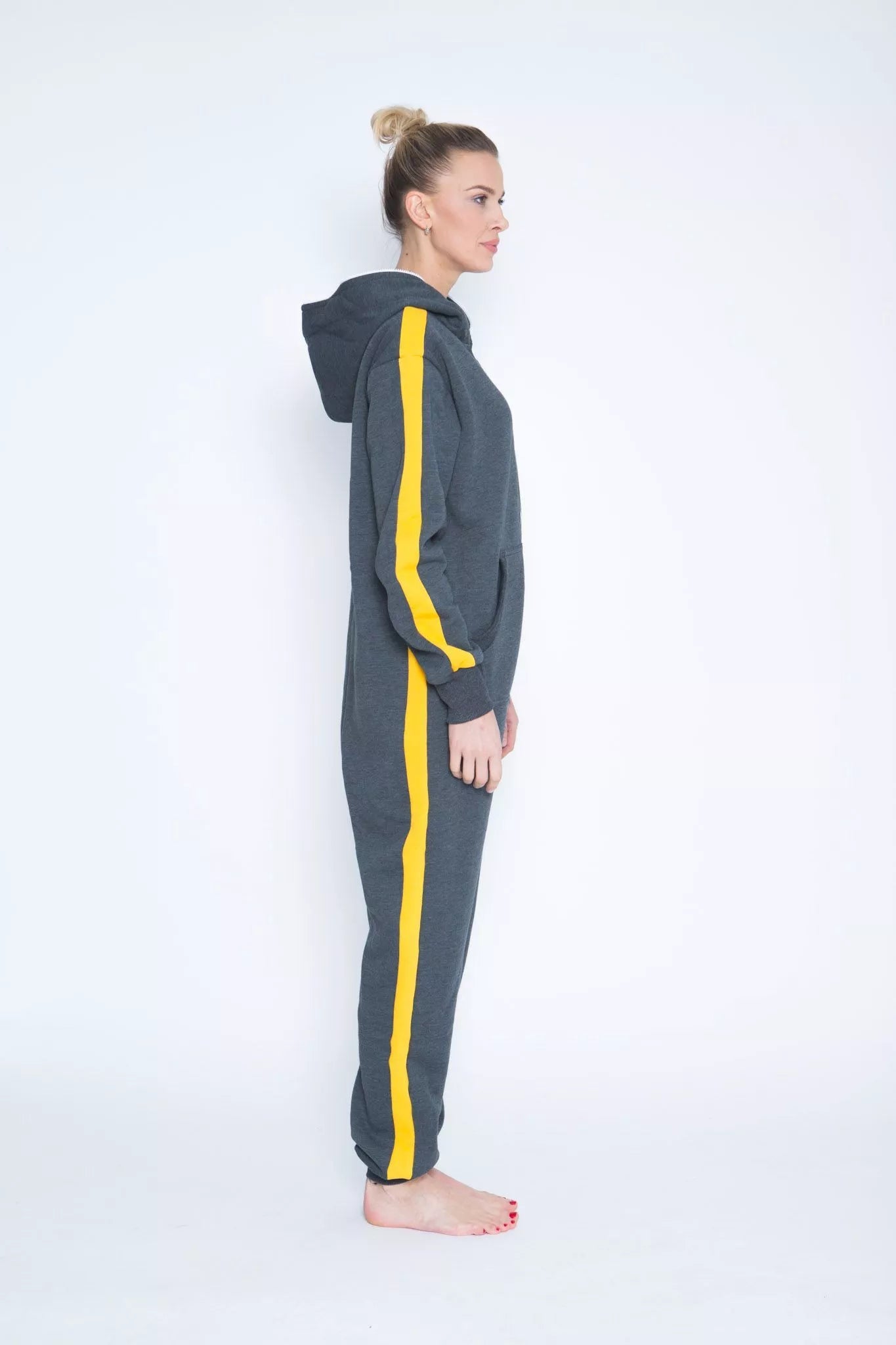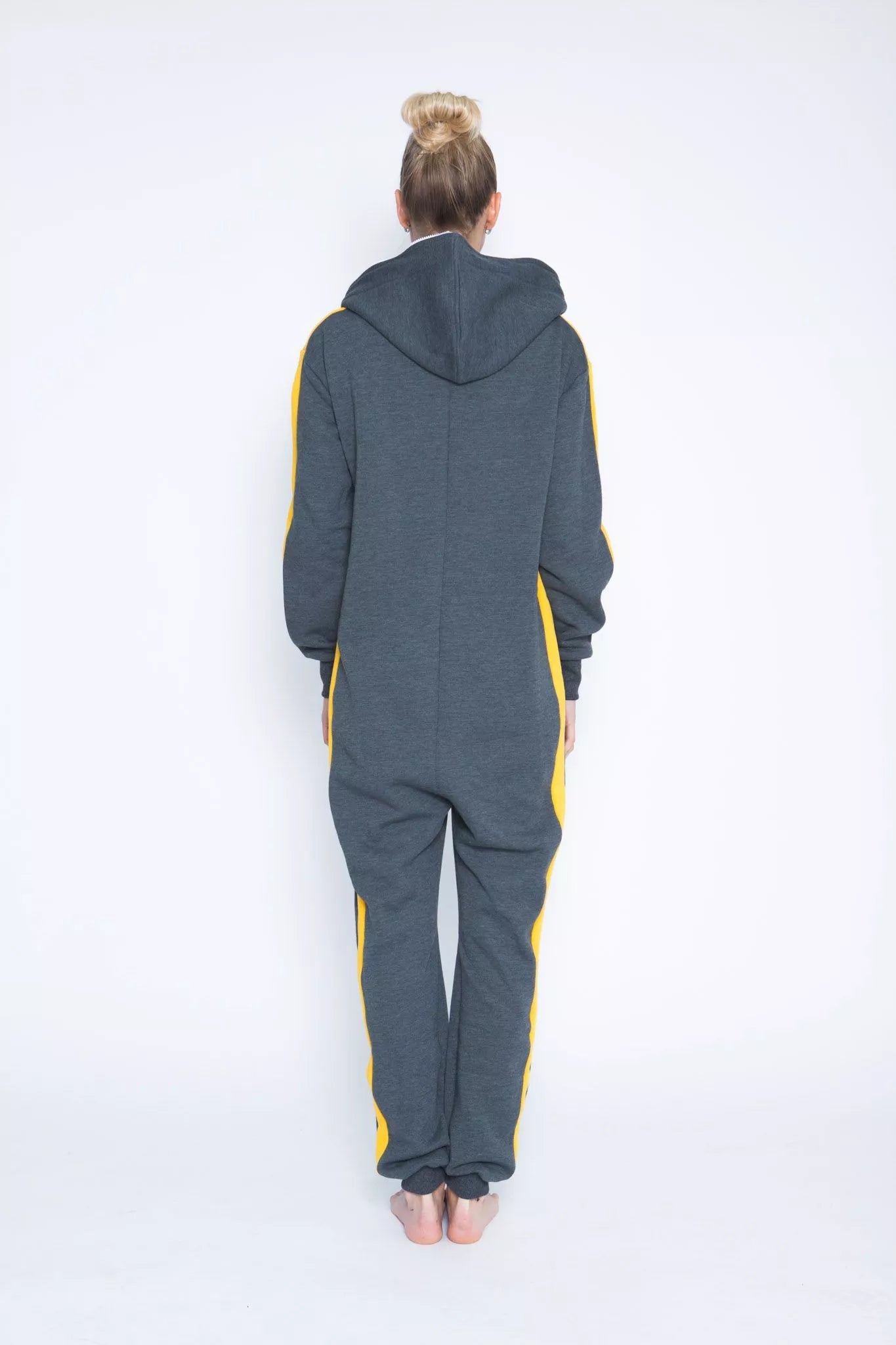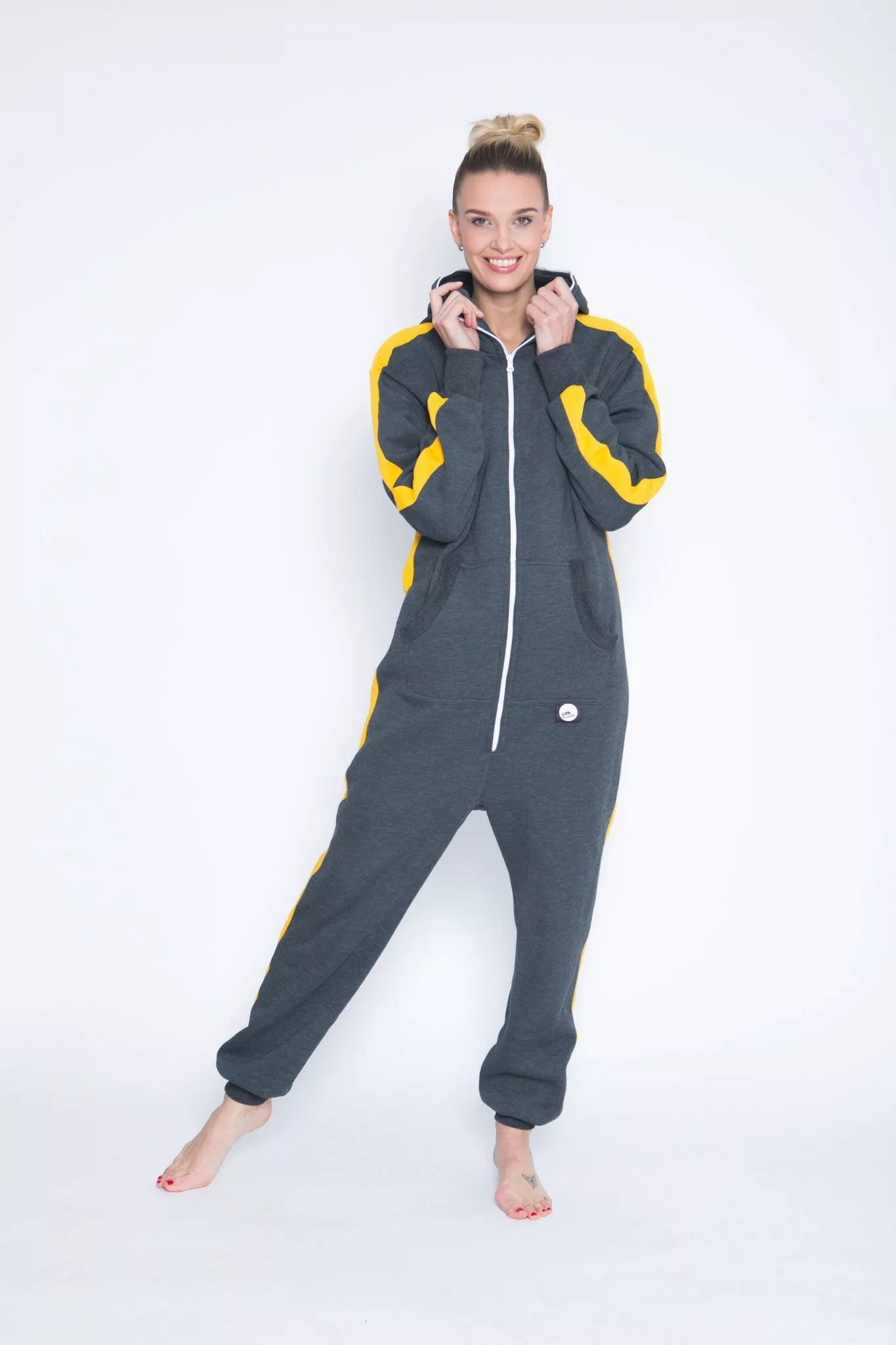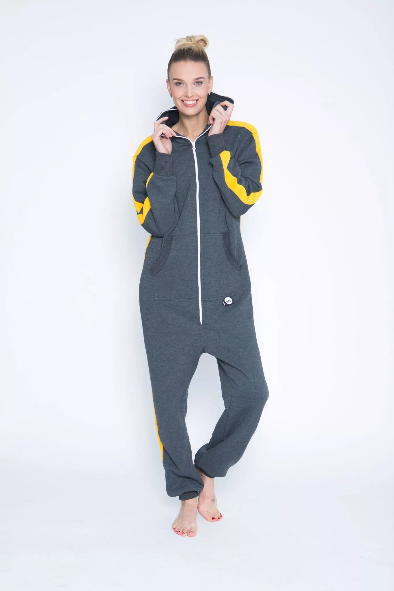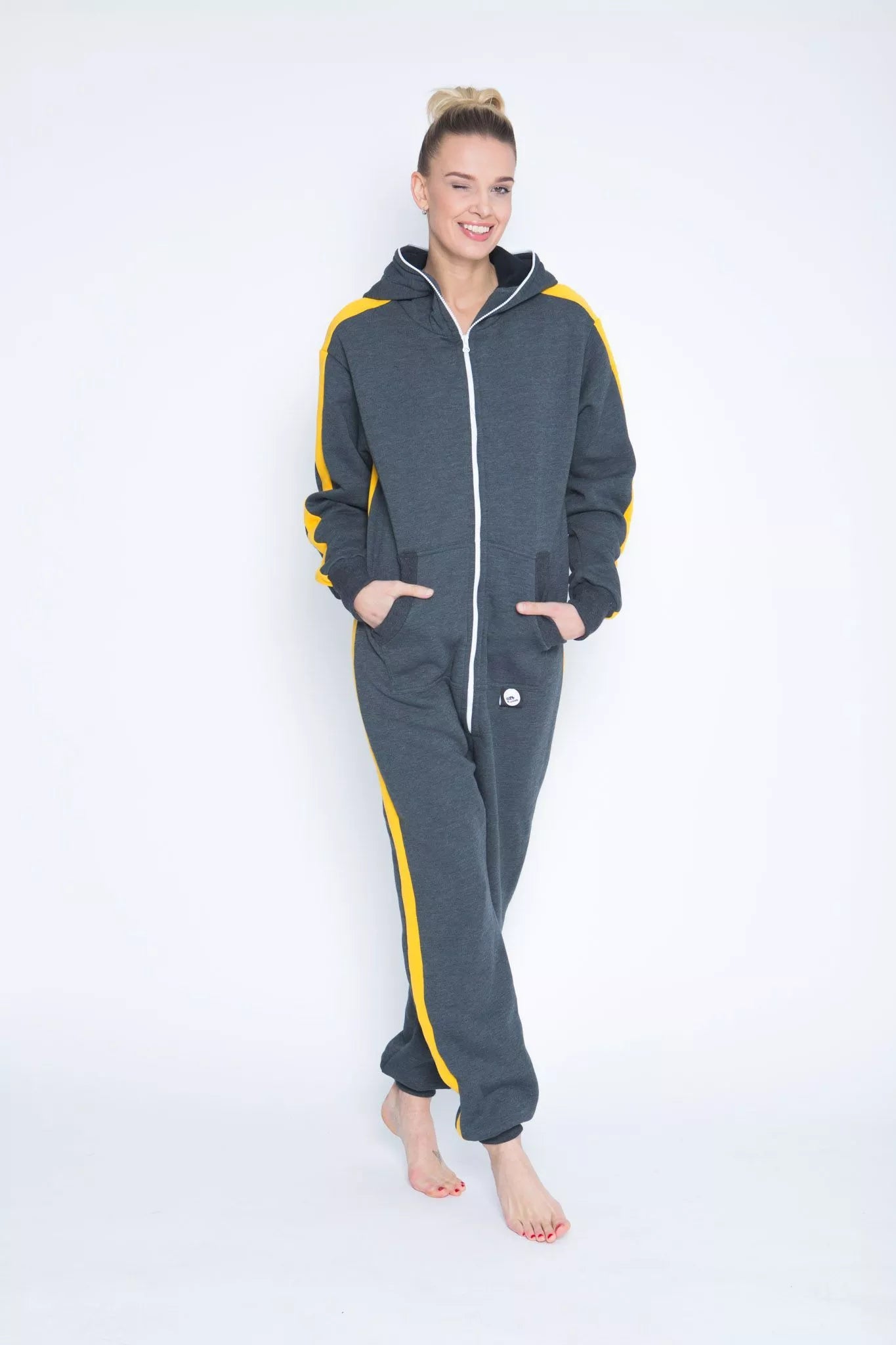 Šiltas jaukus Sofa Killer tamsiai pilkas kombinezonas su geltonom vertikaliom juostom, skirtas tiek vyrams tiek moterims. Priekyje kišenės apsiūtos rankogalių medžiaga. Medžiagos vidinė dalis su tankiu pūkeliu, kuris sukuria įpatingą šilumos jausmą ir norą vilkėti kombinezoną nuolat. Sofa Killer kombinezonų modeliai nevaržo judesių, tad puikiai tinka tiek pasyviam tiek aktyviam poilsiui, net miegui. Galite rinktis iš plačios dydžių skalės, o pats rūbas tradiciškai turi būti laisvas, tad kiek didesnis dydis puikiai tiks. Dekoruota Sofa Killer logotipu po kišene.