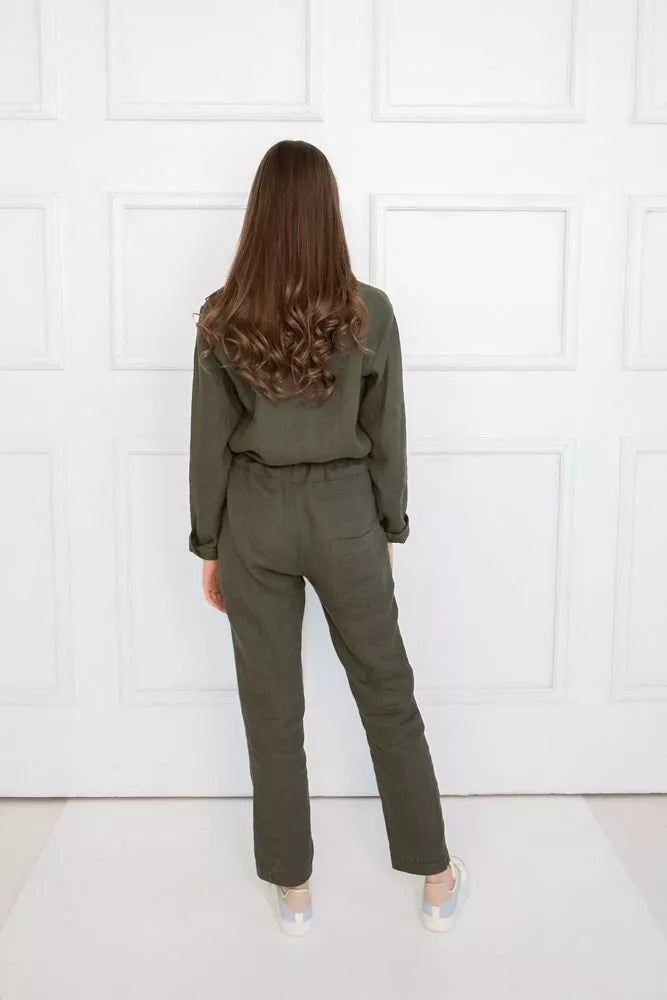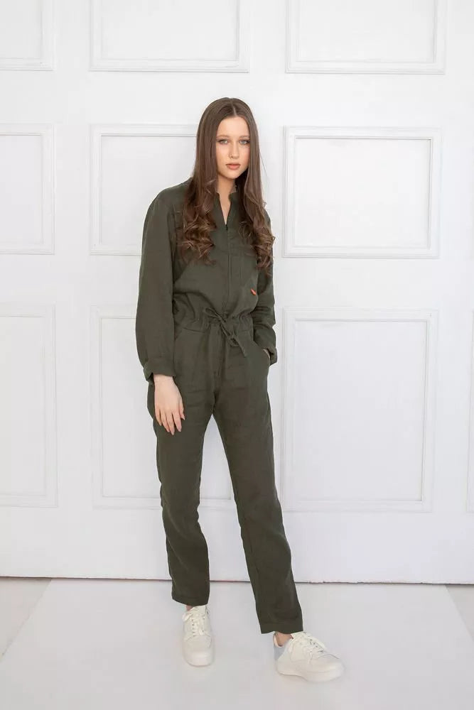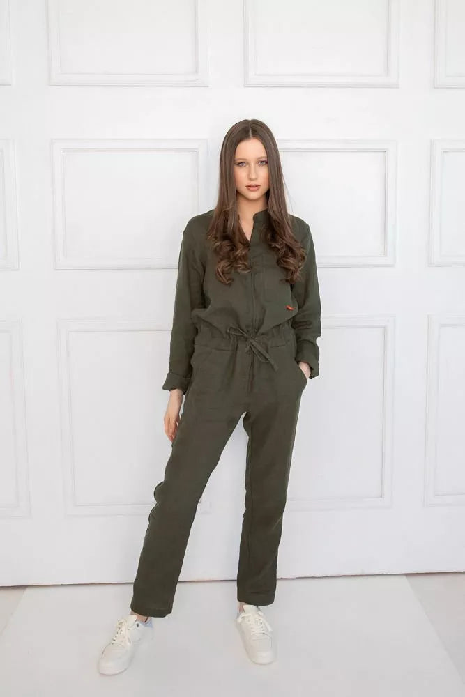 Sofa Killer tamsiai žalias lininis kombinezonas surišamas per juosmenį. Kišenės priekyje ir užtrauktukas iki pat kaklo, galite atsiraitoti rankoves ir klešnes. Medžiaga švelni ir jauki dėl minkštinto lino, sukuria lengvumo jausmą ir norą vilkėti kombinezoną nuolat. Sofa Killer kombinezonų modeliai nevaržo judesių, tad puikiai tinka tiek pasyviam tiek aktyviam poilsiui, net miegui. Galite rinktis iš plačios dydžių skalės, o pats rūbas tradiciškai turi būti laisvas, tad kiek didesnis dydis puikiai tiks. Dekoruota oranžiniu Sofa Killer logotipu po kišene.