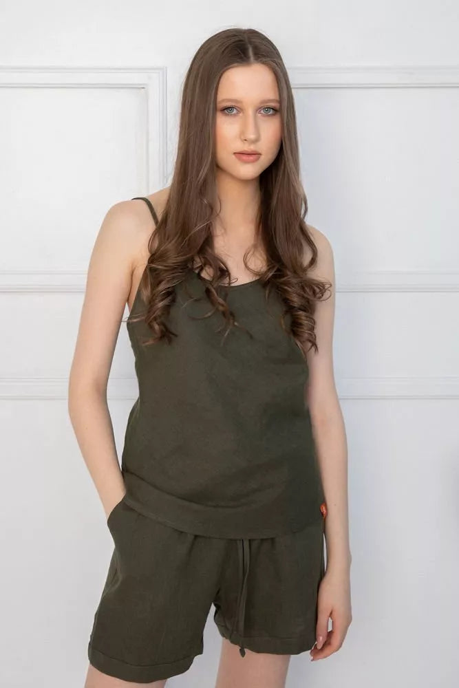 Sofa Killer tamsiai žalias lininis kostiumas su šortais ir marškinėliais trumpomis rankovėmis. Šortai turi kišenės priekyje. Medžiaga švelni ir jauki dėl minkštinto lino, sukuria lengvumo jausmą ir norą vilkėti kostiumą karštomis vasaros dienomis. Sofa Killer drabužių modeliai nevaržo judesių, tad puikiai tinka tiek pasyviam tiek aktyviam poilsiui, net miegui. Galite rinktis iš plačios dydžių skalės, o pats rūbas tradiciškai turi būti laisvas, tad kiek didesnis dydis puikiai tiks. Dekoruota oranžiniu Sofa Killer logotipu po kišene.