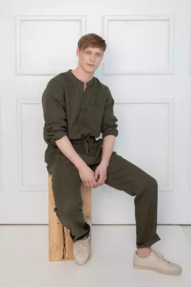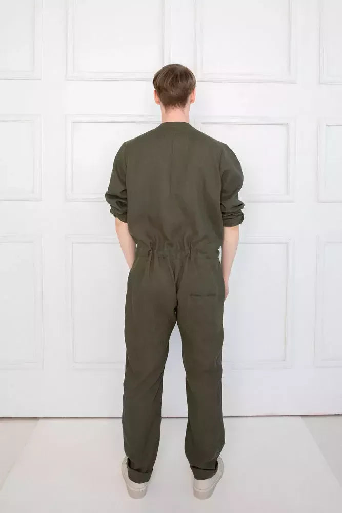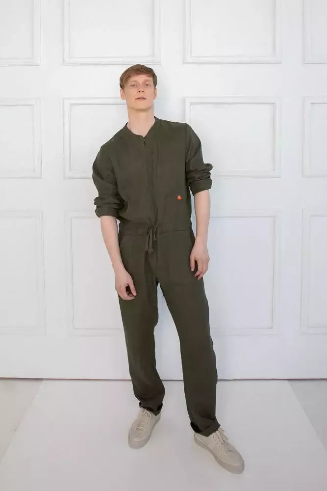 Sofa Killer tamsiai žalios spalvos lininis kombinezonas surišamas per juosmenį. Kišenės priekyje ir užtrauktukas iki pat kaklo, galite atsiraitoti rankoves ir klešnes. Medžiaga švelni ir jauki dėl minkštinto lino, sukuria lengvumo jausmą ir norą vilkėti kombinezoną nuolat. Sofa Killer kombinezonų modeliai nevaržo judesių, tad puikiai tinka tiek pasyviam tiek aktyviam poilsiui, net miegui. Galite rinktis iš plačios dydžių skalės, o pats rūbas tradiciškai turi būti laisvas, tad kiek didesnis dydis puikiai tiks. Dekoruota oranžiniu Sofa Killer logotipu po kišene.