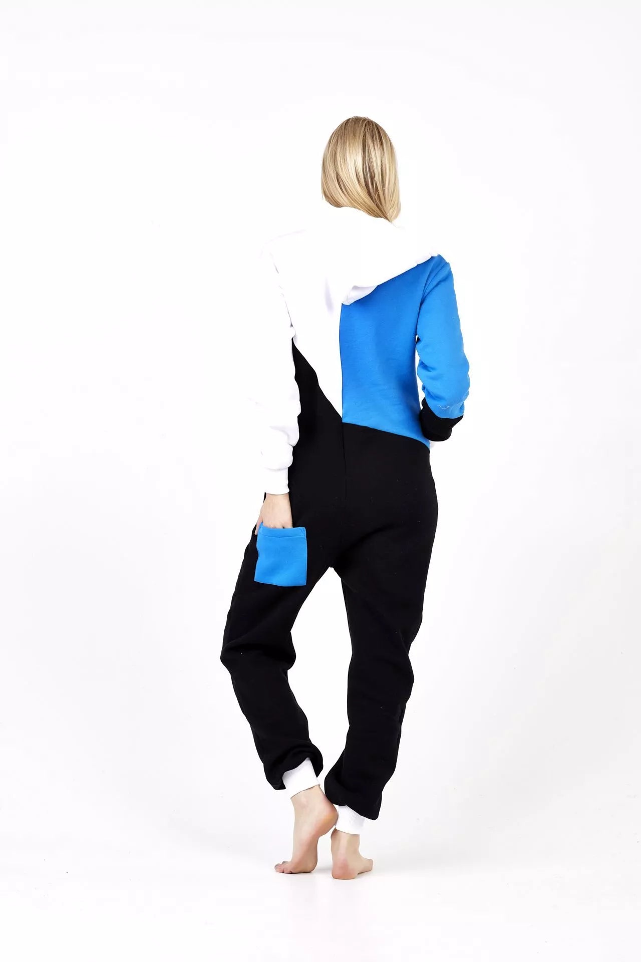 Šiltas trispalvis juodos, mėlynos ir baltos spalvos kombinezonas EESTI, skirtas tiek vyrams tiek moterims. Kišenės priekyje ir viena nugaroje. Medžiagos vidinė dalis su tankiu pūkeliu, kuris sukuria įpatingą šilumos jausmą ir norą vilkėti kombinezoną nuolat. Sofa Killer kombinezonų modeliai nevaržo judesių, tad puikiai tinka tiek pasyviam tiek aktyviam poilsiui, net miegui. Galite rinktis iš plačios dydžių skalės, o pats rūbas tradiciškai turi būti laisvas, tad kiek didesnis dydis puikiai tiks. Dekoruotas Sofa KIller logotipu išsiuvinėtu ant krūtinės.