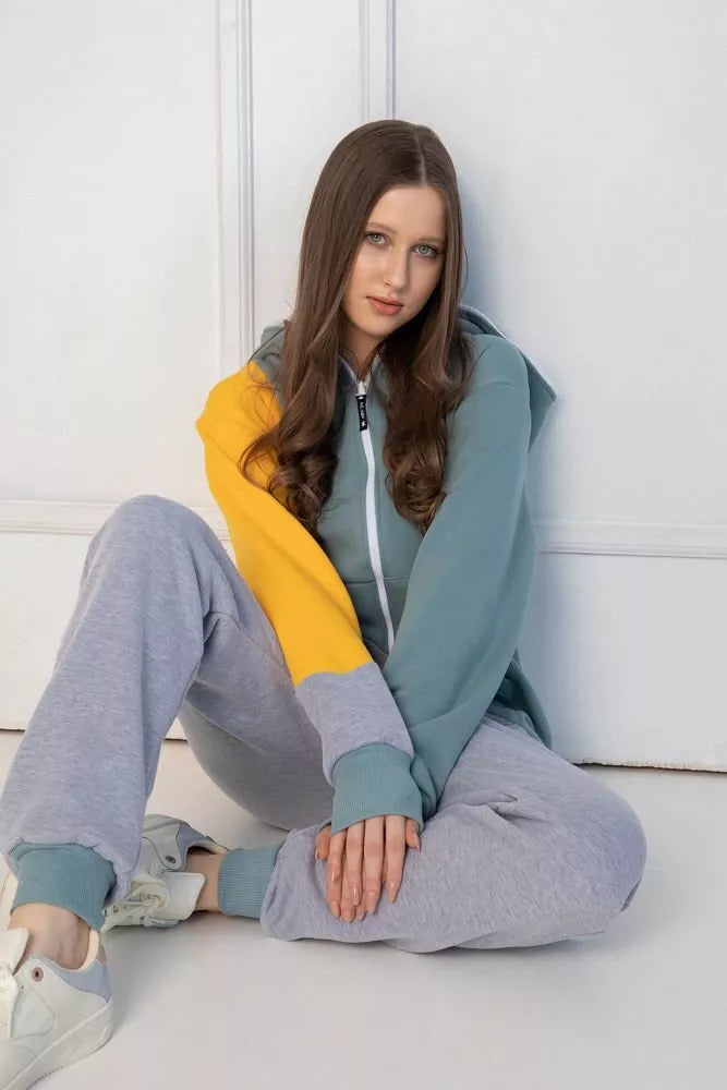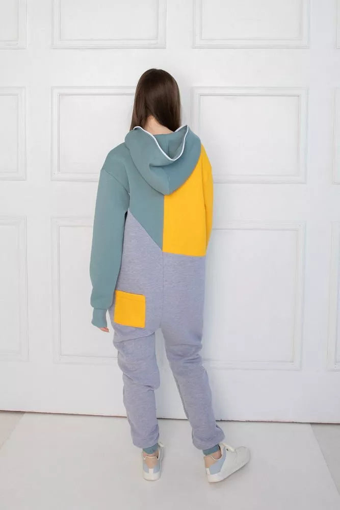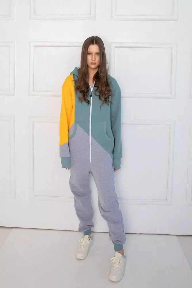 Šiltas trispalvis kombinezonas iš geltonos, melsvos ir šviesiai pilkos spalvos, skirtas tiek vyrams tiek moterims. Kišenės priekyje ir viena nugaroje. Medžiagos vidinė dalis su tankiu pūkeliu, kuris sukuria įpatingą šilumos jausmą ir norą vilkėti kombinezoną nuolat. Sofa Killer kombinezonų modeliai nevaržo judesių, tad puikiai tinka tiek pasyviam tiek aktyviam poilsiui, net miegui. Galite rinktis iš plačios dydžių skalės, o pats rūbas tradiciškai turi būti laisvas, tad kiek didesnis dydis puikiai tiks. Dekoruota Sofa Killer logotipu po kišene priekyje.
