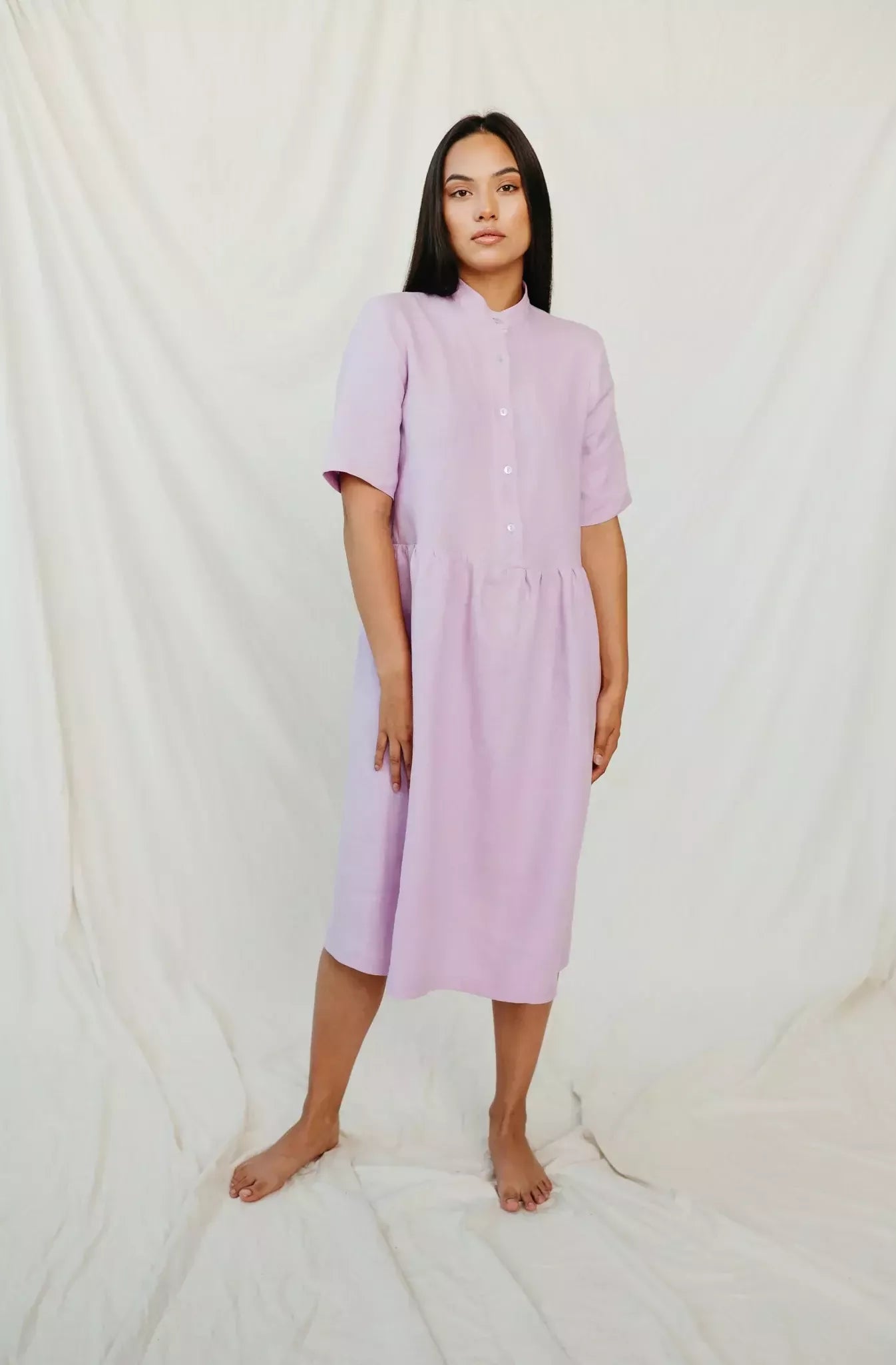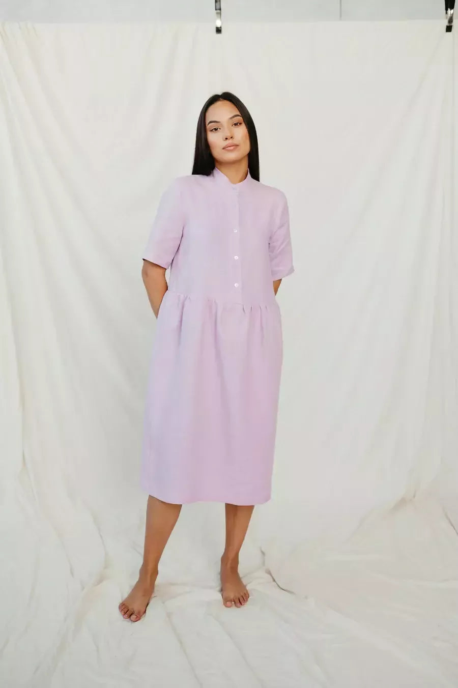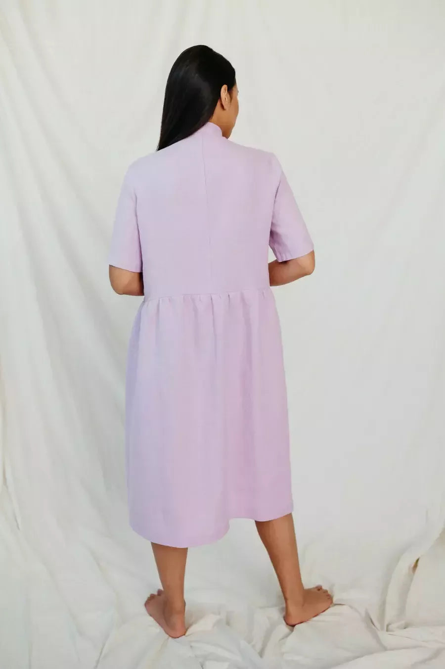 Suknelė pasiūta iš natūralaus neperregimo minkštinto švelnaus alyvinės spalvos lino, storis 220 g/m2, lengvai skalbiasi ir nėra linkęs glamžytis. Suknelė trumpomis rankovėmis, susegama viršutinė dalis, ties liemeniu nedaug paraukta ir klostuota, lengva ir vasariška. Sudėtis 100% linas. Gamintojas SofaKiller, pagaminta Lietuvoje. Esant klausimam ar individualaus užsakymo poreikiui prašome susisiekti.