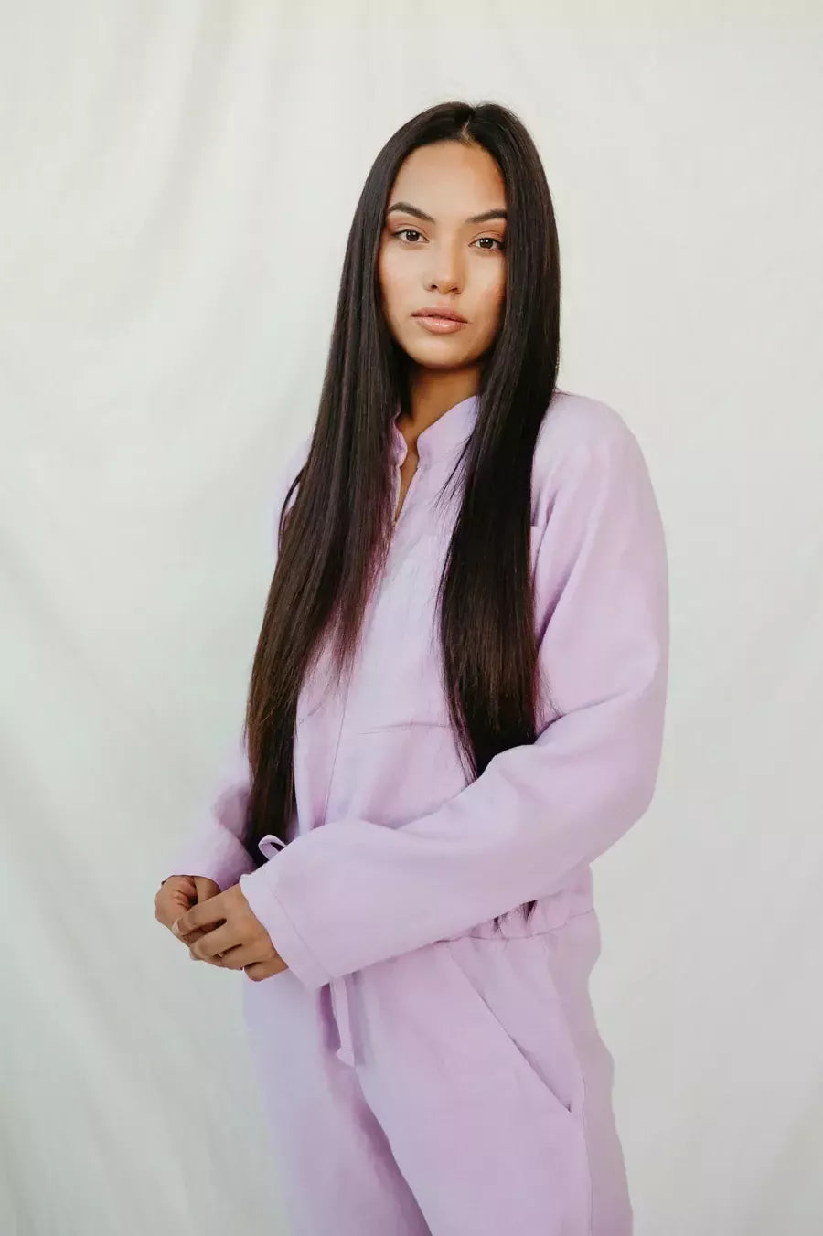 Sofa Killer violetines spalvos lininis kombinezonas surišamas per juosmenį. Kišenės priekyje ir užtrauktuku iki pat kaklo, galite atsiraitoti rankoves ir klešnes. Medžiaga švelni ir jauki dėl minkštinto lino, sukuria lengvumo jausmą ir norą vilkėti kombinezoną nuolat. Sofa Killer kombinezonų modeliai nevaržo judesių, tad puikiai tinka tiek pasyviam tiek aktyviam poilsiui, net miegui. Galite rinktis iš plačios dydžių skalės, o pats rūbas tradiciškai turi būti laisvas, tad kiek didesnis dydis puikiai tiks. Dekoruota oranžiniu Sofa Killer logotipu po kišene.